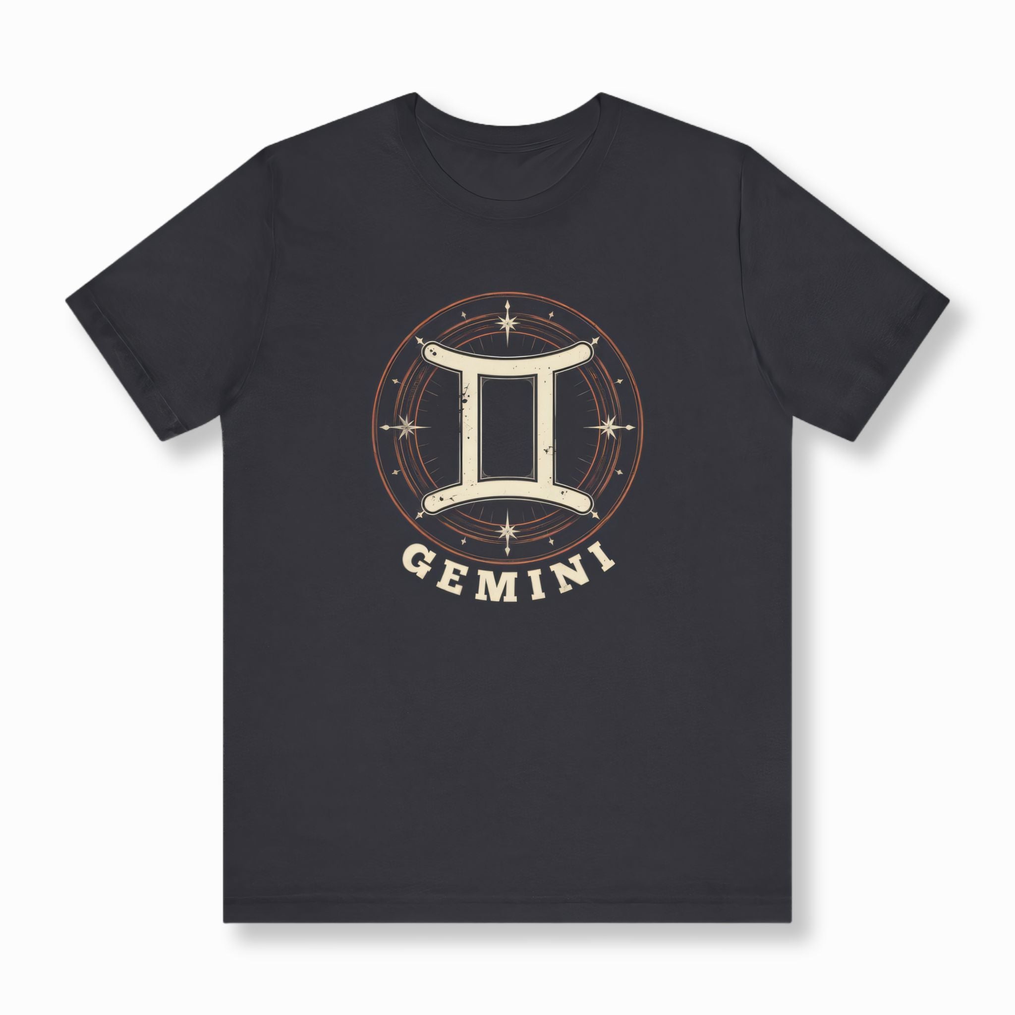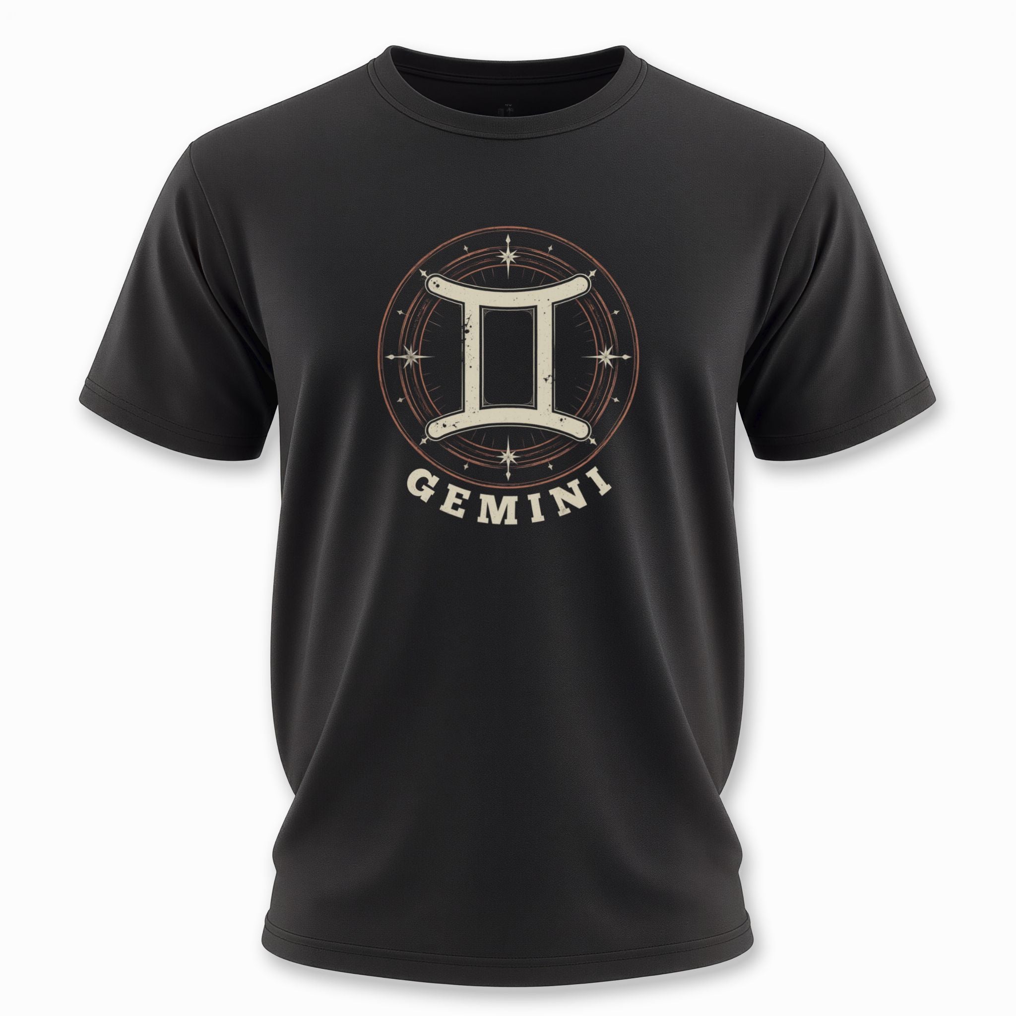 This t-shirt features a vintage-style graphic of the Gemini zodiac symbol, set within a decorative circle of celestial stars and rays. The design evokes a sense of astrological intrigue and timeless cosmic connection. The Gemini twins symbol is known to represent duality, adaptability, and communication, evoking a sense of curiosity and intellectual energy. Its intricate details make it a conversation starter, a minimalist yet powerful statement piece for any wardrobe.