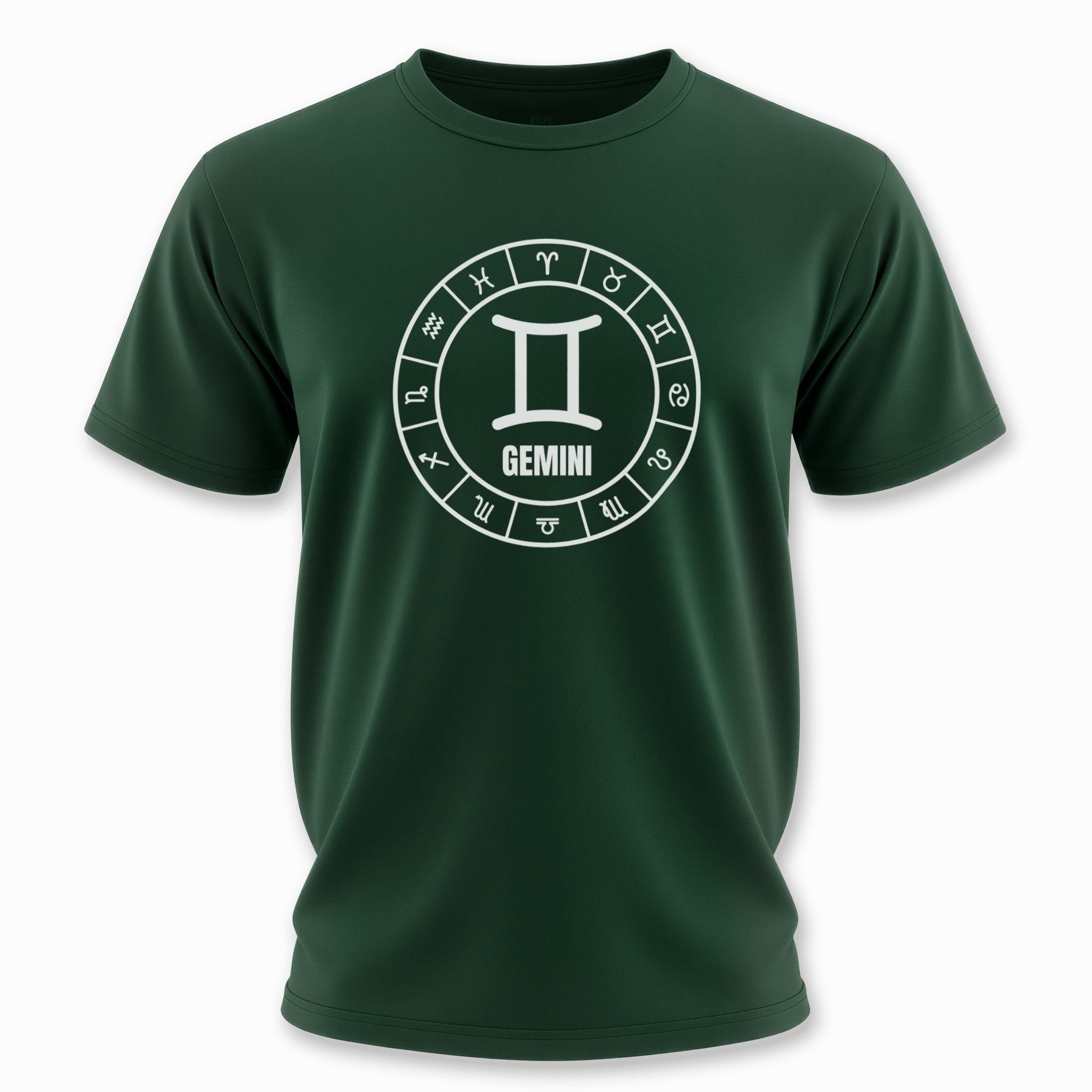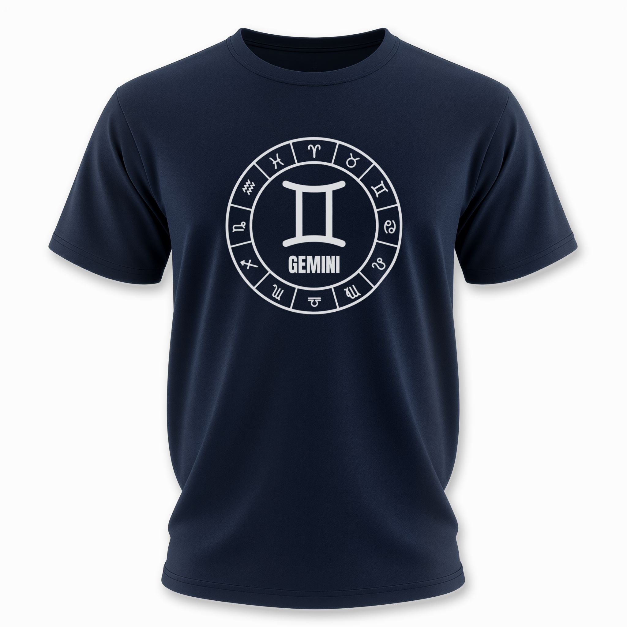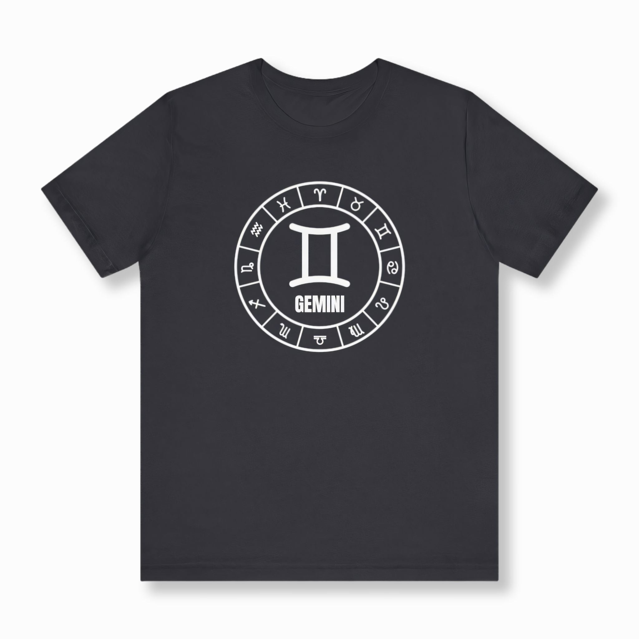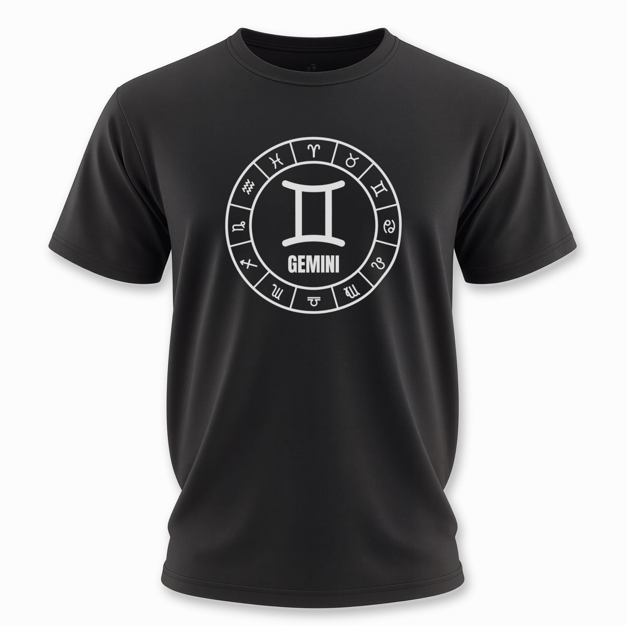 This t-shirt features a striking white graphic on a classic black background, centered around the iconic Gemini zodiac symbol. The central symbol is elegantly encircled by a full wheel of all twelve astrological signs, each precisely segmented to form a complete cosmic representation. Below the prominent Gemini symbol, the name "GEMINI" is clearly displayed. This intricate design beautifully celebrates the communicative, adaptable, and intellectual nature of the Gemini sign, while the surrounding zodiac wheel emphasizes the broader interconnectedness of the celestial realm. It's a bold and meaningful statement piece for anyone who embraces their astrological identity or appreciates cosmic symbolism.