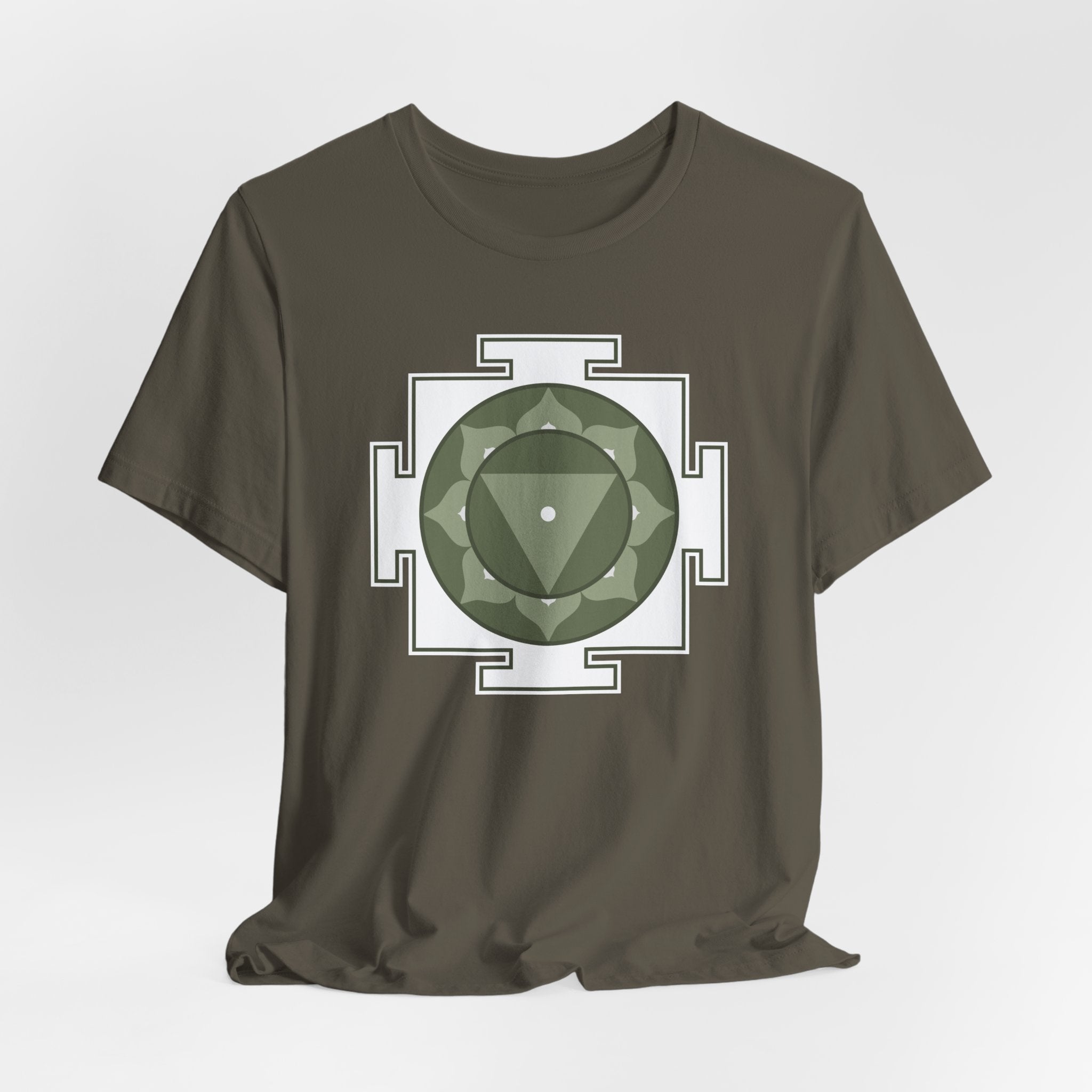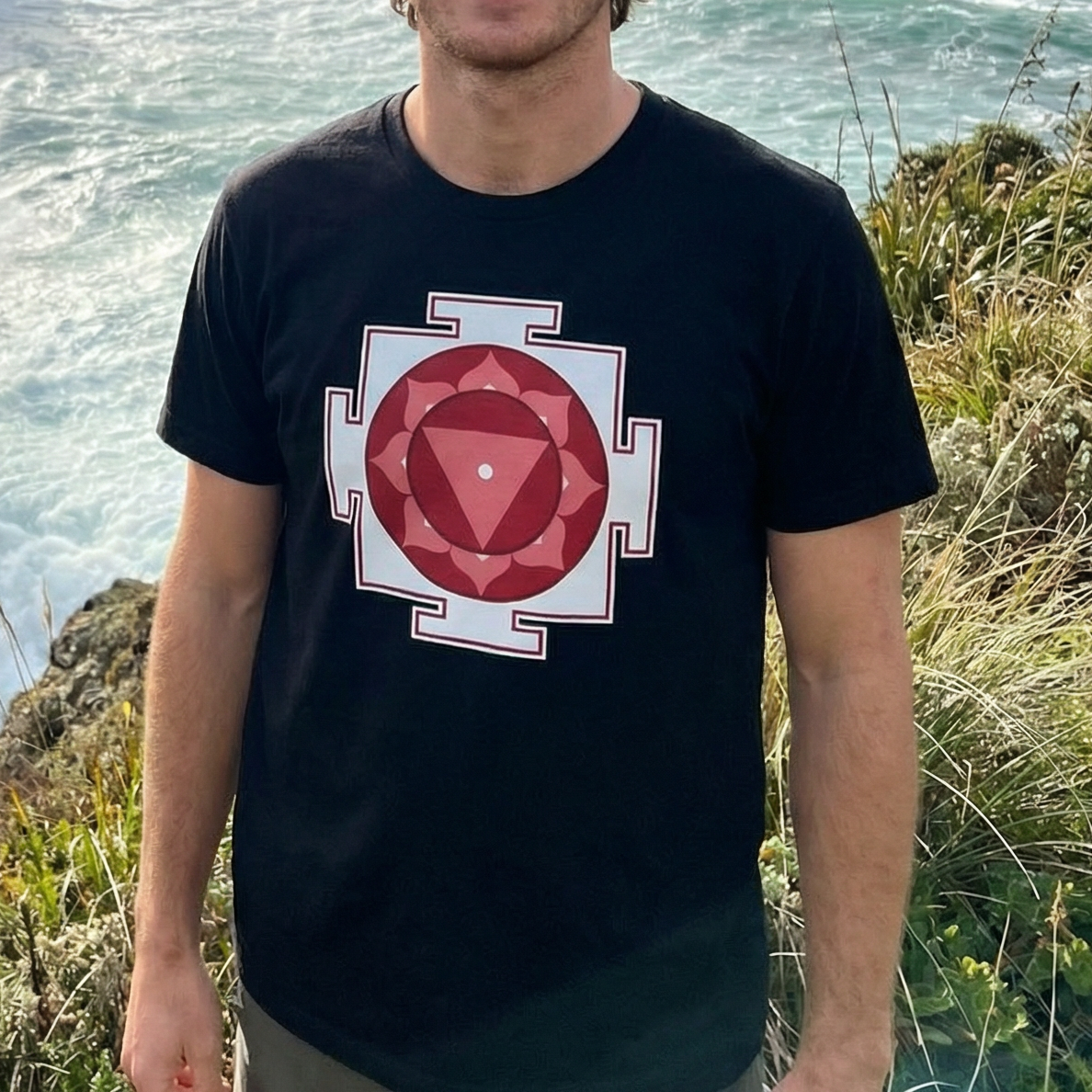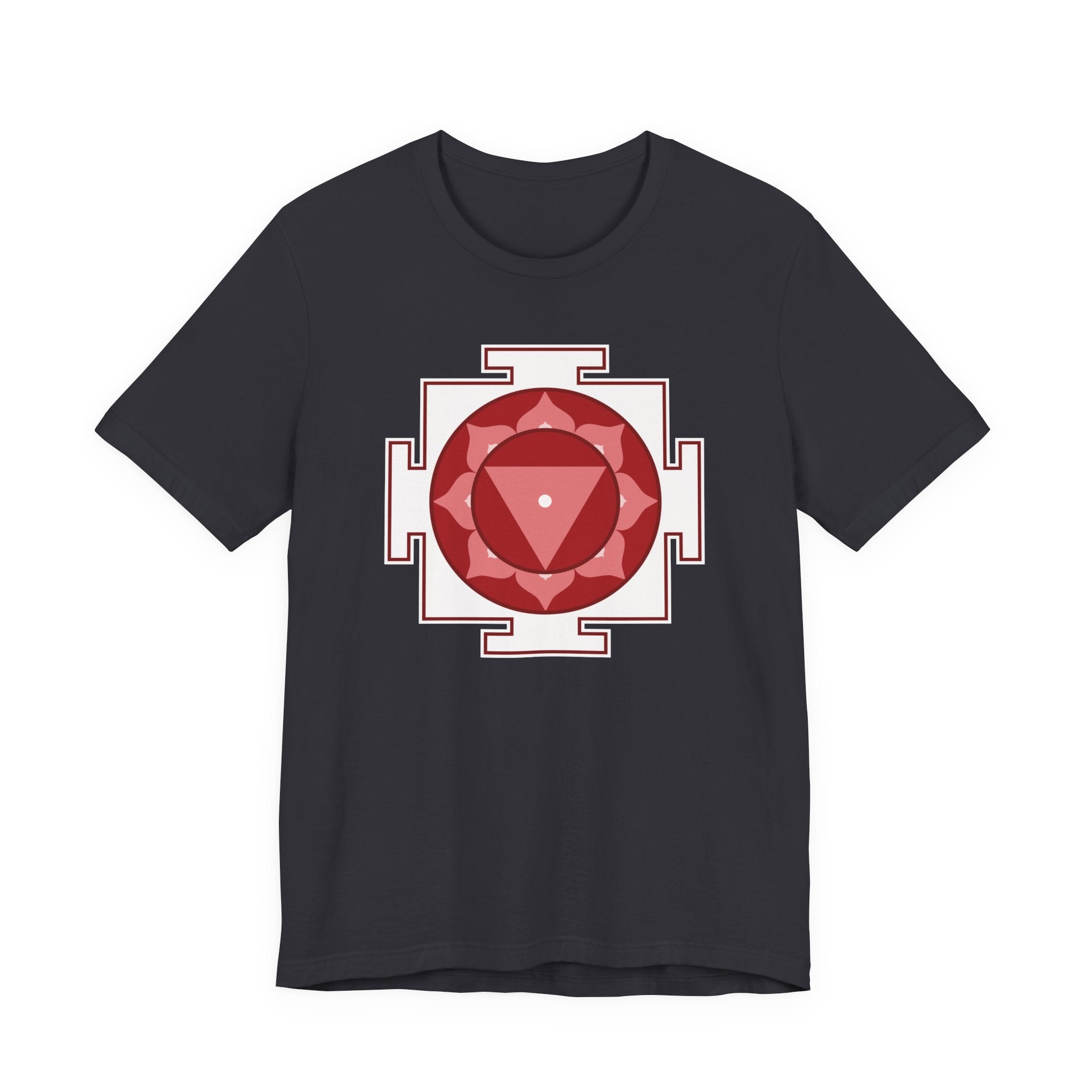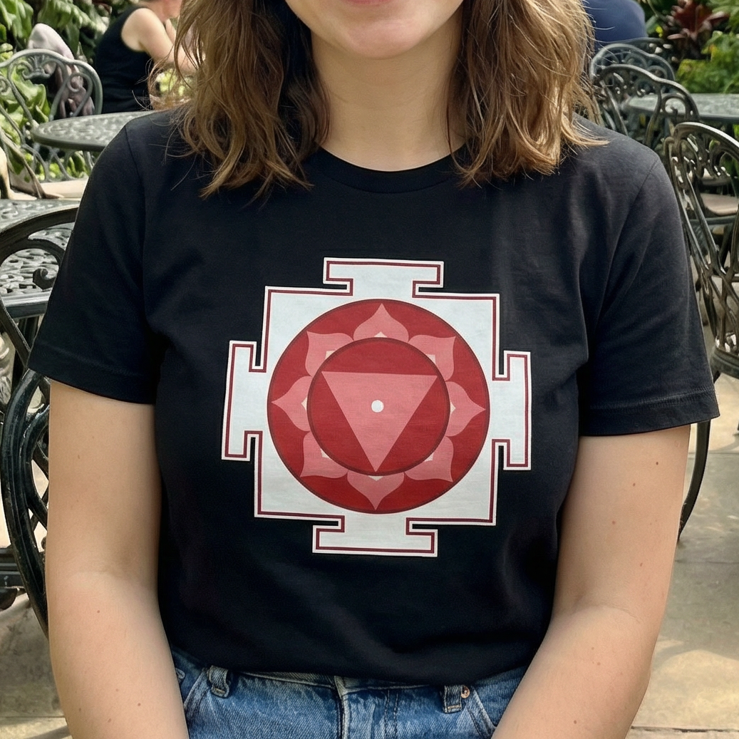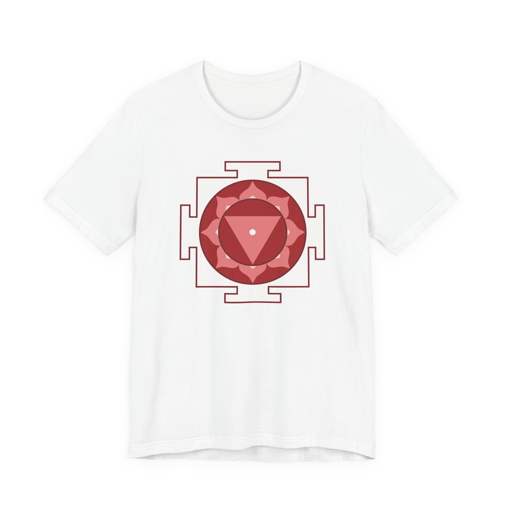 This t-shirt features a striking geometric Yantra design, rendered in shades of red and white. Yantras are ancient mystical diagrams used in spiritual traditions for meditation, protection, and focusing divine energy. This particular design, with its central inverted triangle, surrounding lotus petals, and foundational square, embodies principles of divine feminine energy, spiritual grounding, and cosmic harmony. It's a powerful symbol of sacred geometry, perfect for those drawn to spiritual wisdom and meaningful art. The design is both intricate and harmonious, making it a unique statement piece for any wardrobe.