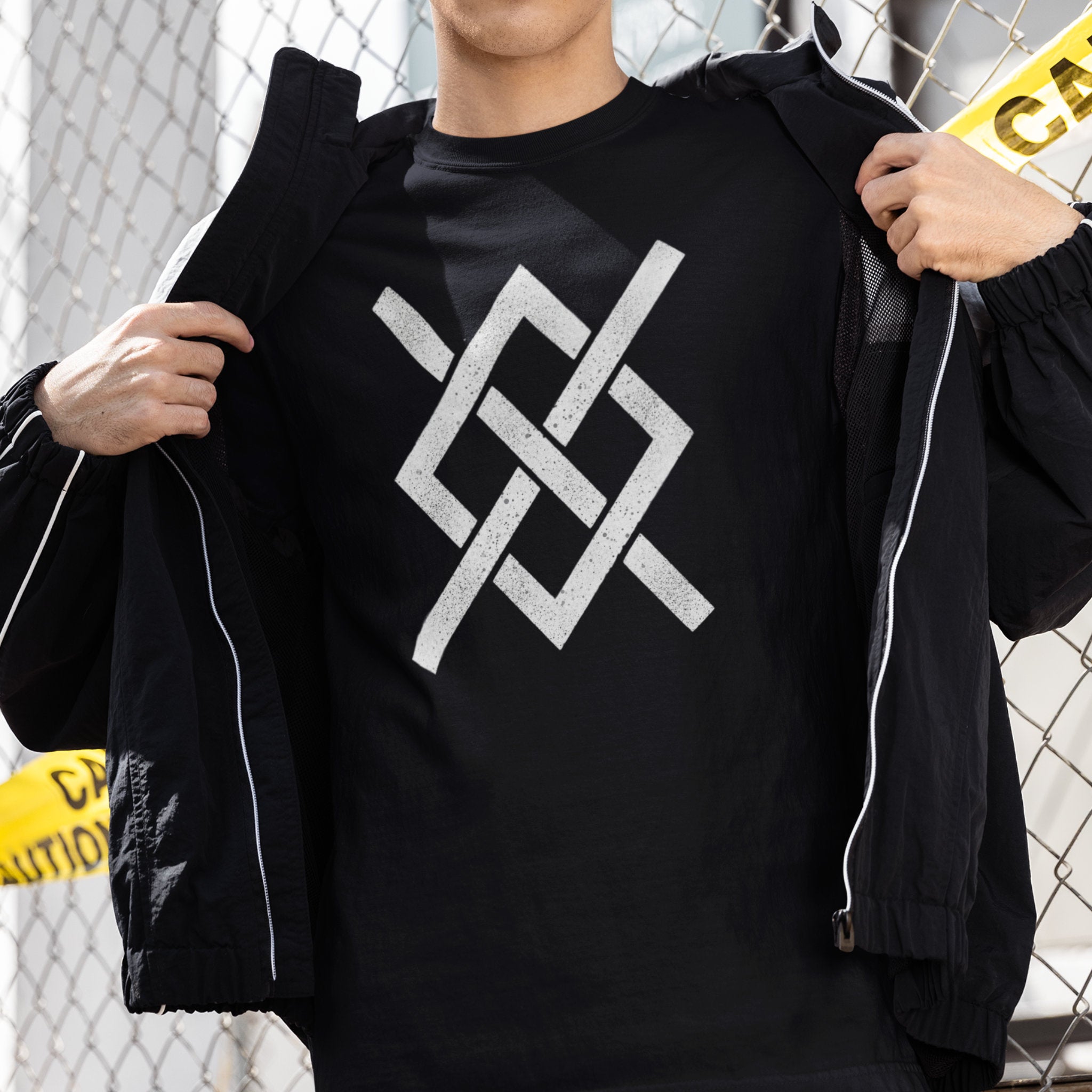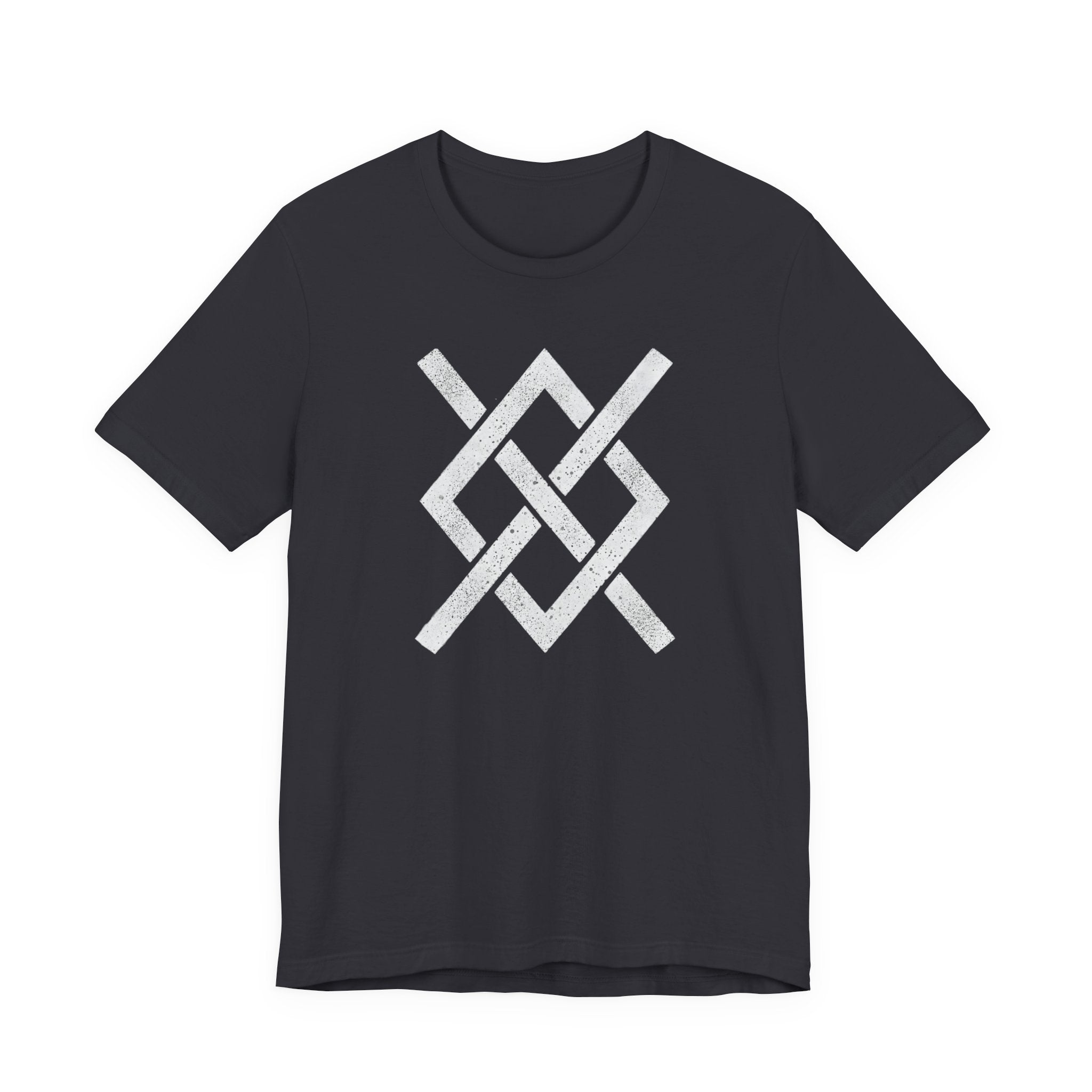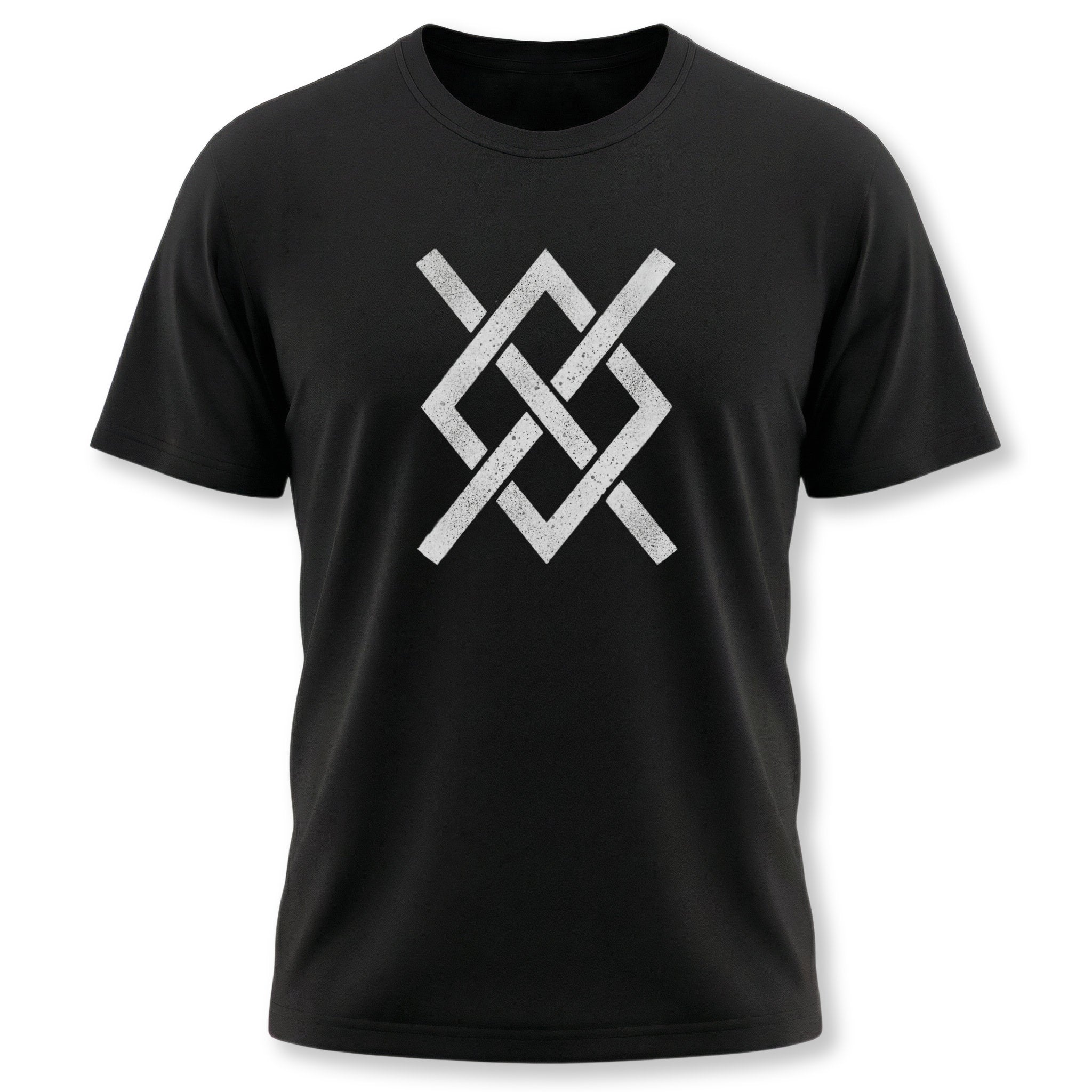 This t-shirt features a striking, distressed white graphic of an intricate, interwoven knot pattern. Composed of interlocking 'W' shapes, the design evokes a sense of ancient symbolism and profound connection. The weathered texture gives it an authentic, time-honored feel, suggesting stories of intertwined destinies and complex paths. It's a uniquely artistic and powerful statement piece, perfect for those who appreciate designs with depth and a touch of mystique.