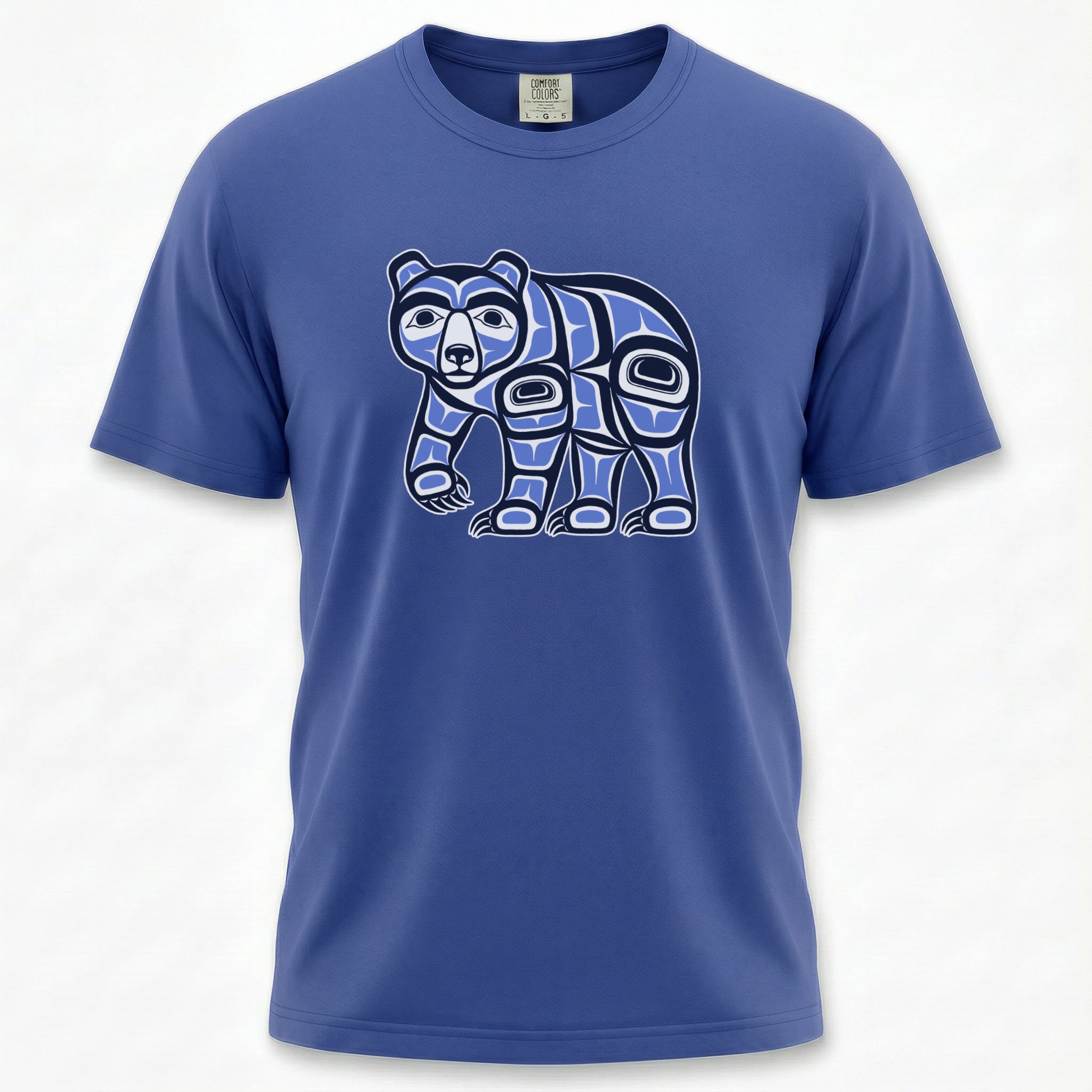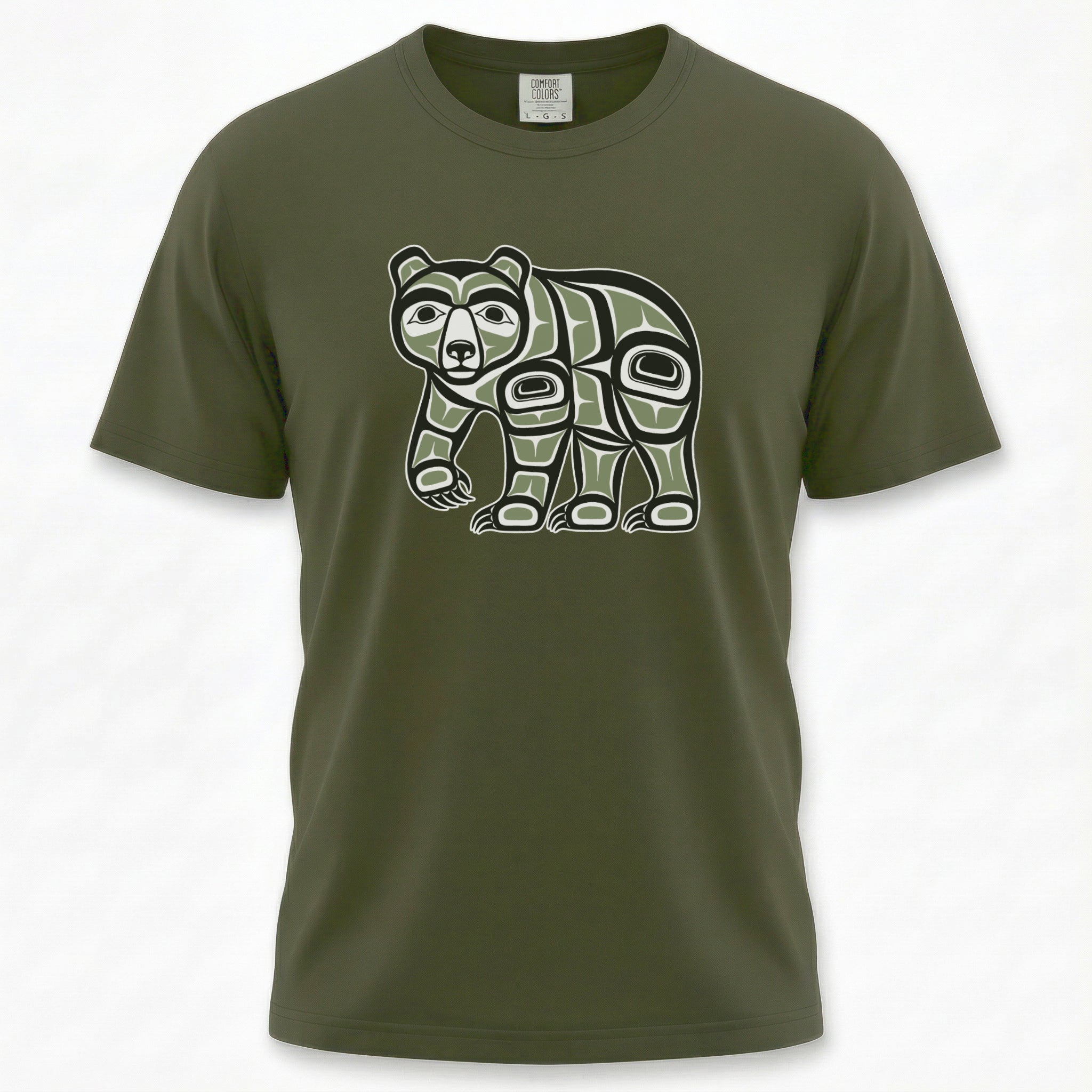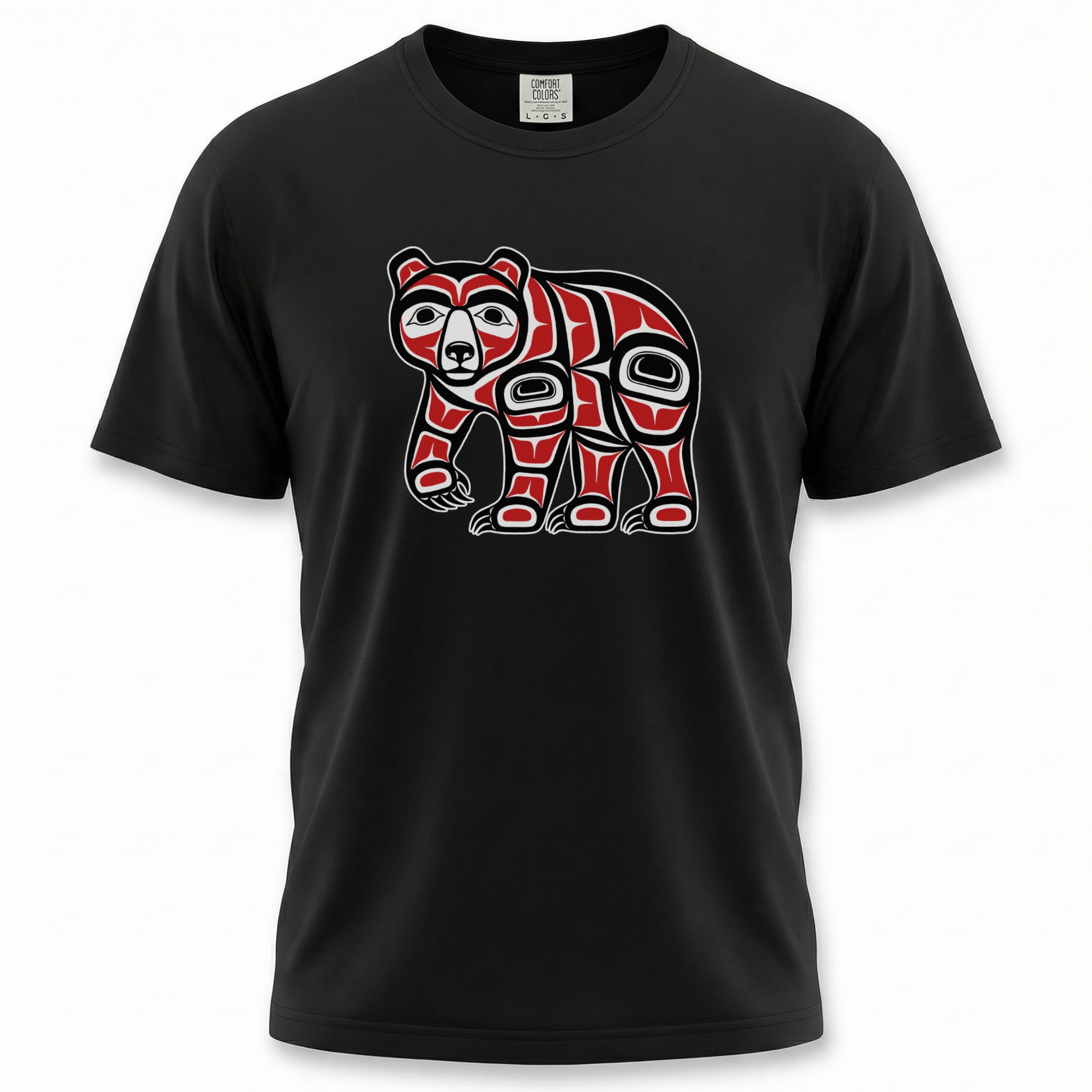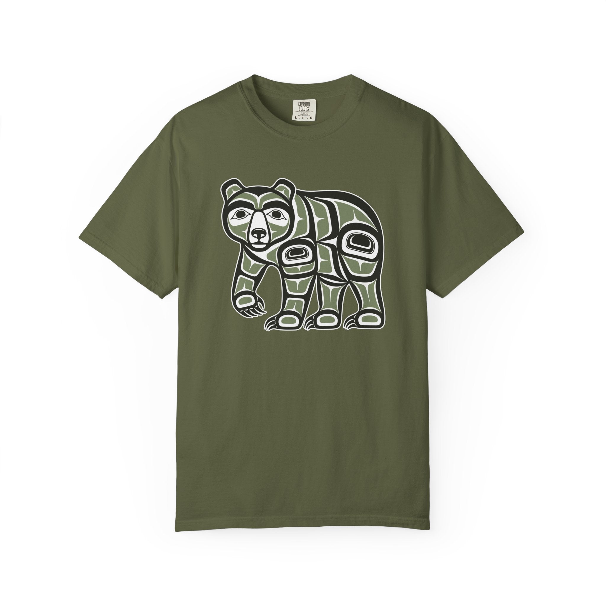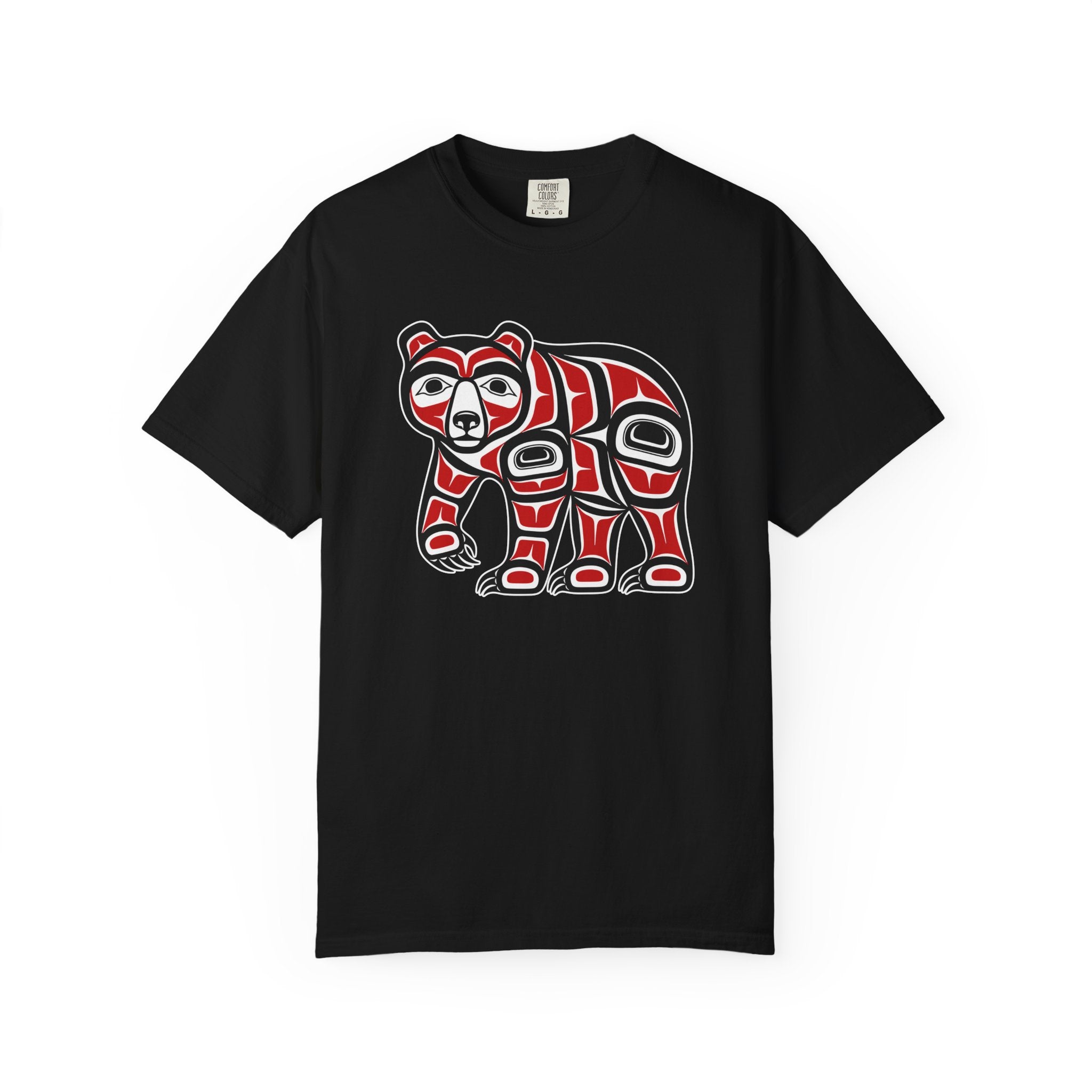 This t-shirt features a striking design of a bear rendered in the iconic Pacific Northwest Indigenous 'Formline' art style. In many Indigenous cultures of the Pacific Northwest, the bear symbolizes strength, wisdom, protection, and a deep connection to the spirit world. Its presence evokes courage and leadership. The design's bold lines, ovoids, and U-forms, characteristic of these rich cultural traditions, make it a powerful and eye-catching statement piece for anyone who appreciates cultural art and its profound meanings.