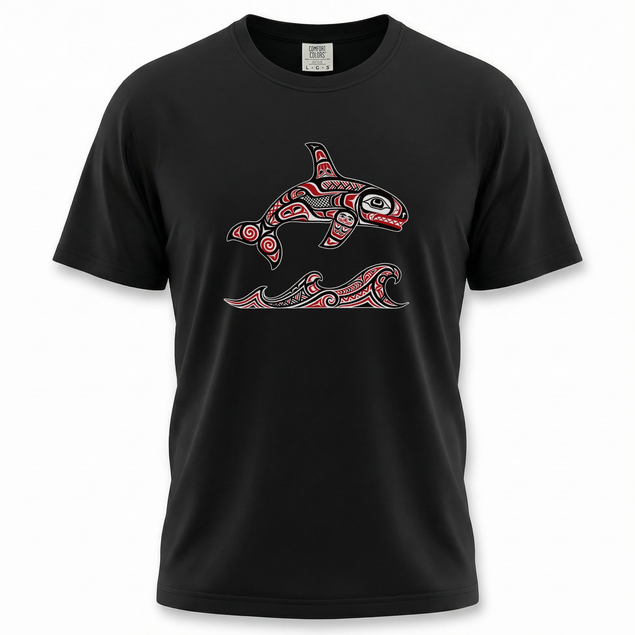 This t-shirt features a striking design of an orca (killer whale) swimming above two stylized waves, rendered in the iconic red, black, and white colors of Pacific Northwest Coast formline art. In many Indigenous cultures of the Pacific Northwest, the Orca is a powerful symbol of strength, wisdom, protection, and a deep connection to the ocean. Accompanied by rolling waves, the design evokes the spirit of the sea and the majestic power of this revered marine creature. This unique graphic is a tribute to a rich artistic heritage, perfect for those who appreciate cultural depth and stunning visual storytelling. Its intricate details and bold statement make it an exceptional piece for any wardrobe.
