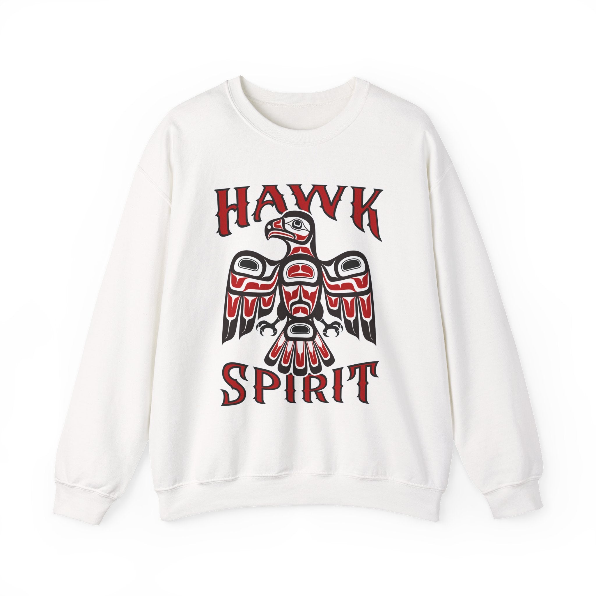 This sweatshirt features a powerful and beautifully rendered hawk (or eagle) in a distinctive Indigenous art style, characterized by striking red, black, and white formlines and ovoid shapes. The words "HAWK" and "SPIRIT" elegantly frame the majestic bird. In many Indigenous traditions, the hawk (or eagle) is a revered spirit animal symbolizing foresight, wisdom, leadership, and a deep connection to the spiritual realm, representing keen vision and the courage to pursue new paths. This unique graphic is a celebration of cultural artistry and profound symbolism, perfect for those who resonate with the strength and spiritual guidance of the hawk. It's an eye-catching and meaningful statement piece for any wardrobe.