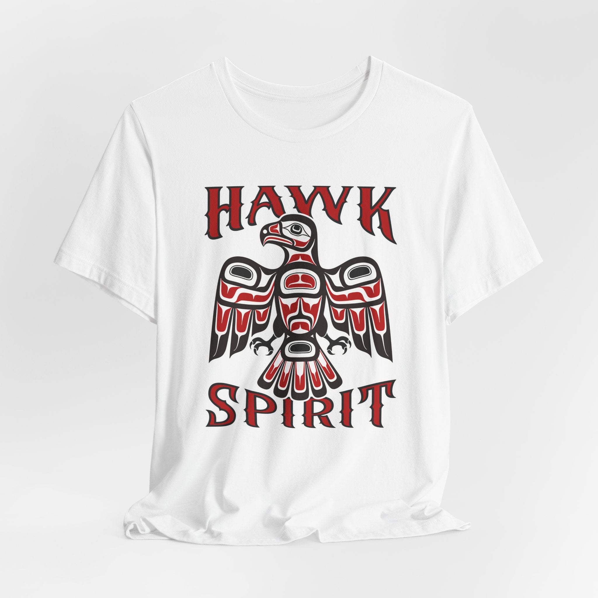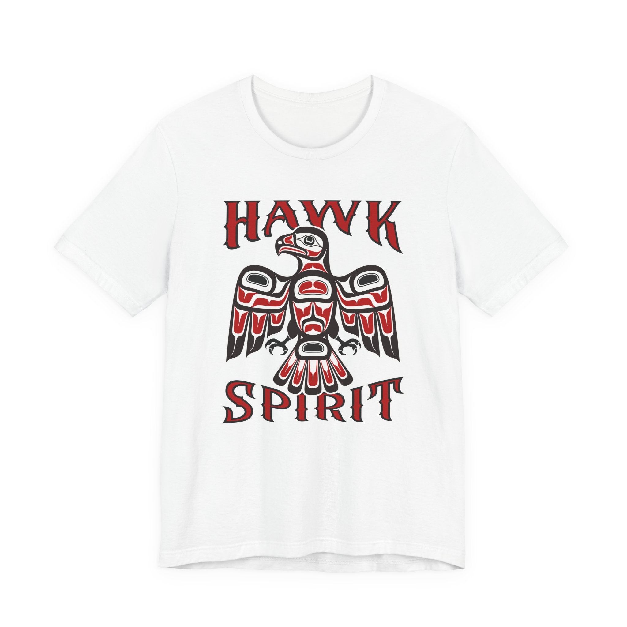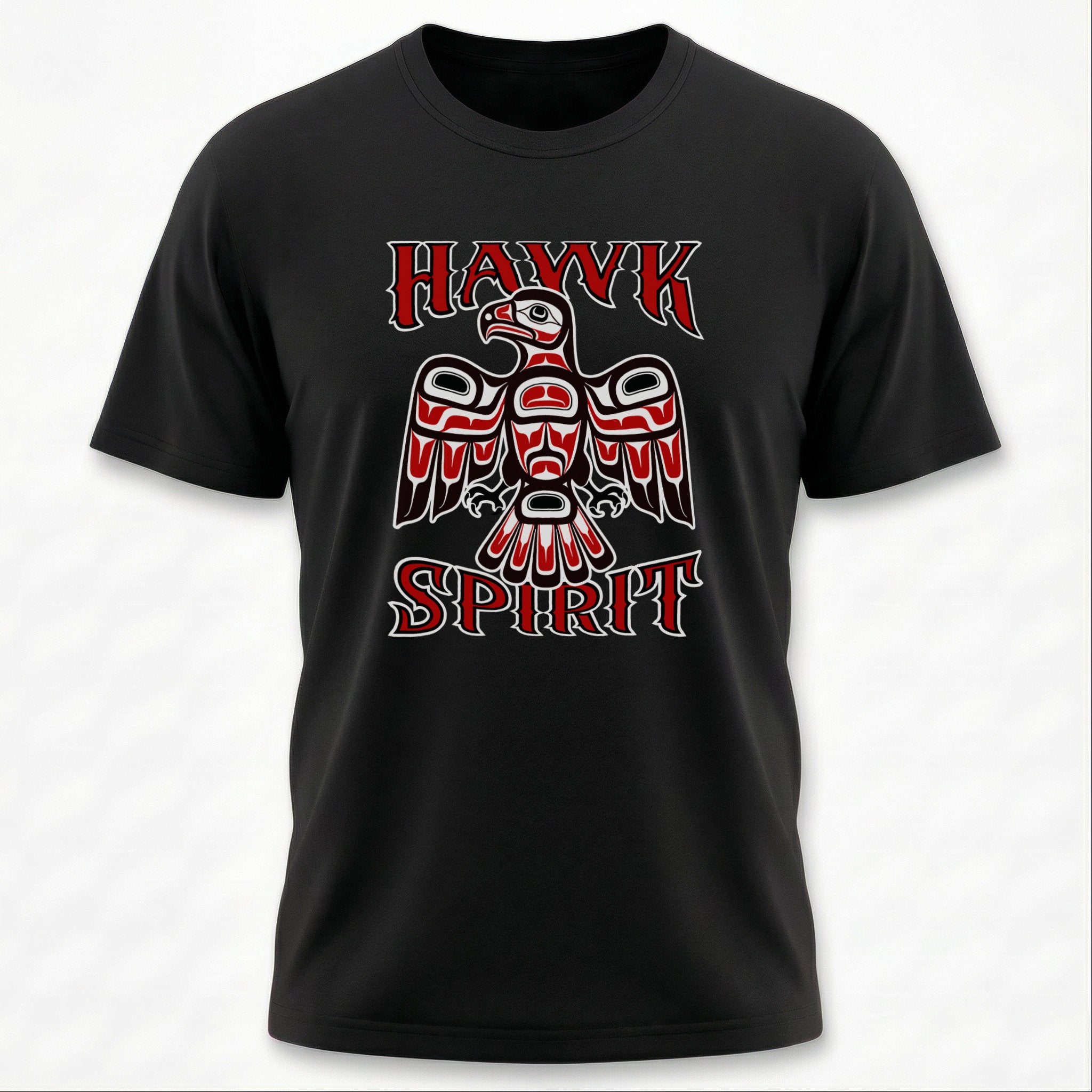 This t-shirt features a striking graphic of a majestic hawk, depicted in the distinctive Formline art style characteristic of Pacific Northwest Indigenous cultures. Adorned with the word "HAWK" above and "SPIRIT" below, the design embodies the profound connection to nature and spiritual essence. The hawk, revered for its keen vision, strength, and soaring ability, often symbolizes foresight, focus, and a deep spiritual connection. This vibrant red and black design with intricate white and black outlines is a visually captivating and culturally rich statement piece, perfect for those who appreciate meaningful art and the powerful symbolism of the natural world.