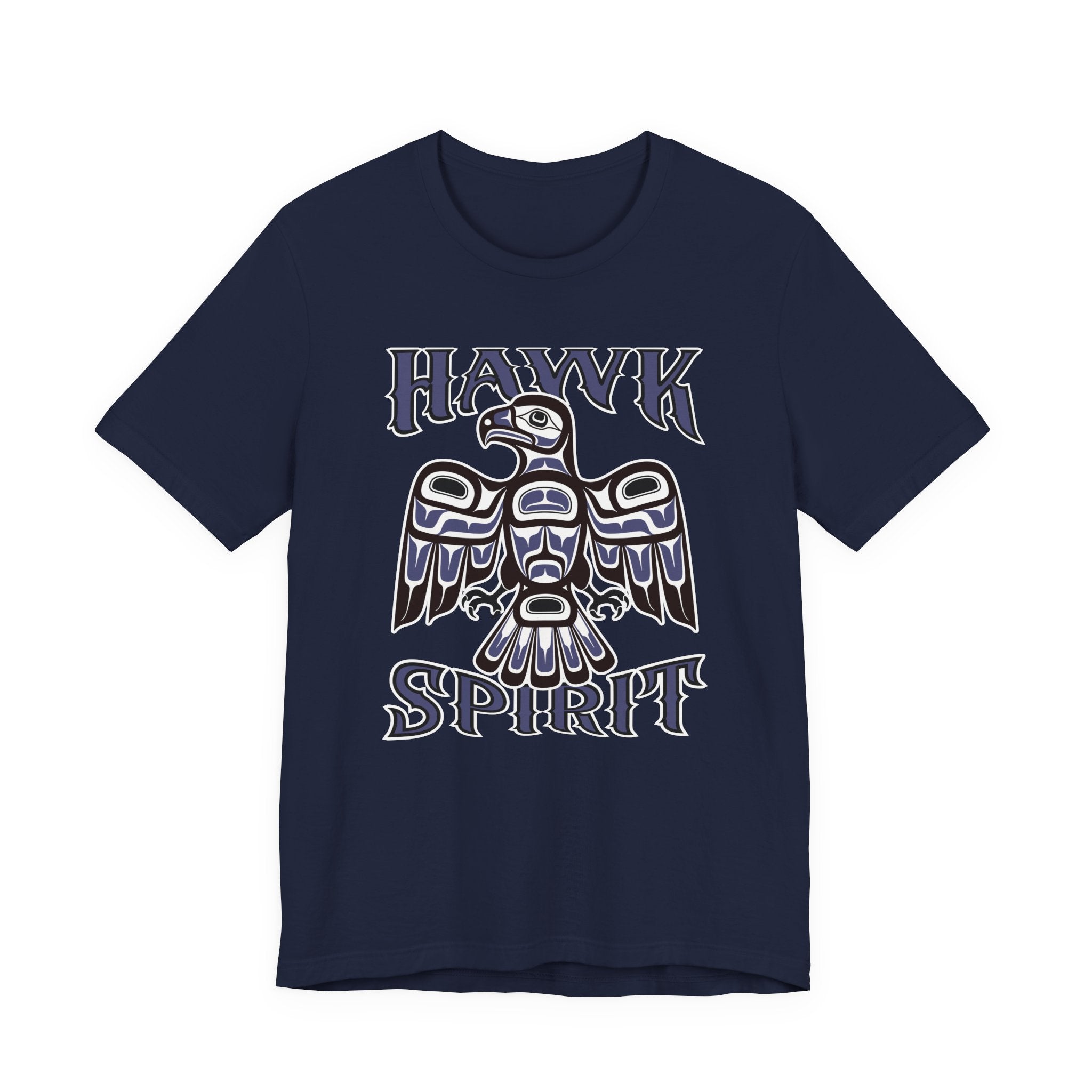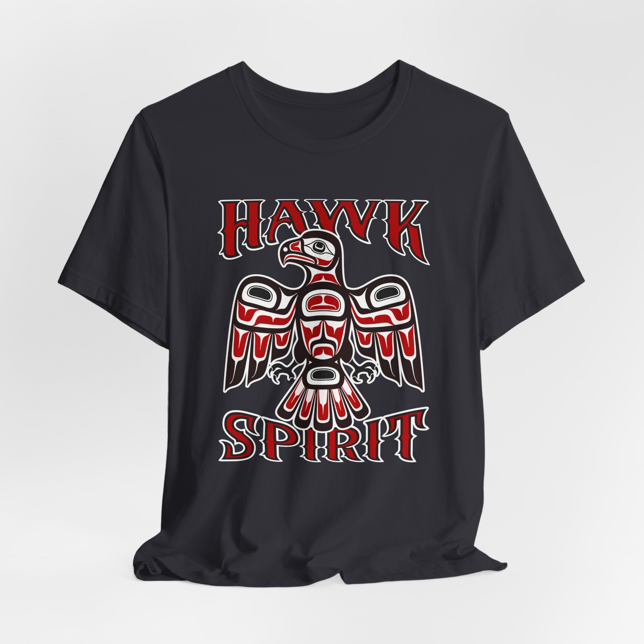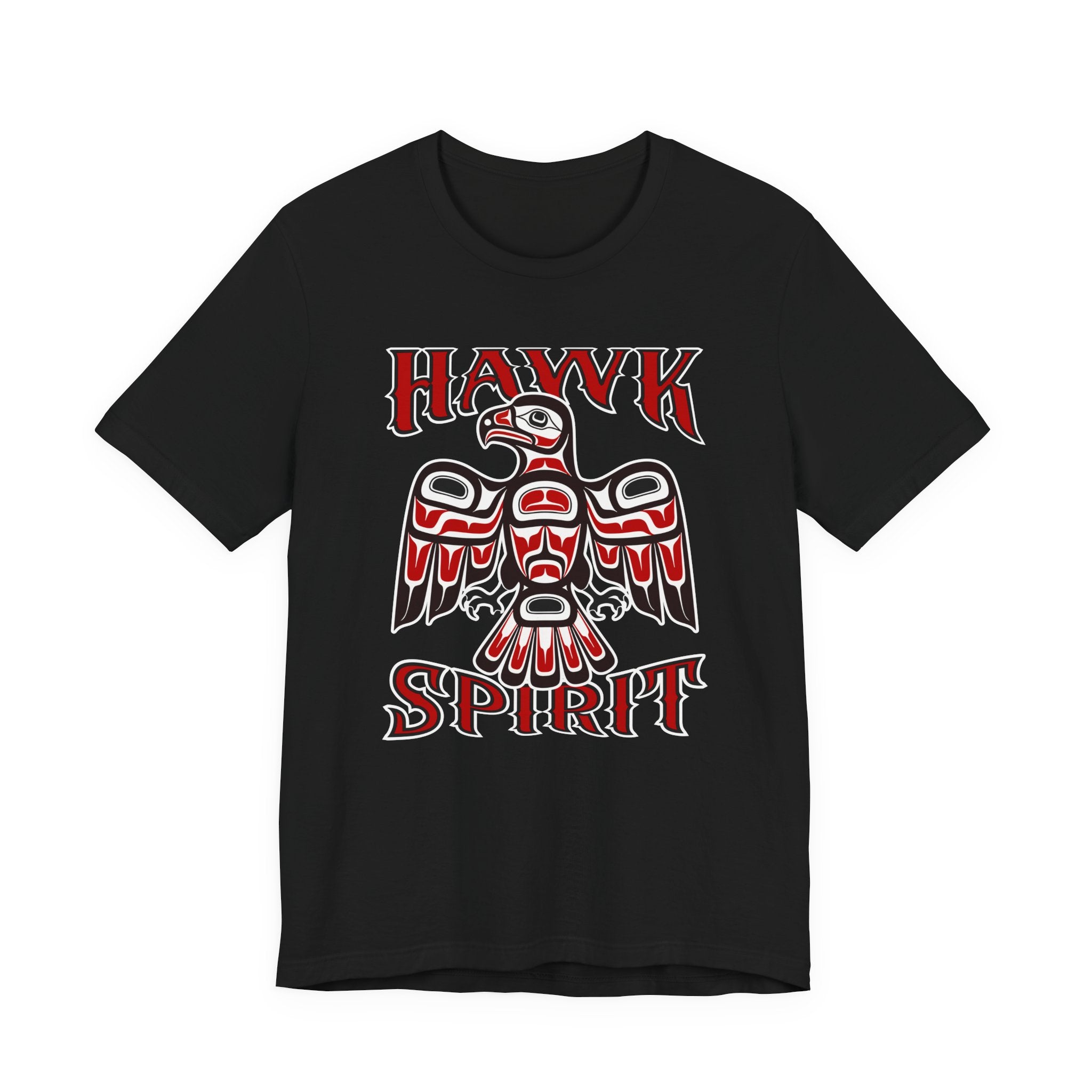 This t-shirt features a striking graphic of a majestic hawk, depicted in the distinctive Formline art style characteristic of Pacific Northwest Indigenous cultures. Adorned with the word "HAWK" above and "SPIRIT" below, the design embodies the profound connection to nature and spiritual essence. The hawk, revered for its keen vision, strength, and soaring ability, often symbolizes foresight, focus, and a deep spiritual connection. This vibrant red and black design with intricate white and black outlines is a visually captivating and culturally rich statement piece, perfect for those who appreciate meaningful art and the powerful symbolism of the natural world.