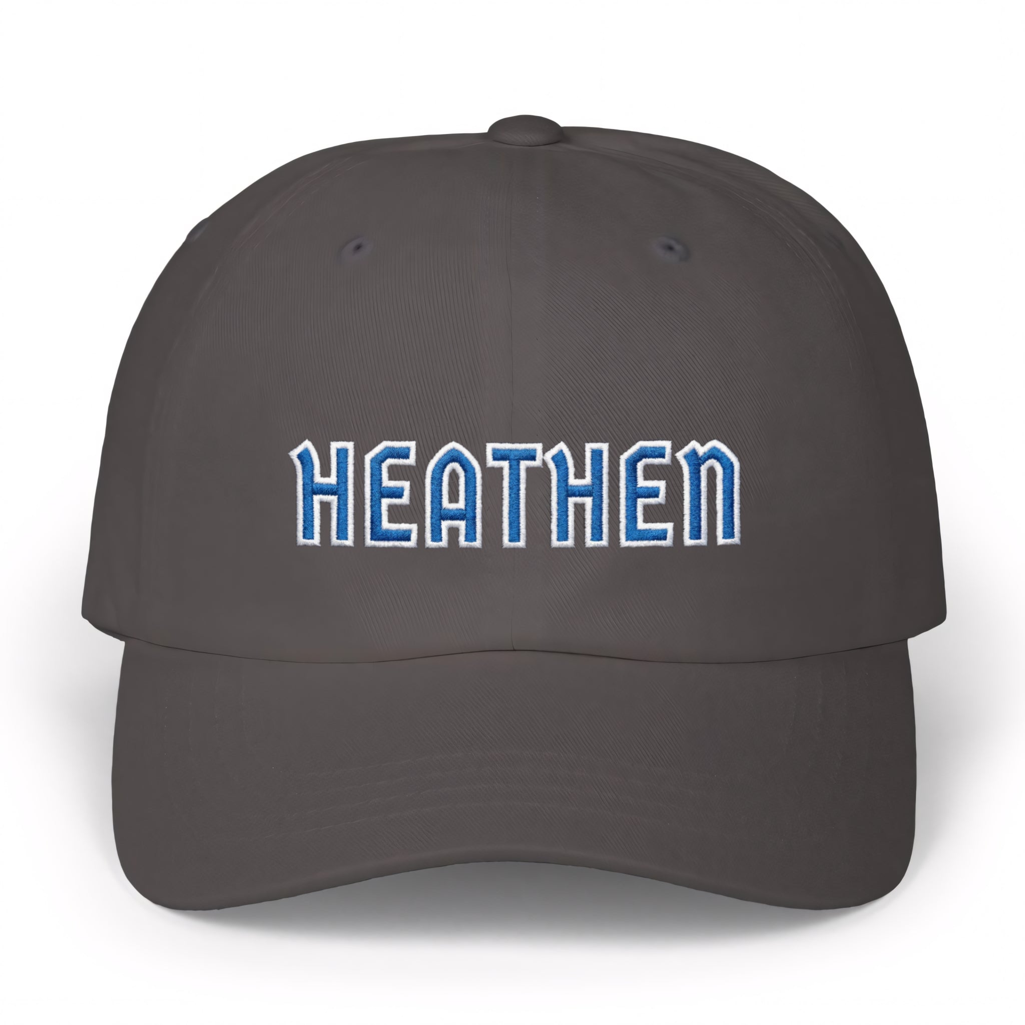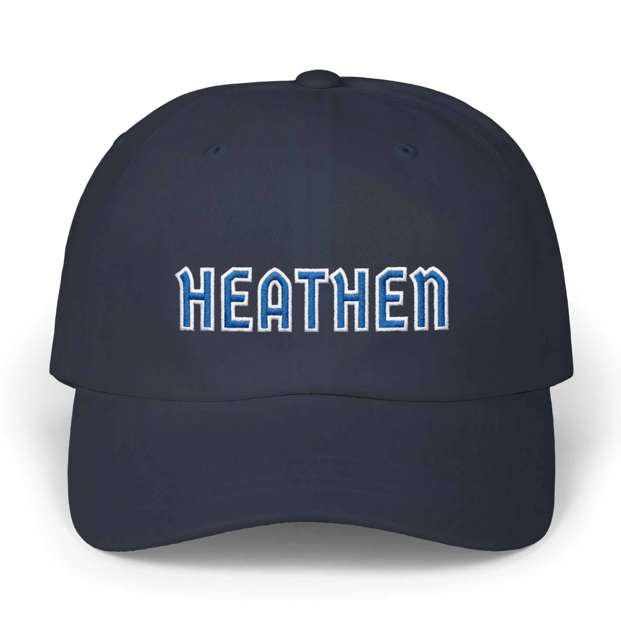 This hat proudly displays the word "HEATHEN" in a striking blue fill with a crisp white outline, rendered in a bold, collegiate-style font. The term "Heathen" is often embraced as a declaration of individuality, non-conformity, or an affinity for alternative spiritual paths and lifestyles. It evokes a sense of freedom and a playful defiance against conventional norms. This design is a powerful statement piece, perfect for those who proudly walk their own path and appreciate bold, expressive apparel. It's sure to spark conversations and highlight your unique identity.