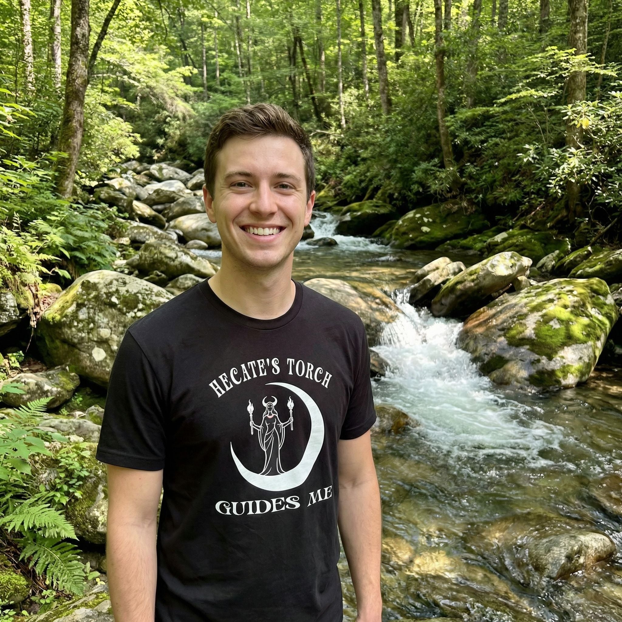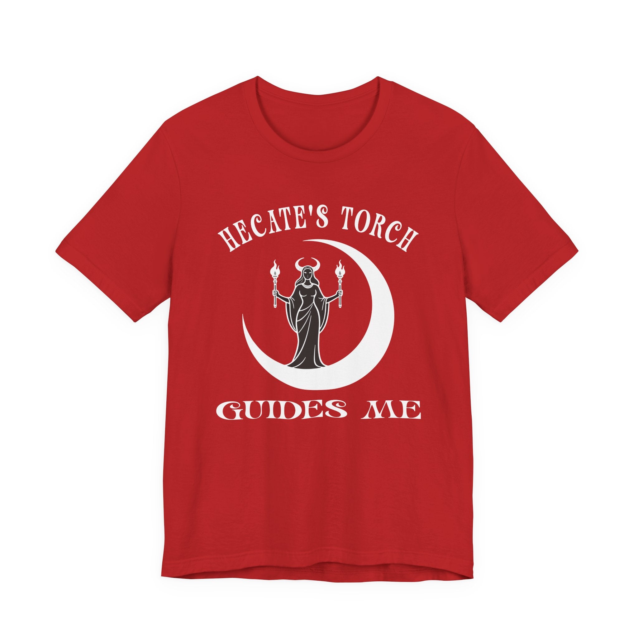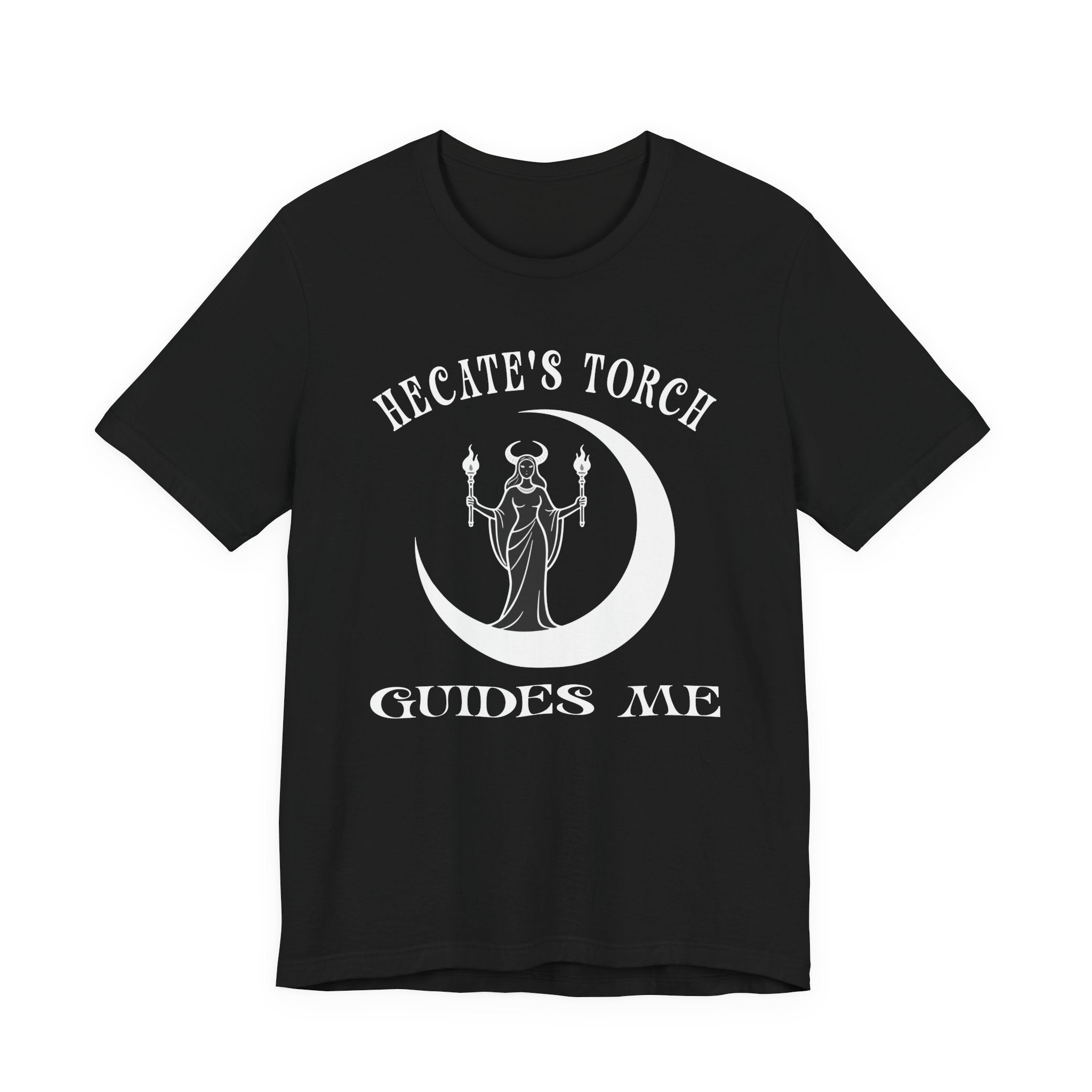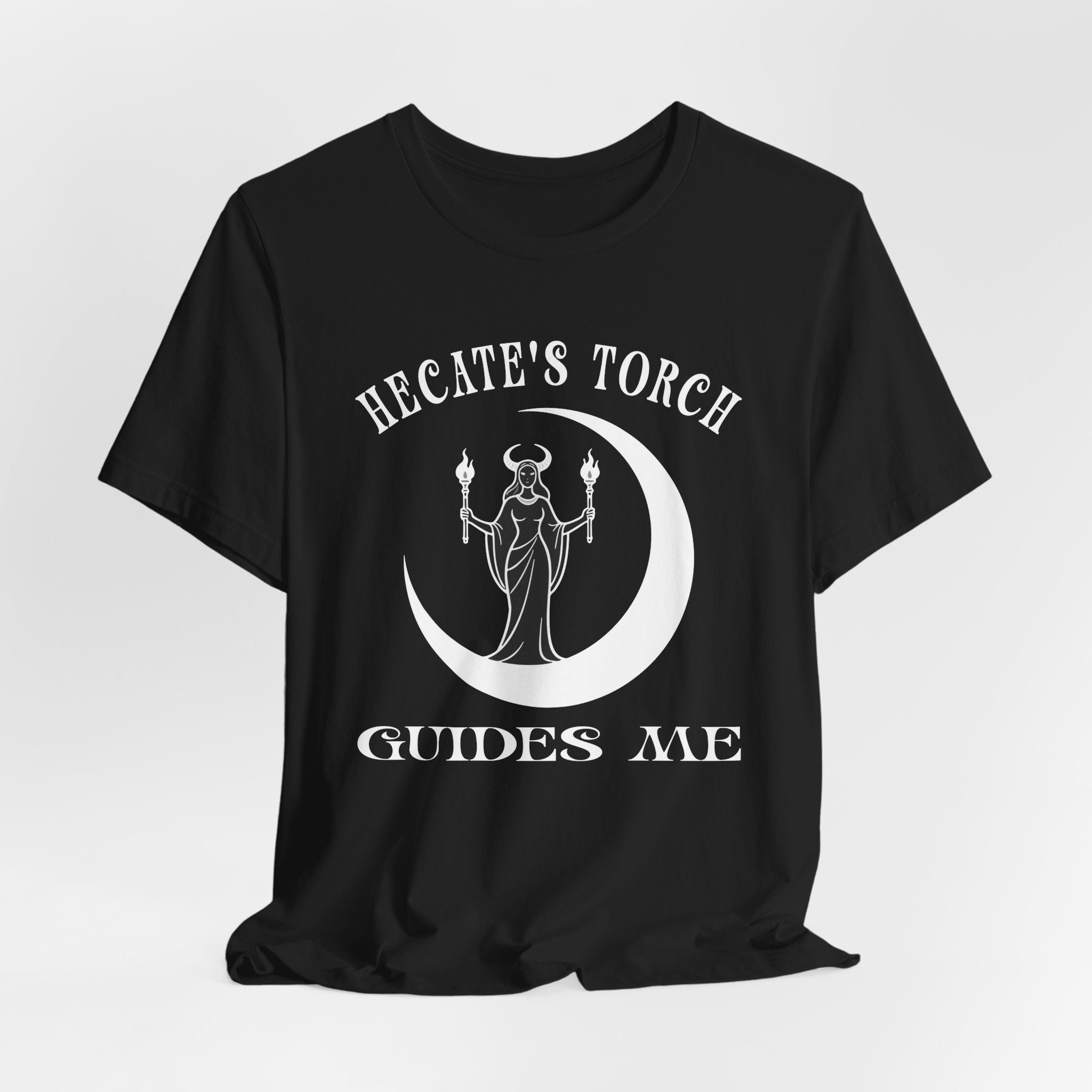 This t-shirt features a striking white graphic depicting the goddess Hecate within a crescent moon, holding her iconic flaming torches. The design is crowned with "HECATE'S TORCH" and grounded by "GUIDES ME," directly invoking the ancient Greek goddess of magic, crossroads, and the moon. Hecate's torches symbolize enlightenment, protection, and guidance through the unknown, making this design a powerful statement of spiritual direction and strength. It's a bold and mystical piece, perfect for those who seek divine wisdom or resonate with powerful feminine energy.