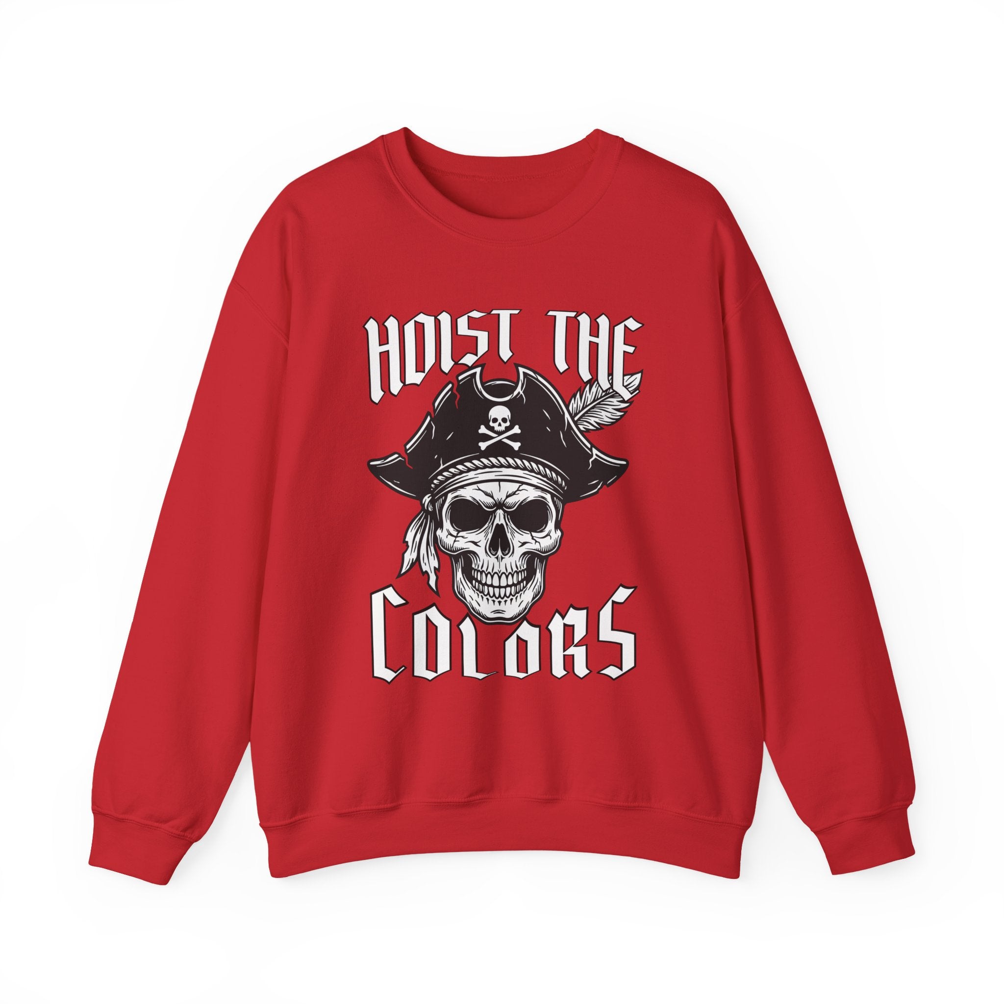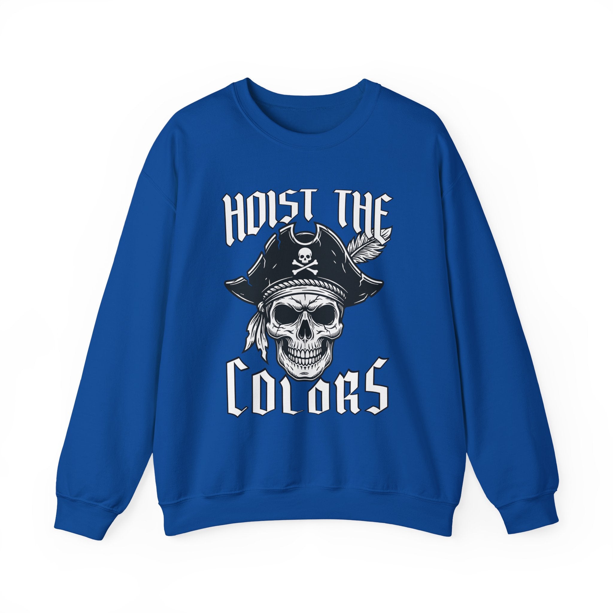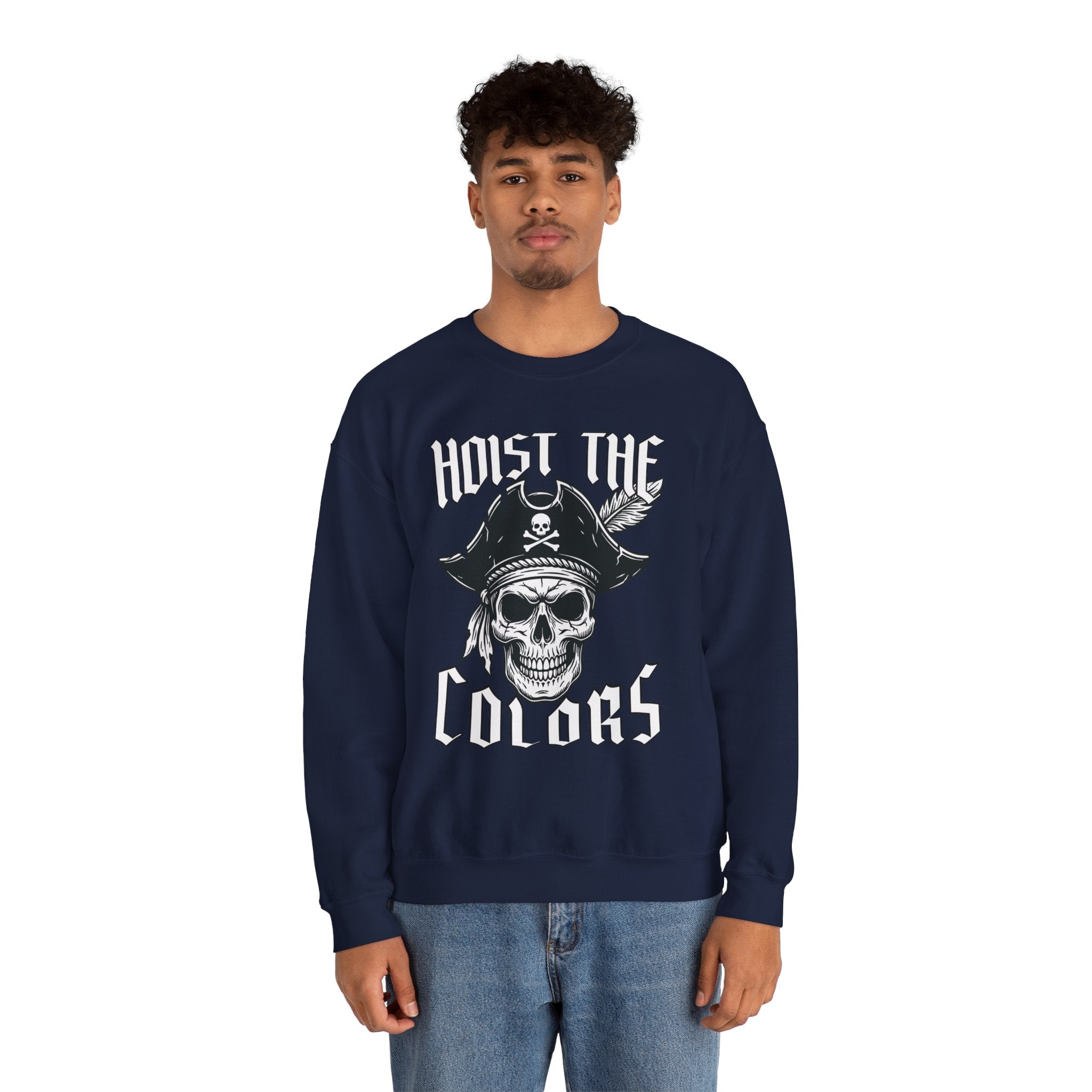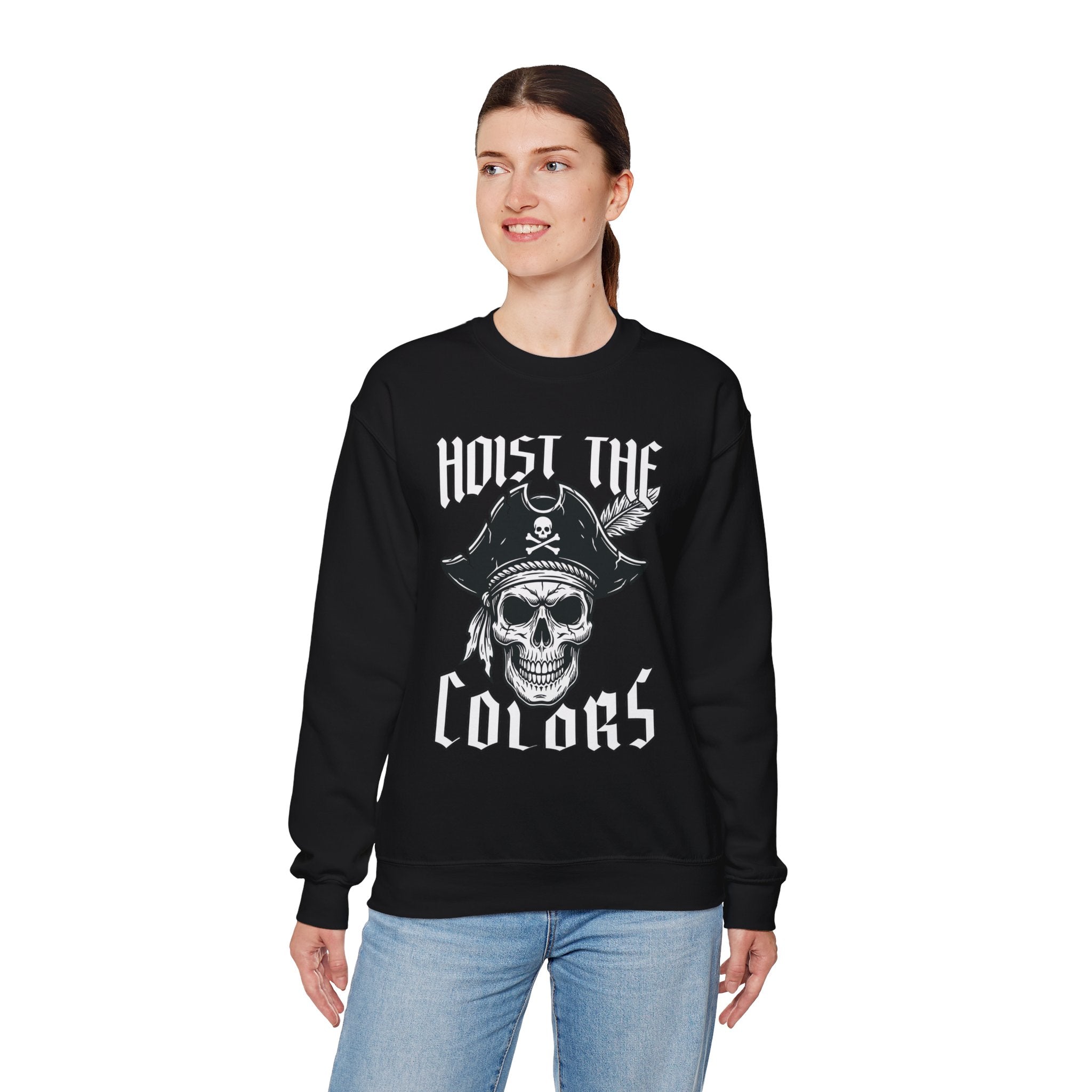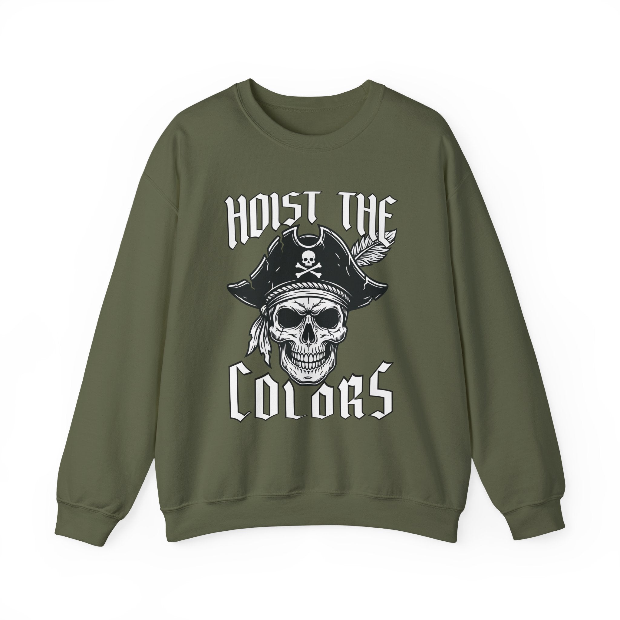 This sweatshirt features a striking graphic of a pirate skull, adorned with a classic tricorn hat, crossed bones, and a feather, accompanied by the bold declaration "HOIST THE COLORS." This iconic phrase is a powerful call to adventure, signaling the raising of the pirate flag – the Jolly Roger – a timeless symbol of freedom, rebellion, and a daring spirit on the high seas. The design is bold and eye-catching, perfect for those who appreciate maritime legends and powerful statements, making it a standout piece for any wardrobe.
