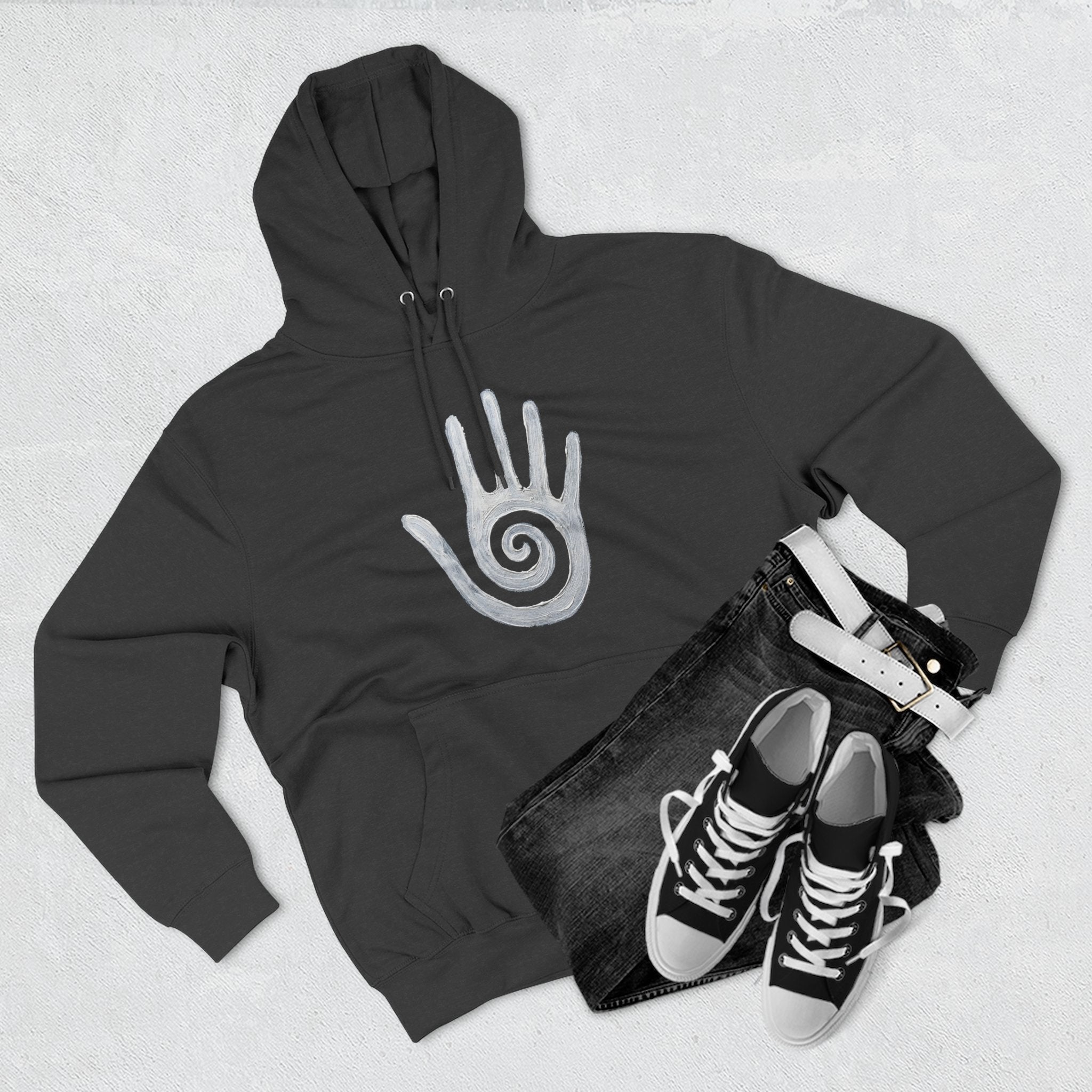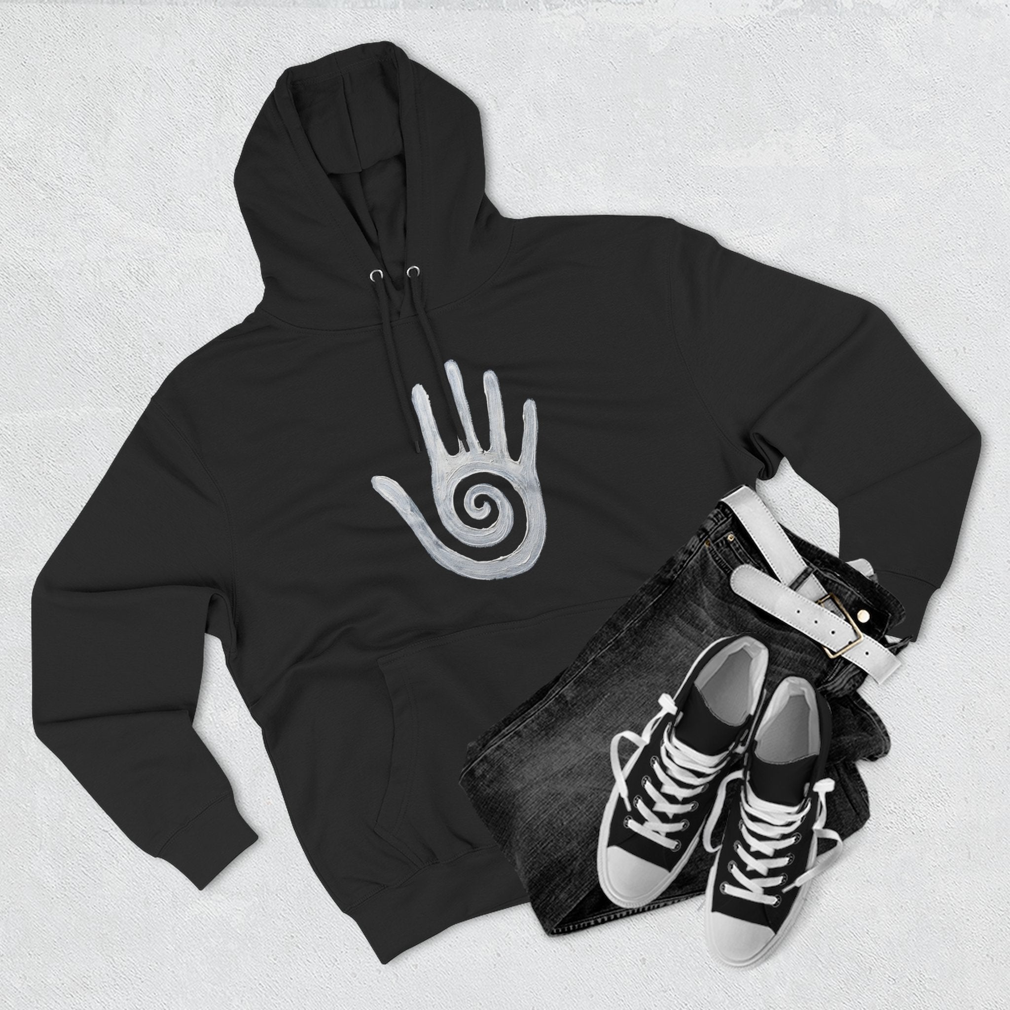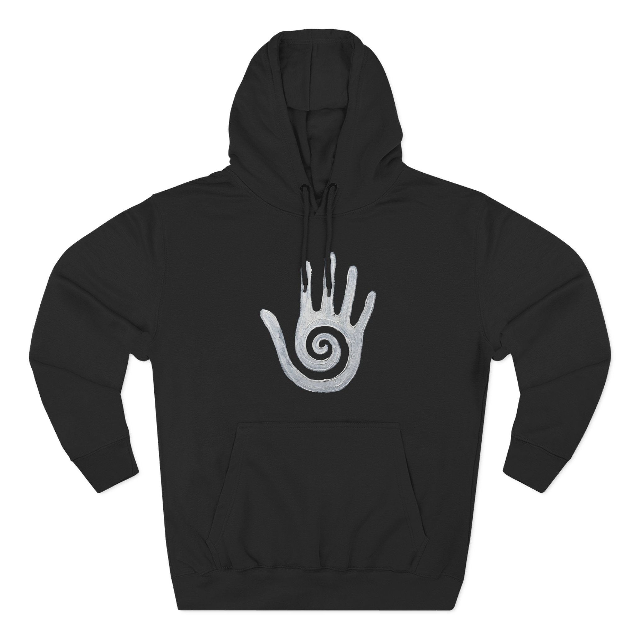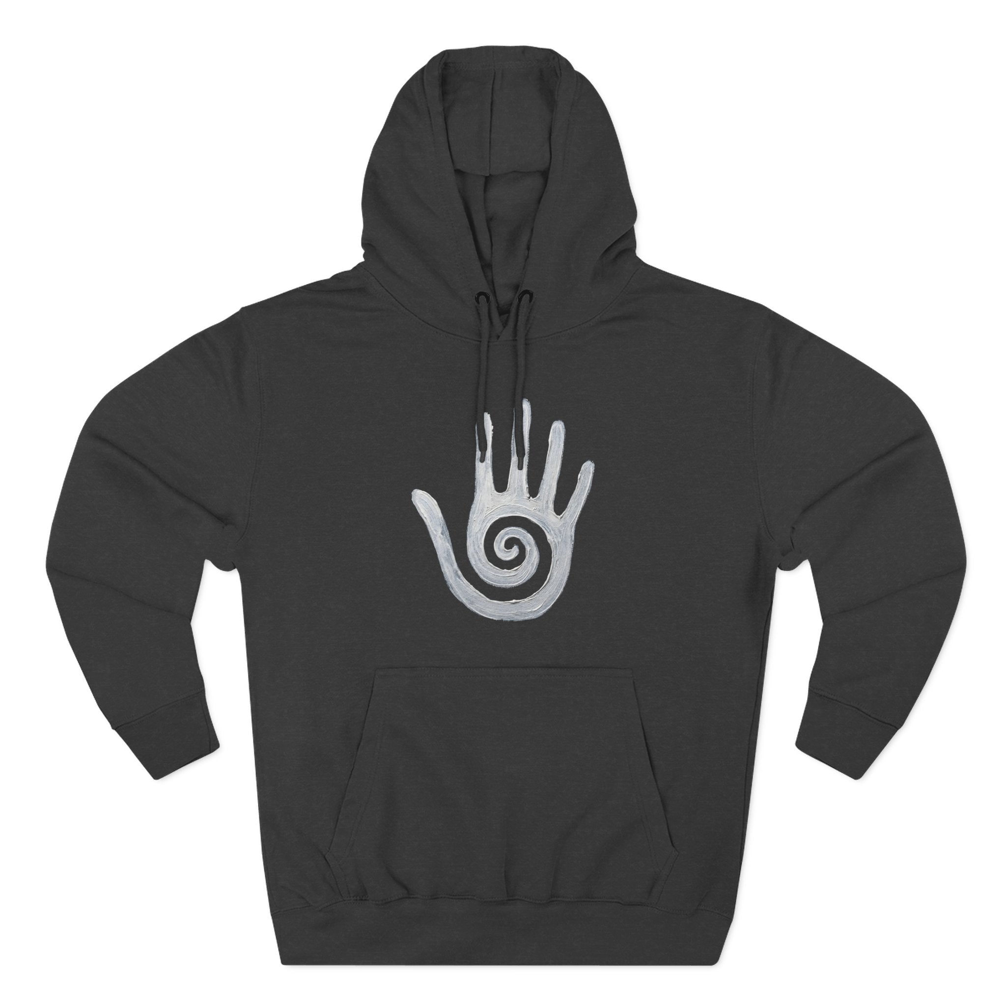 This hoodie features a striking white hand design, boldly showcasing a mesmerizing spiral within its palm. The hand, a universal symbol of human connection, creation, and identity, is empowered by the ancient spiral, representing growth, inner journey, and cosmic energy. This unique graphic is a powerful and thought-provoking statement piece, perfect for those who resonate with ancient symbols, spiritual exploration, and a connection to deeper wisdom. Make it a standout piece for any wardrobe, reflecting your unique path.