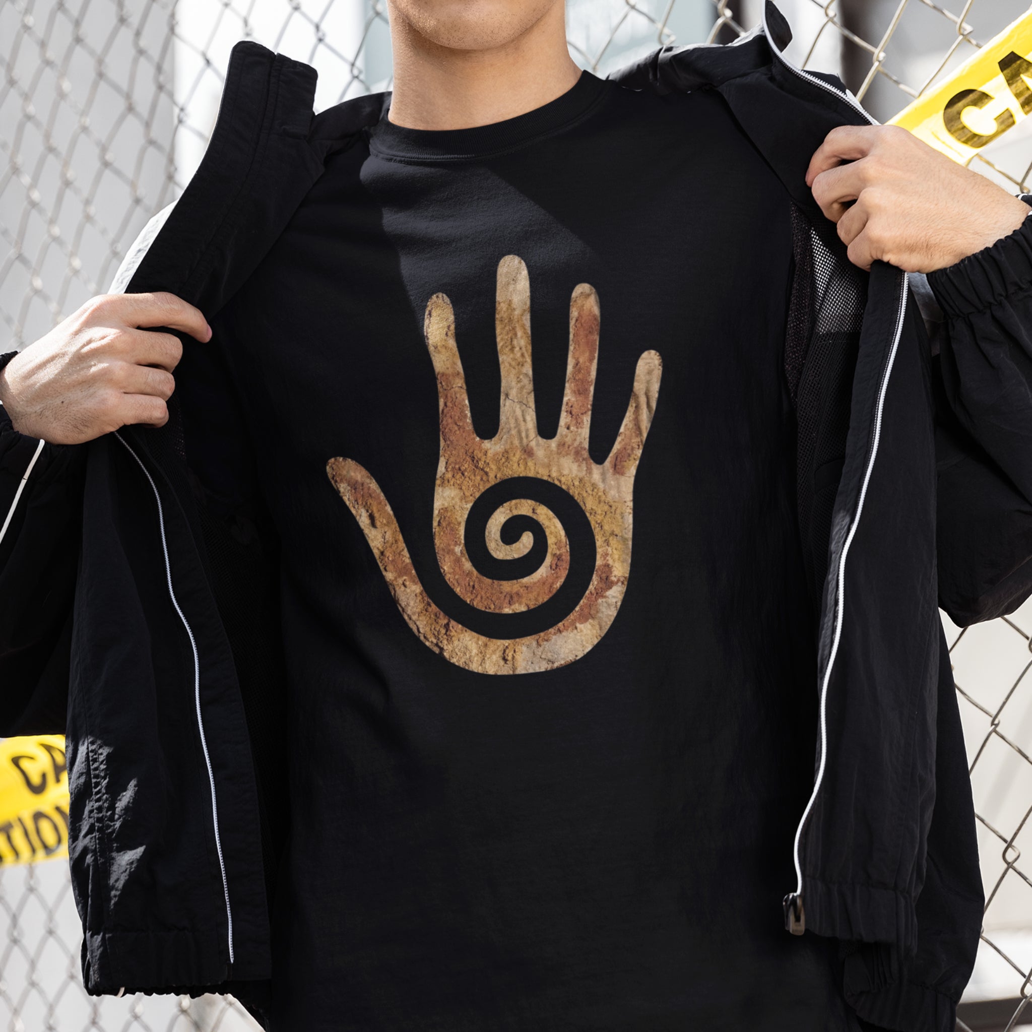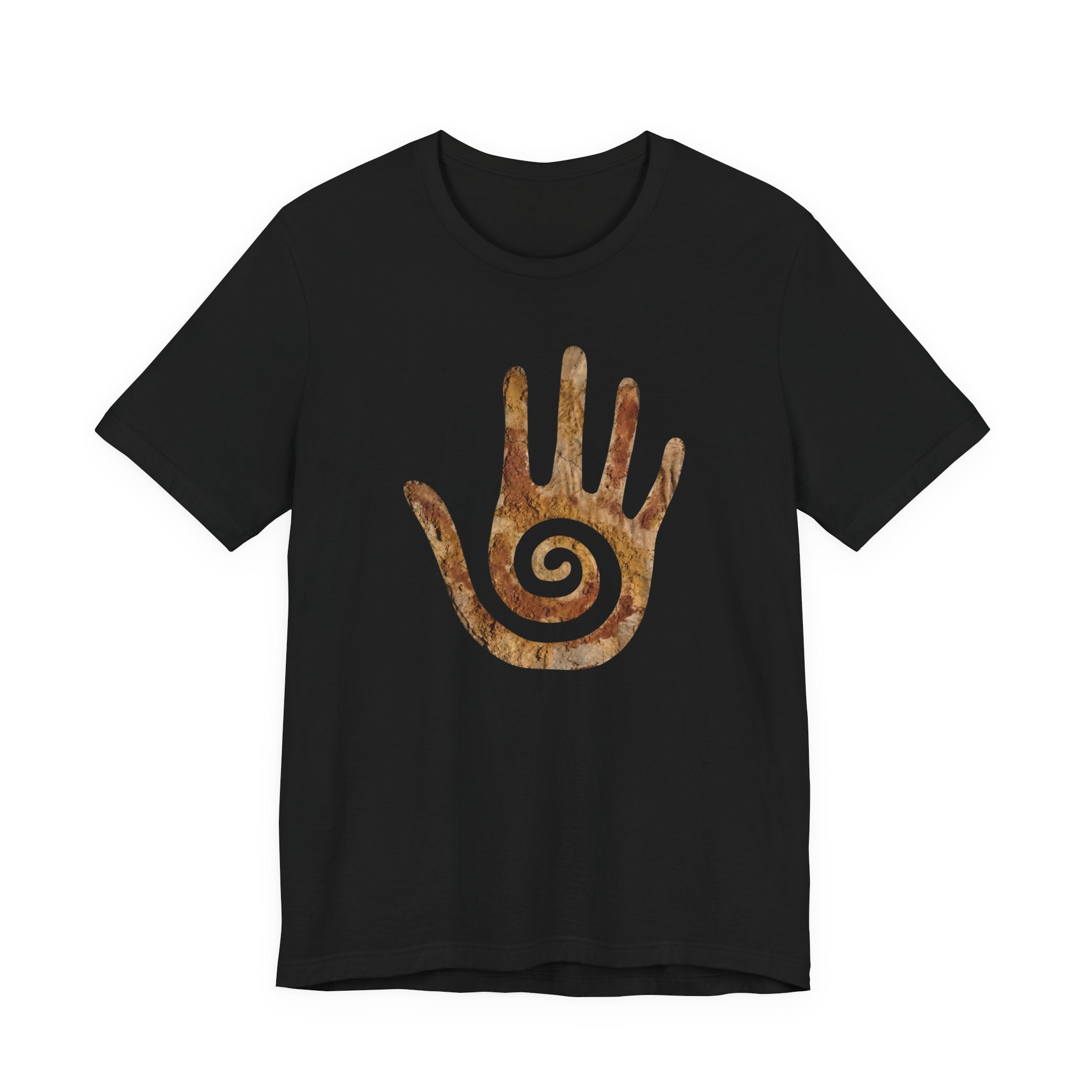 This t-shirt showcases a powerful graphic of the Hopi Healing Hand symbol. The design features a stylized hand with a prominent spiral in the palm, rendered in a beautiful, textured earthy palette reminiscent of ancient stone or natural rock formations. The Hopi Healing Hand is a revered Native American symbol representing healing, protection, life force, and the cyclical journey of life. The central spiral embodies spiritual energy, growth, and connection. Its deep cultural significance and organic, rustic aesthetic make it a profoundly meaningful and visually striking piece, perfect for those who connect with indigenous wisdom, spiritual symbolism, and unique, earth-inspired art.