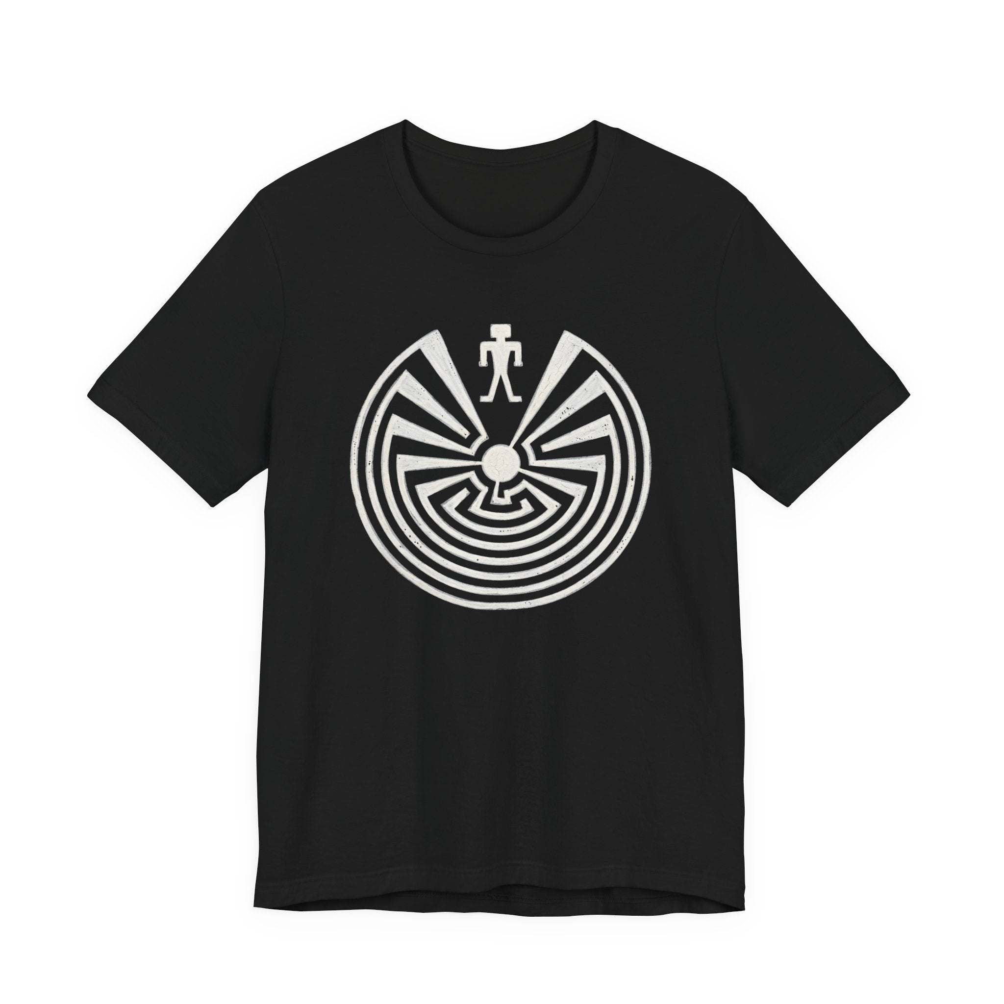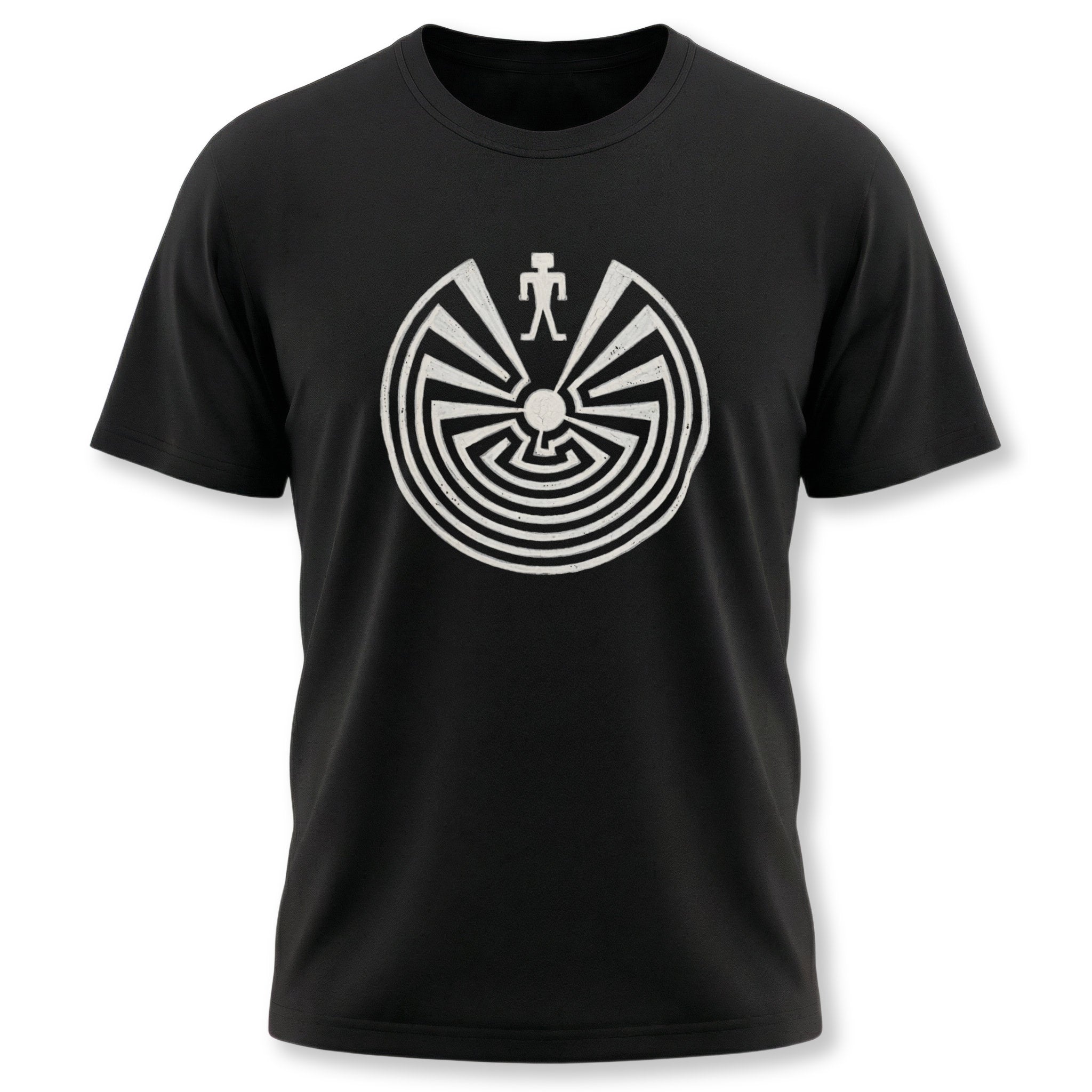 This t-shirt showcases a distinctive graphic featuring the iconic 'Man in the Maze' symbol. The design depicts a stylized figure at the entrance of a circular labyrinth, intricately detailed with concentric paths leading to a central point. Originating from Native American cultures, particularly the Tohono O'odham, this powerful symbol represents the journey of life, self-realization, and the choices we make. The central figure, often known as I'itoi (Elder Brother), guides us through the labyrinth of experiences and decisions. It's a deeply meaningful and visually striking design, perfect for those who appreciate cultural wisdom and profound symbolism. This graphic is not just a design; it's a conversation starter and a reflective statement piece for any wardrobe.