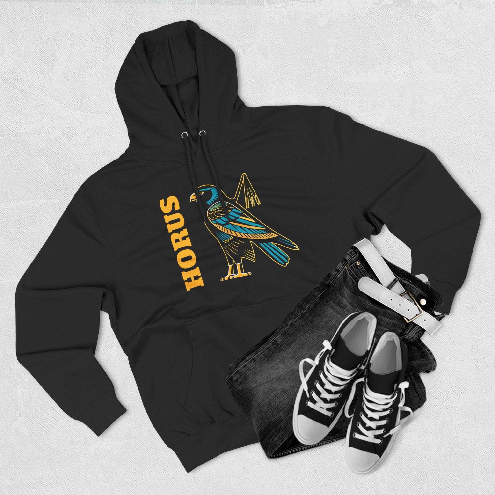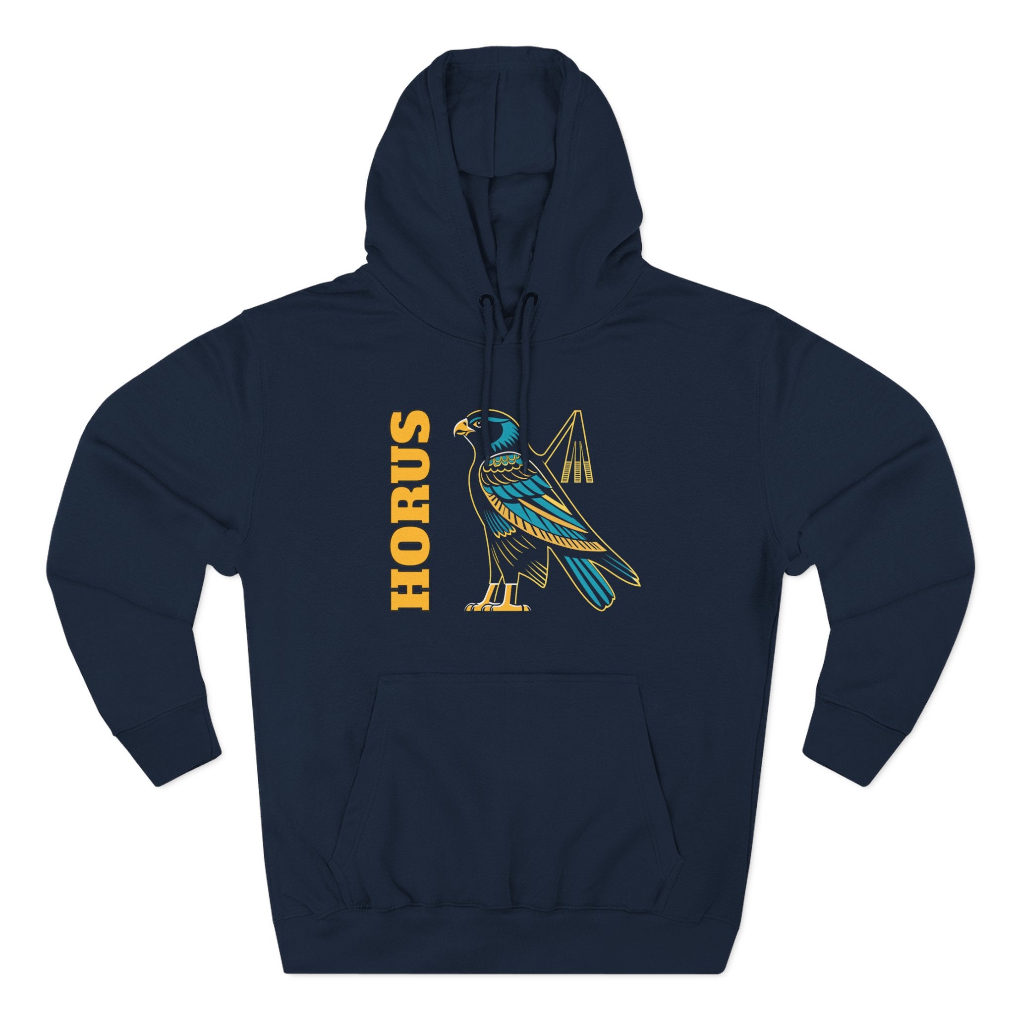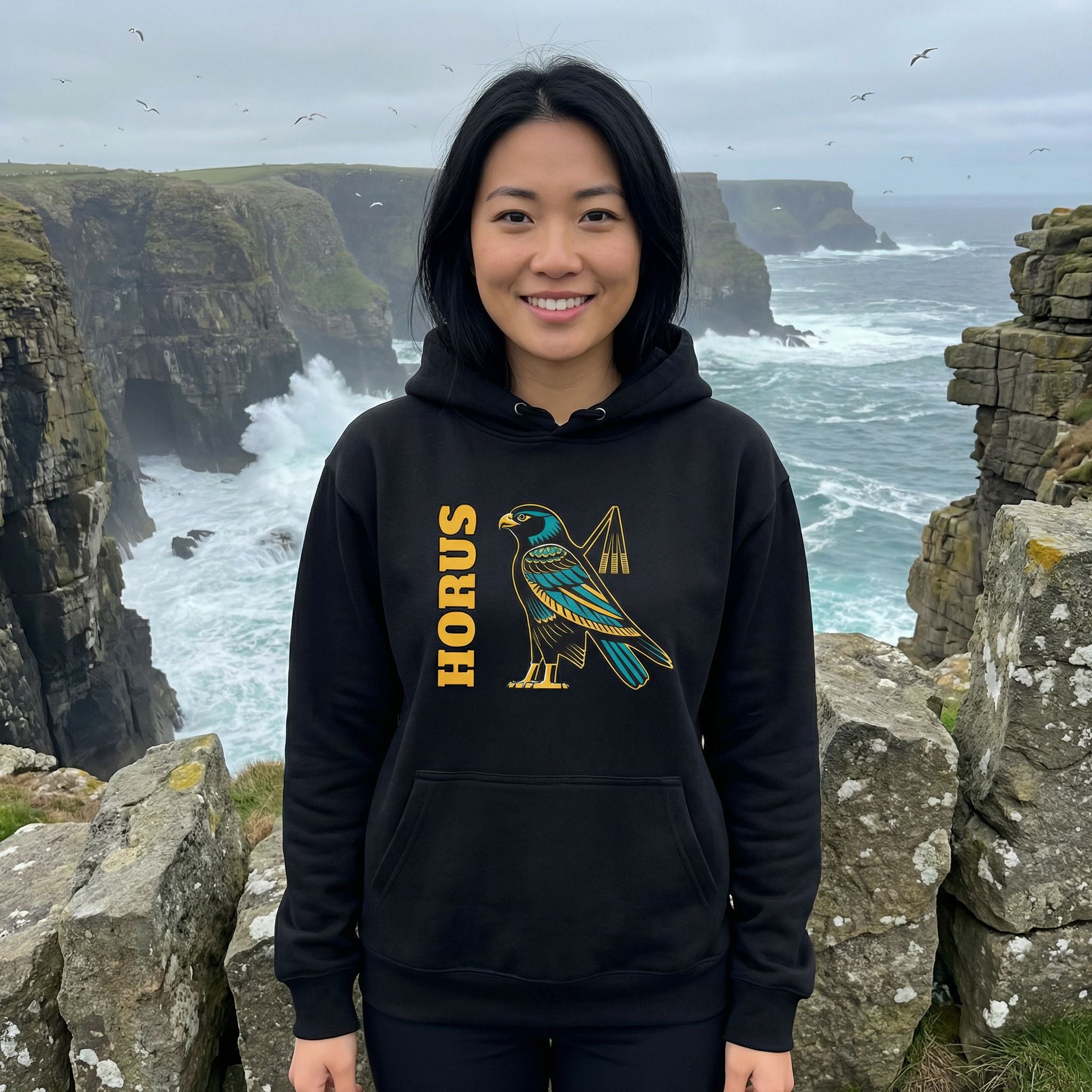 This striking hoodie features a powerful and stylized depiction of Horus, the revered ancient Egyptian falcon god. Rendered in majestic gold and vibrant blue hues, the iconic figure stands boldly, accompanied by his name 'HORUS' in an ancient-inspired vertical script. Horus, the god of kingship, the sky, and protection, embodies divine authority, strength, and guardianship. Often depicted as a falcon, he represents soaring power, vigilance, and the divine connection to the pharaohs. This unique graphic is a tribute to Egyptian mythology, perfect for those who appreciate cultural depth, powerful symbolism, and eye-catching artistic expression. It's designed to be a conversation starter and a standout piece in any collection.