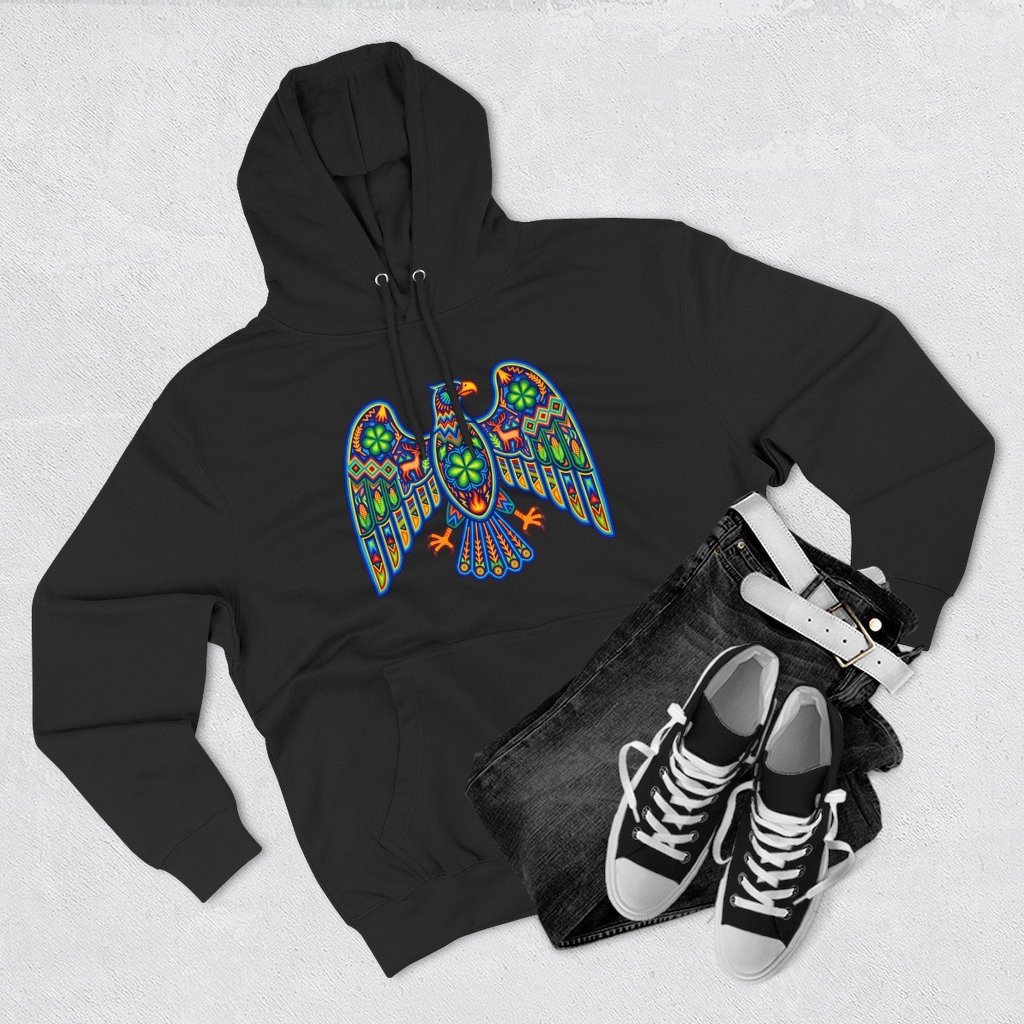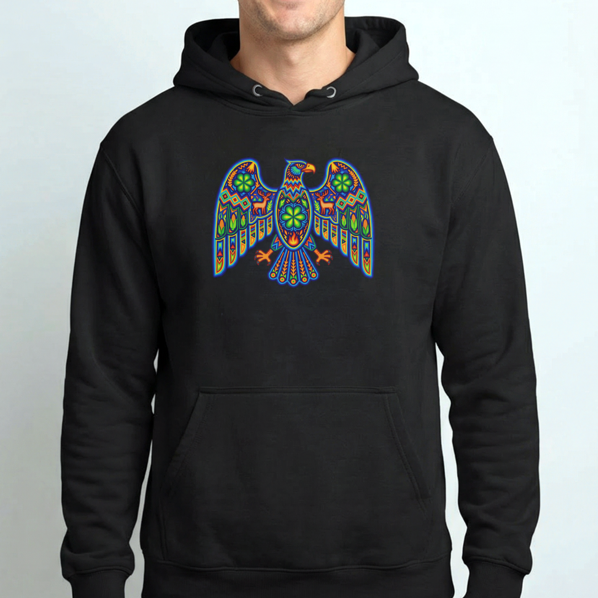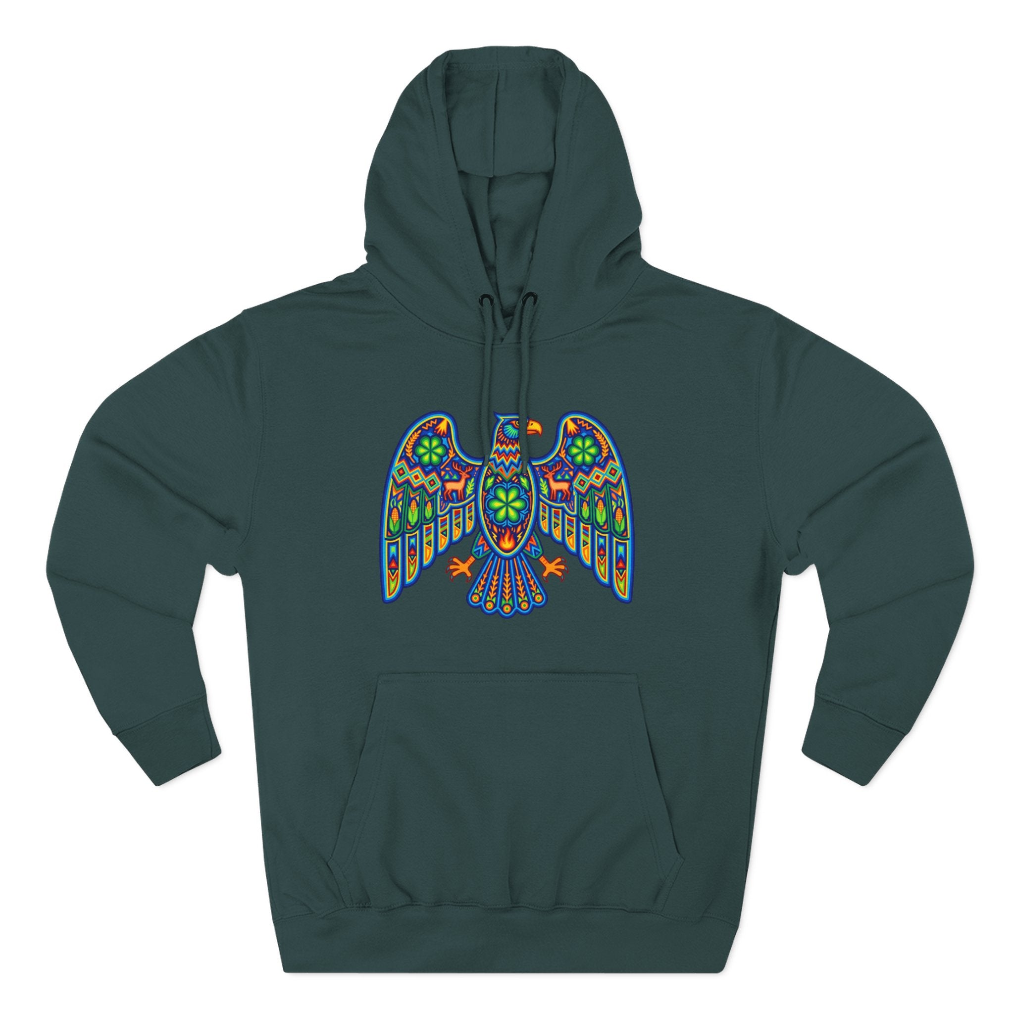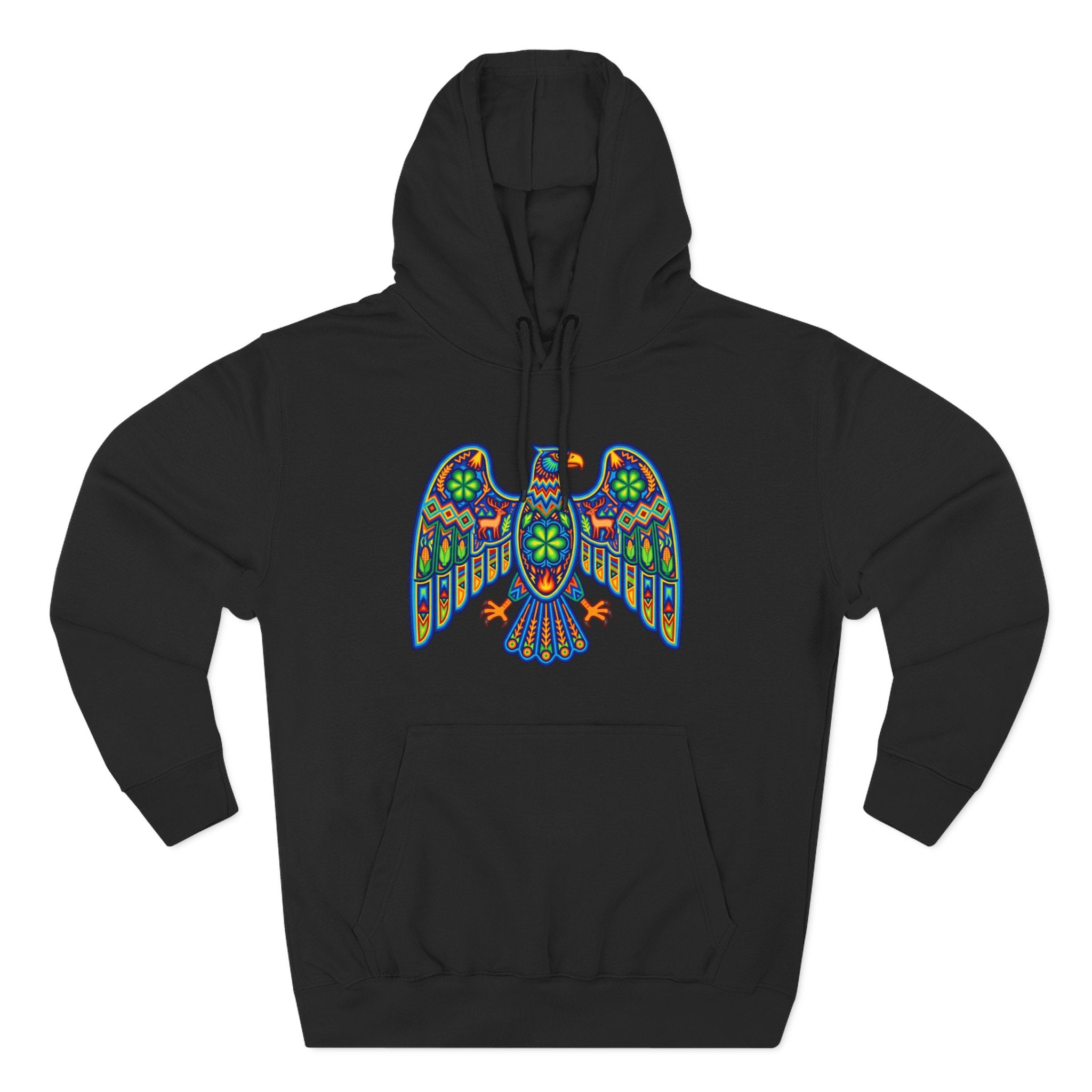 This hoodie features a strikingly colorful and intricately patterned eagle design, inspired by the rich traditions of vibrant folk art, reminiscent of Huichol or other indigenous Mexican artwork. The majestic eagle, a powerful symbol across many cultures, represents strength, freedom, clear vision, and a deep connection to the spiritual realm. Adorned with a mosaic of geometric patterns, floral motifs, and a brilliant spectrum of colors, this design is a captivating fusion of tradition and artistic expression. It's an eye-catching and intricate graphic, perfect for those who appreciate unique cultural designs and meaningful symbolism, making it a standout piece for any wardrobe.
