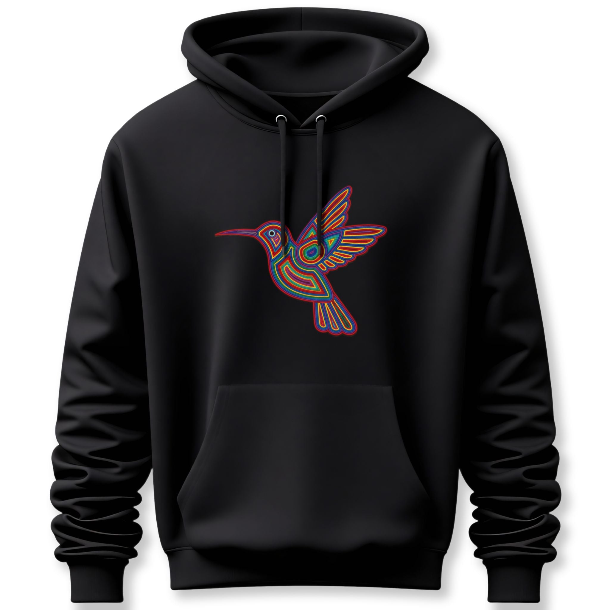This hoodie showcases a mesmerizing hummingbird design, brought to life with a unique, multi-layered outline in a vibrant spectrum of rainbow colors. The intricate lines create a glowing, almost neon effect, giving the impression of movement and energy. The hummingbird itself is a powerful symbol across cultures, representing joy, healing, adaptability, and the lightness of being, reminding us to savor life's sweetness and to find beauty in every moment. This intricate and colorful graphic is a true celebration of nature's vibrant spirit and a wearable emblem of optimism, making it a captivating and inspiring piece for any wardrobe.