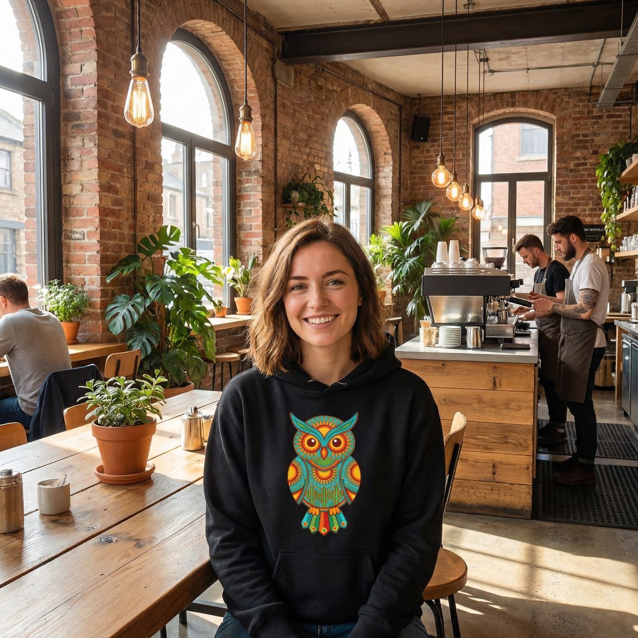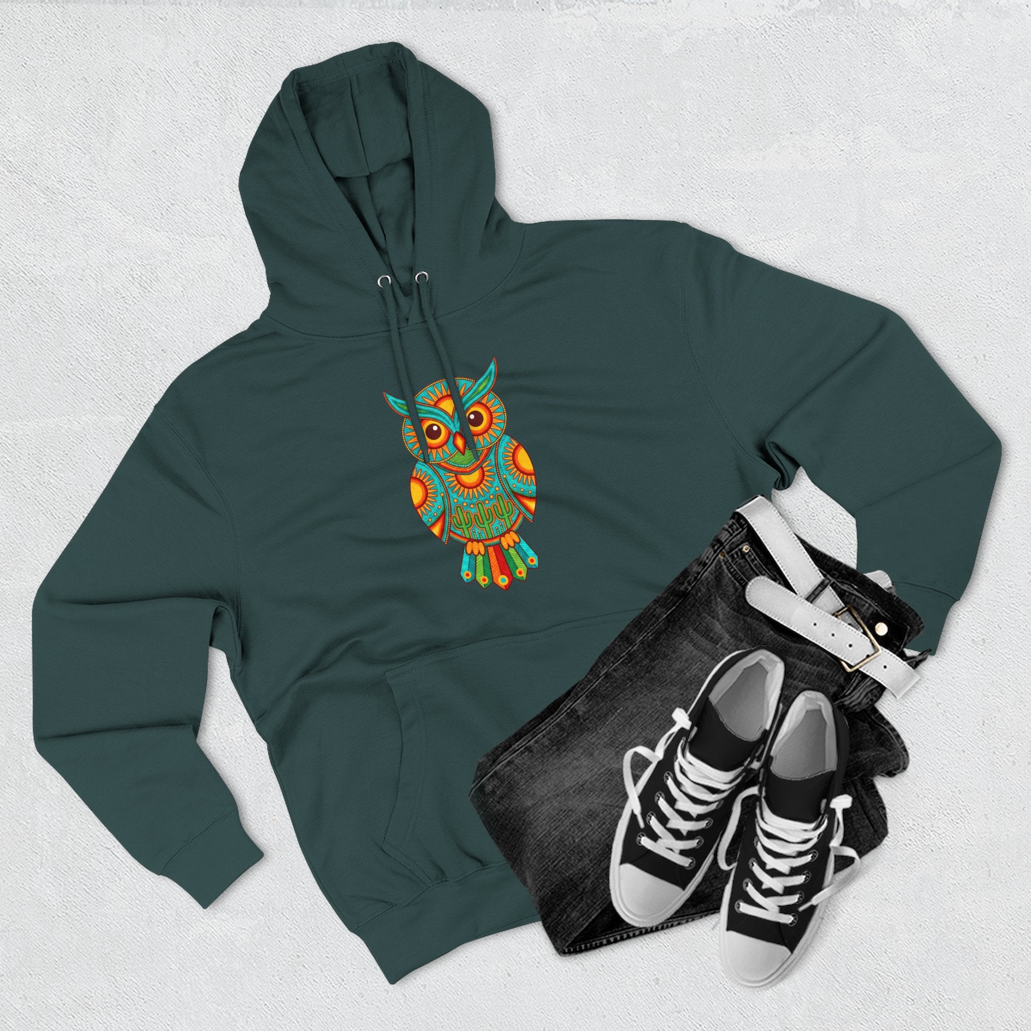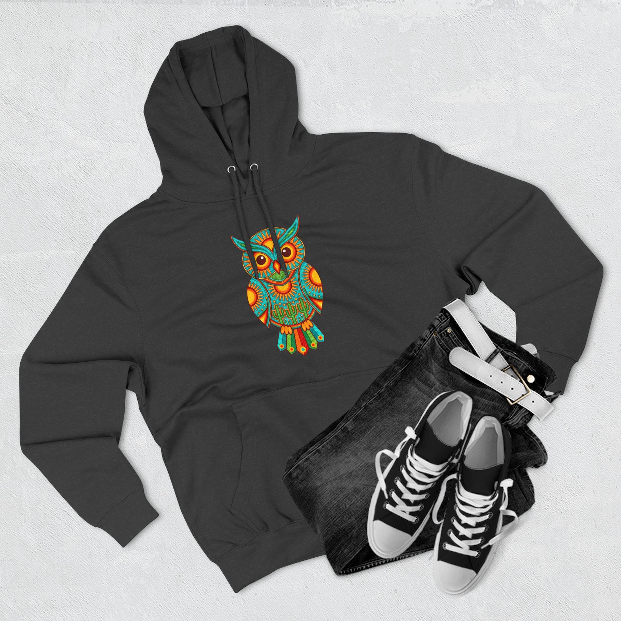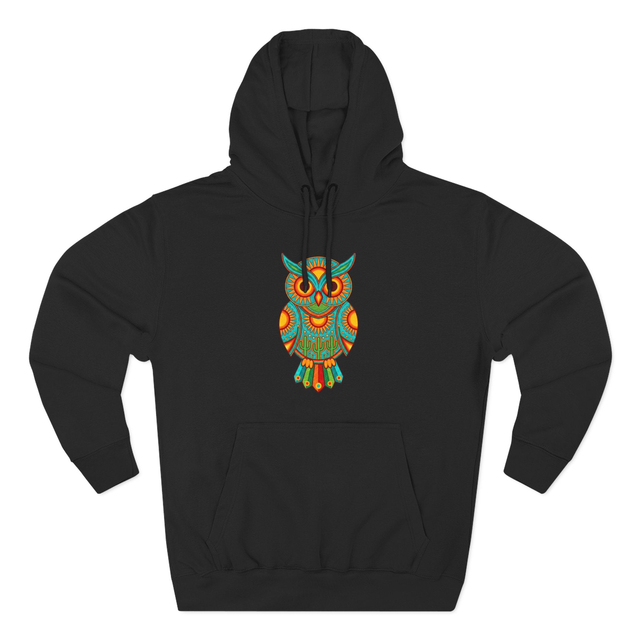 Embrace the profound wisdom and vibrant spirit of the owl with this exceptional pullover. This versatile hoodie will add a unique touch to any outfit, making a statement wherever you go.