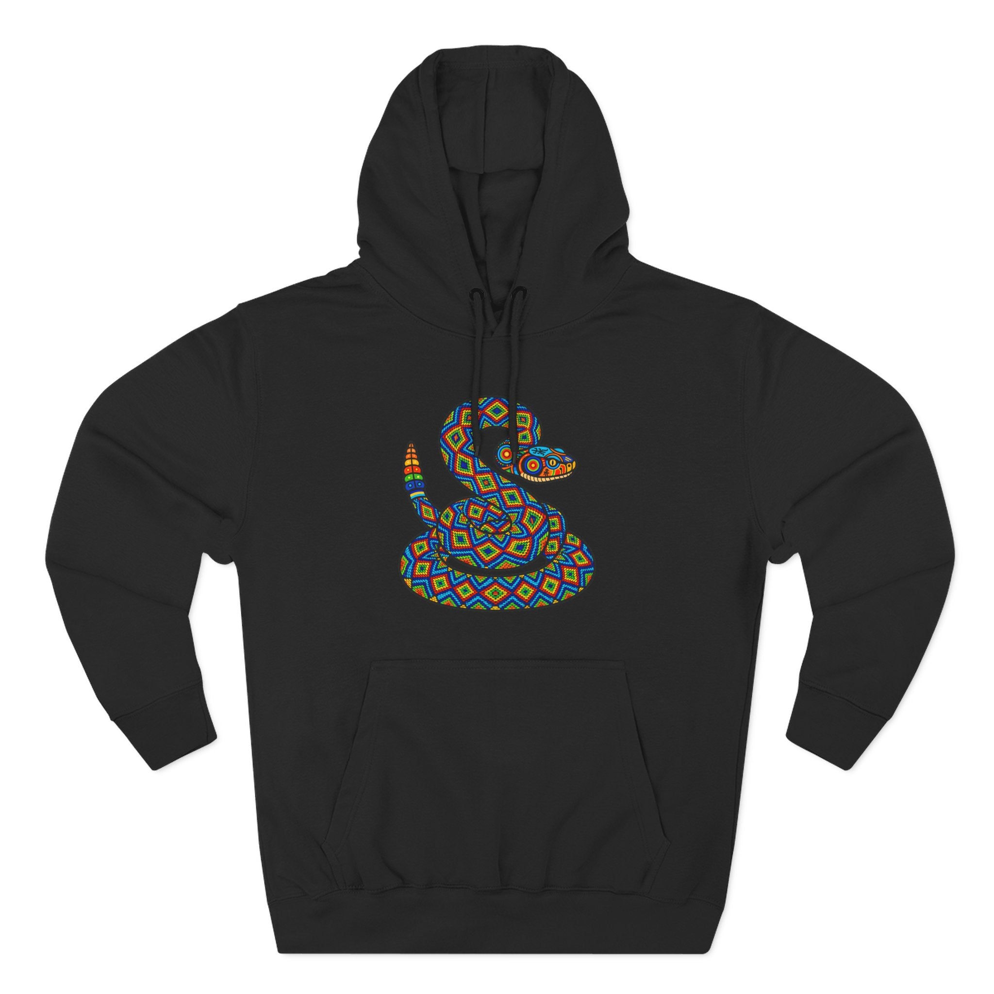 This hoodie showcases a stunning, intricately designed serpent, coiled and ready to strike with vibrant energy. Rendered in a captivating geometric pattern, reminiscent of traditional Mexican Huichol or Alebrije folk art, the snake is brought to life with a kaleidoscope of bright colors – blues, greens, yellows, reds, and oranges. In many cultures, the serpent symbolizes transformation, healing, wisdom, and renewal. Here, its bold and colorful depiction evokes a sense of vibrant life force, protection, and artistic joy. This unique graphic is a celebration of intricate artistry and powerful cultural symbolism, perfect for those who appreciate depth and eye-catching designs, making it a standout piece for any wardrobe.