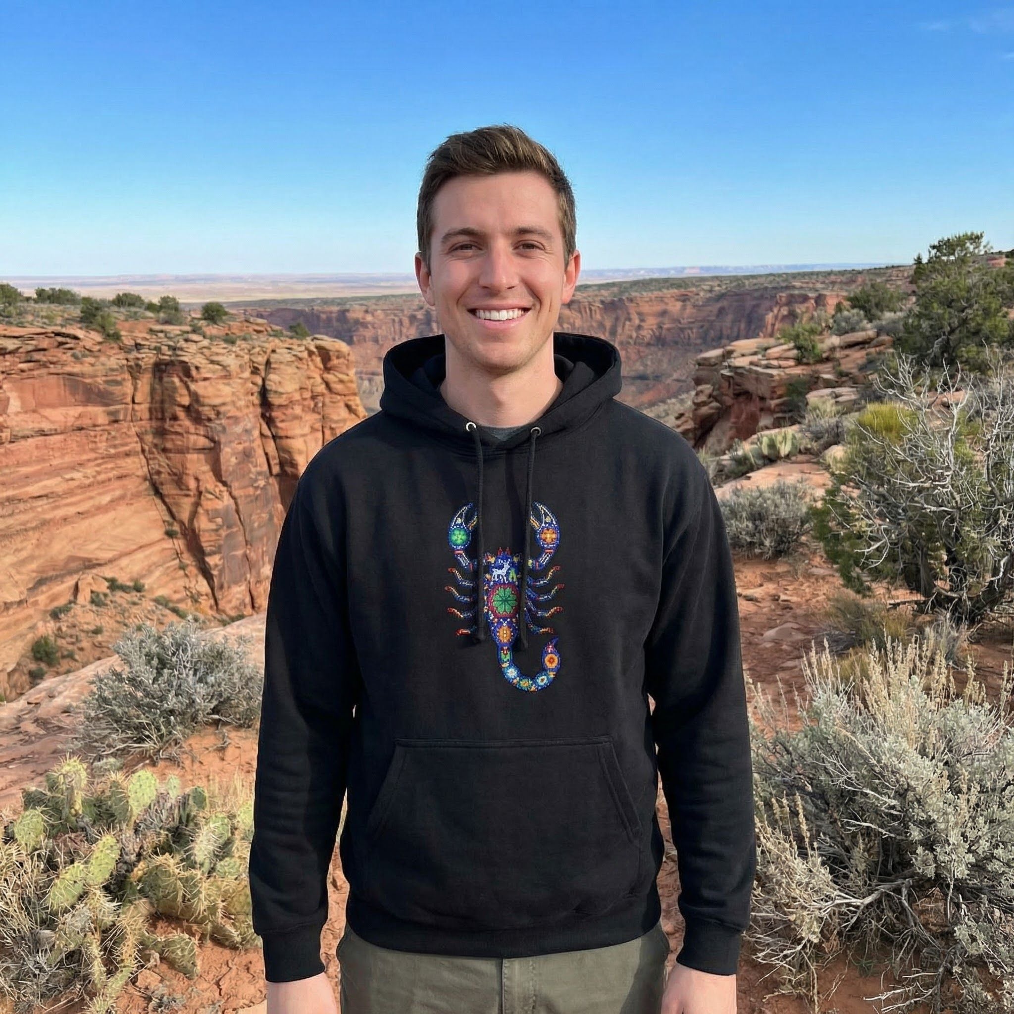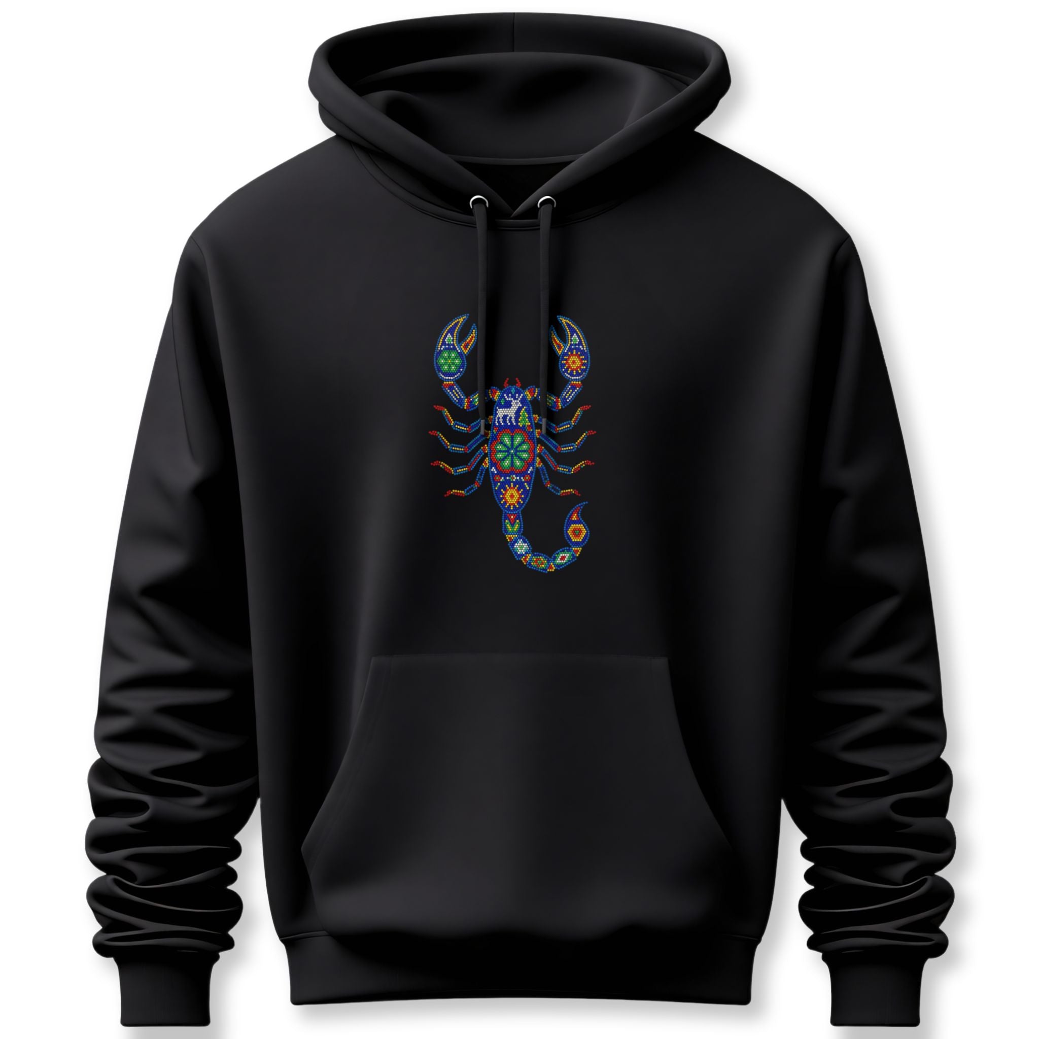 Embrace the powerful energy and artistic beauty of the Huichol Scorpion. This versatile hoodie pairs perfectly with jeans, cargo pants, or even layered over a simple tee, allowing you to showcase a piece of wearable art that connects you to ancient traditions and modern style.