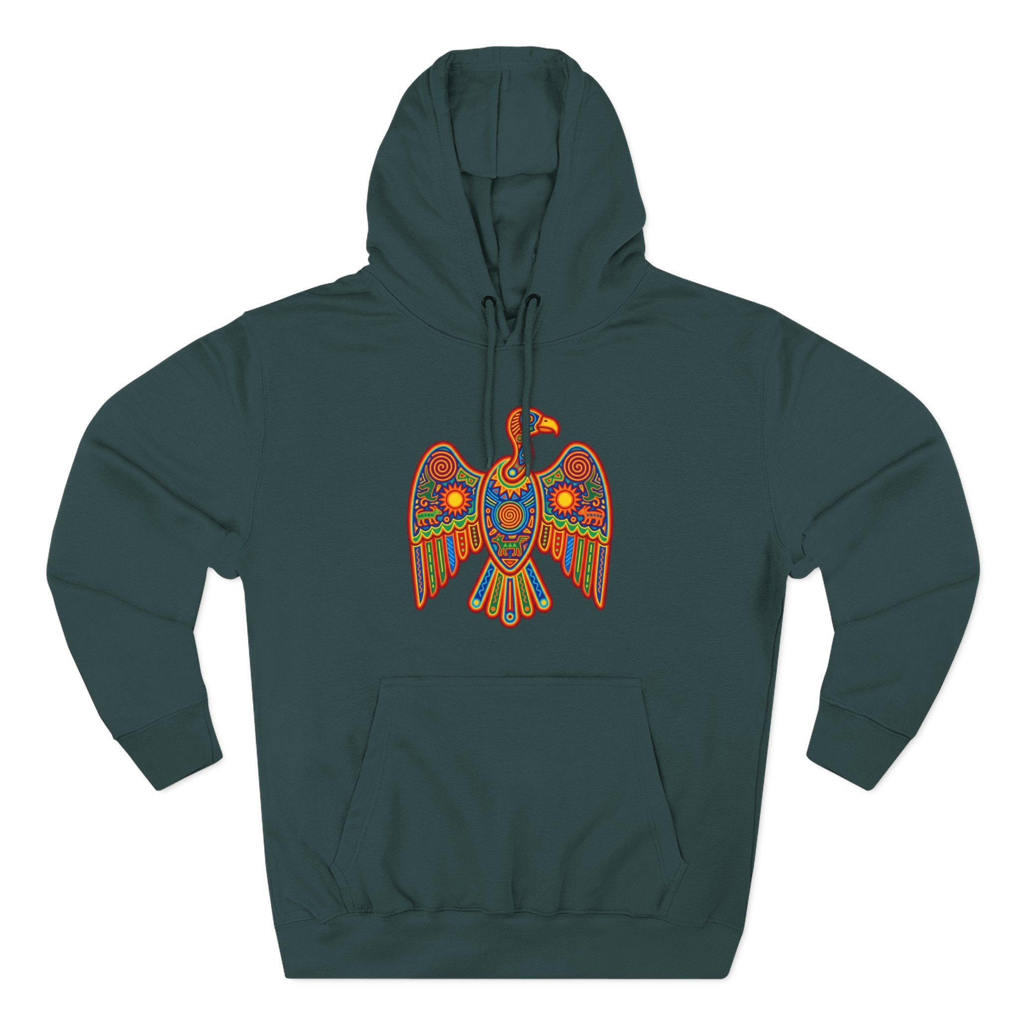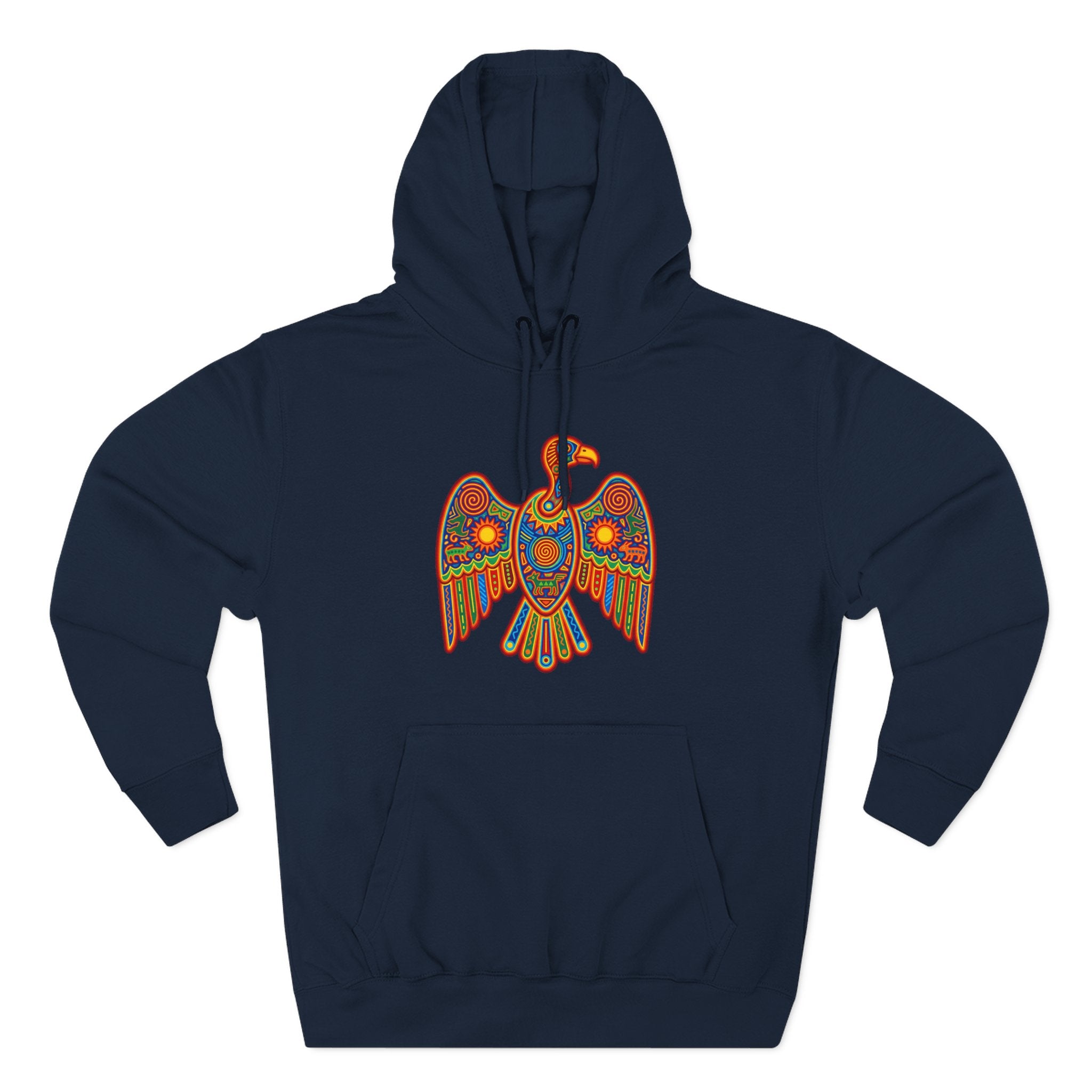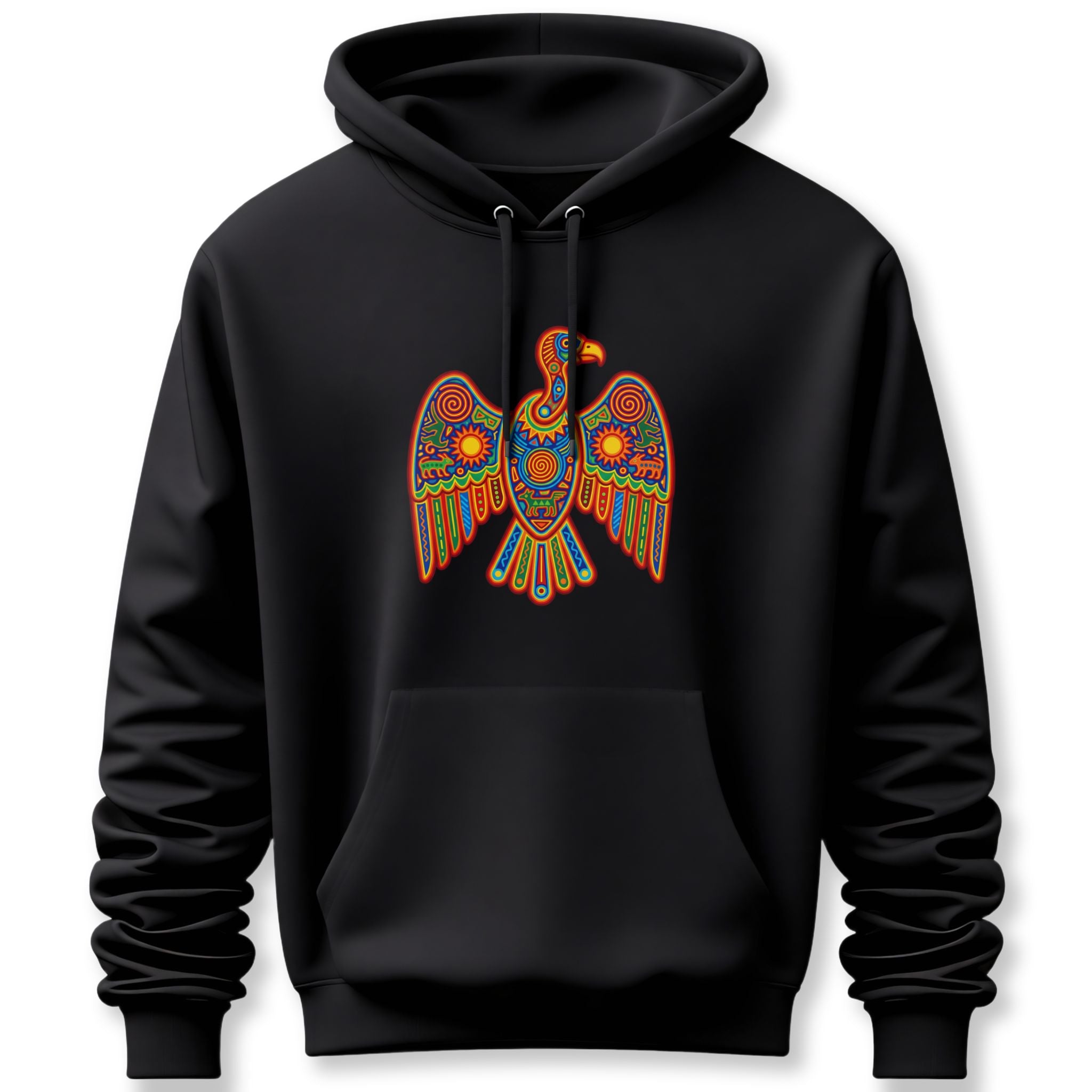 This hoodie showcases a magnificent, stylized eagle rendered in an explosion of vibrant colors and intricate patterns. Inspired by the rich tapestry of indigenous and folk art, the design features mesmerizing spirals, sun motifs, and geometric shapes in a harmonious blend of red, orange, yellow, green, and blue. This 'Ancestral Eagle' symbolizes power, freedom, clear vision, and a deep connection to heritage and the spiritual world. Its detailed artistry and radiant colors make it a captivating and unique statement piece, perfect for those who appreciate cultural art, spiritual symbolism, and making a bold, colorful statement.