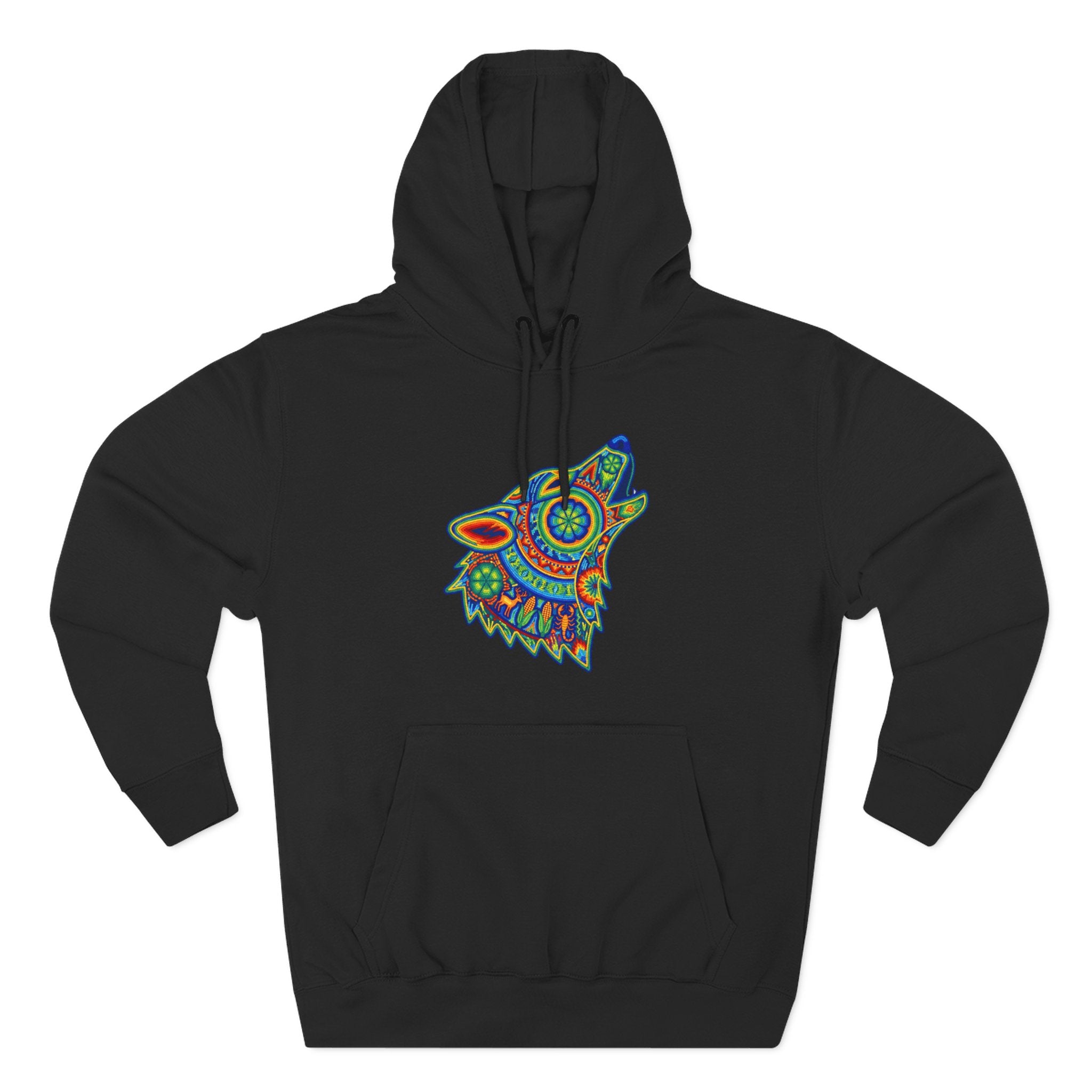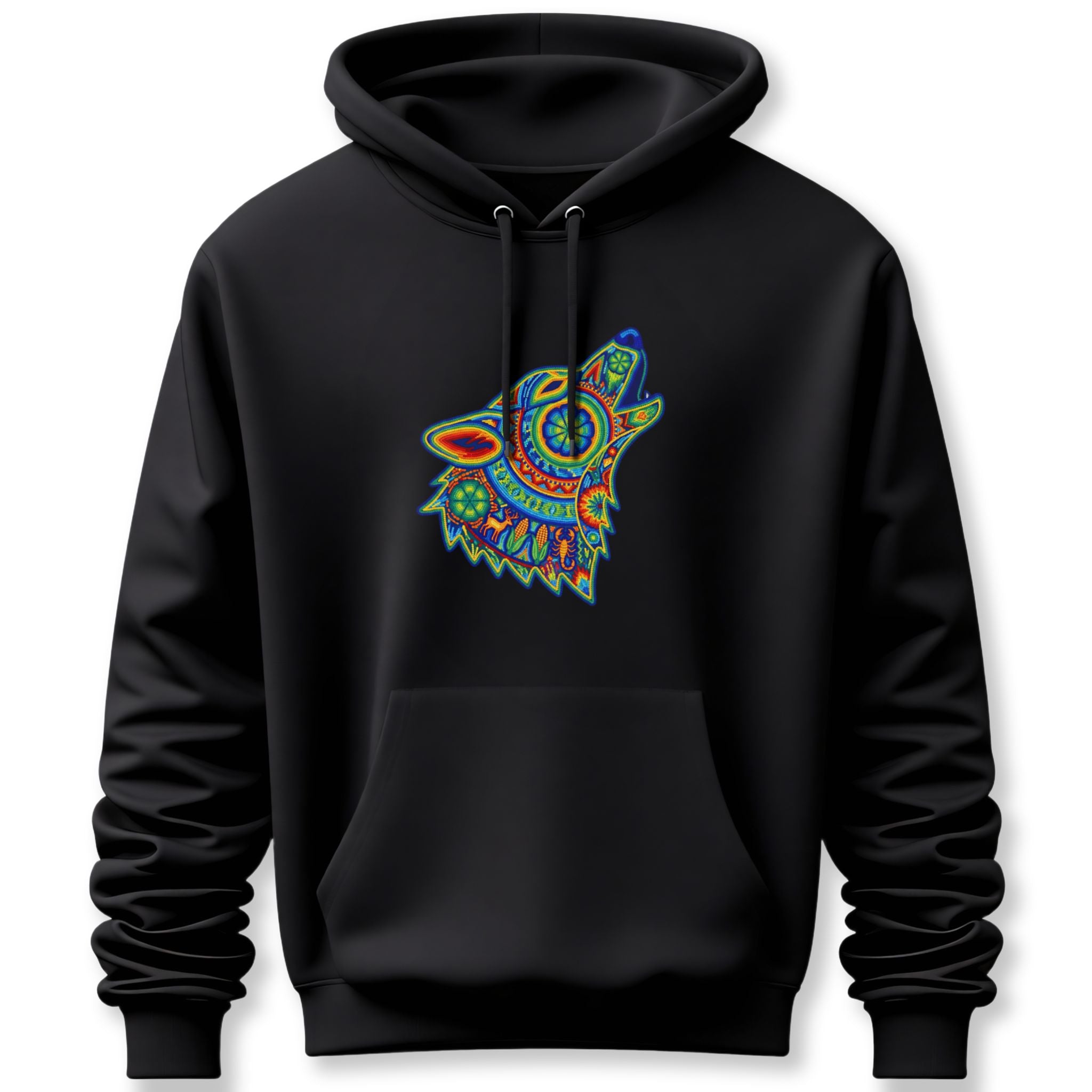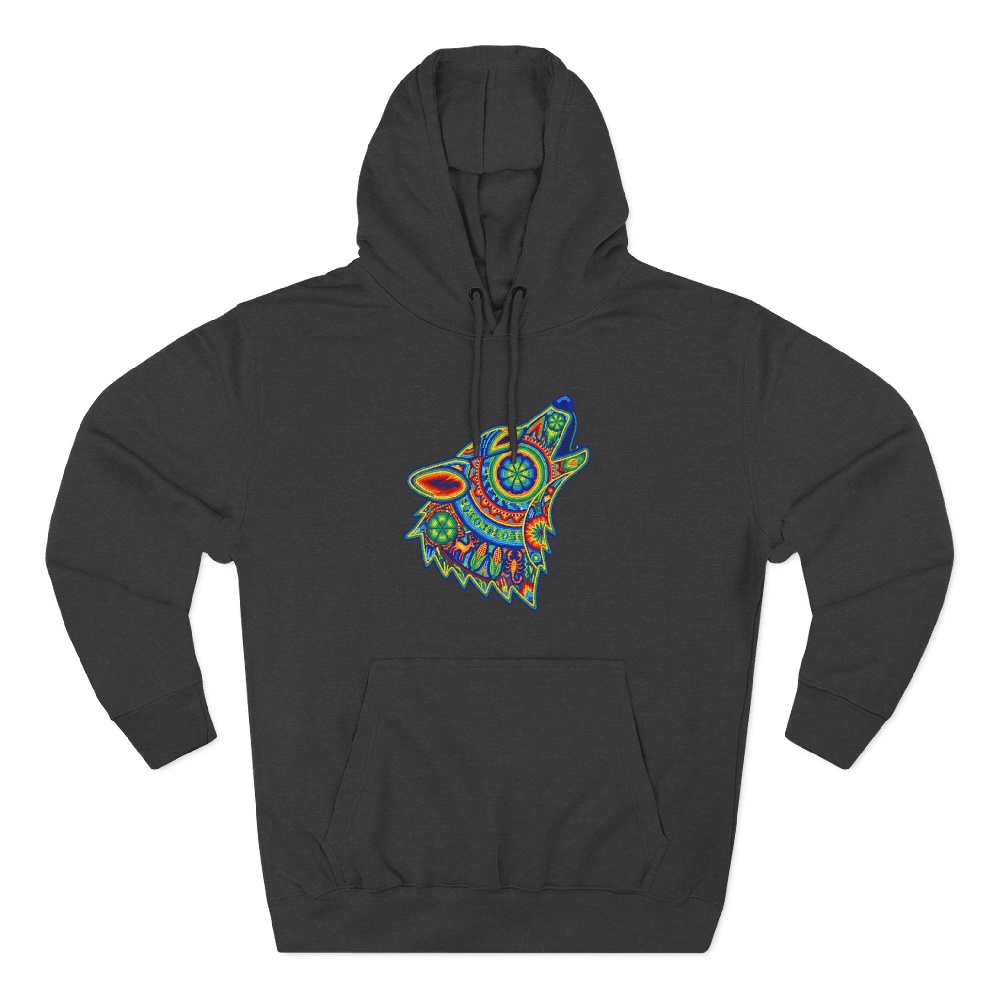 This hoodie features a stunning, intricately designed wolf head, captured mid-howl, rendered in a vibrant, kaleidoscopic style. Inspired by rich folk art traditions, the wolf is adorned with a mesmerizing array of colorful patterns and detailed motifs, evoking a sense of ancient wisdom, powerful intuition, and the untamed spirit of the wilderness. The howling posture symbolizes communication, freedom, and a deep connection to primal energies. This unique graphic is a celebration of art and nature, perfect for those who appreciate deep symbolism and eye-catching aesthetics, making it a bold and intricate conversation starter for any wardrobe.