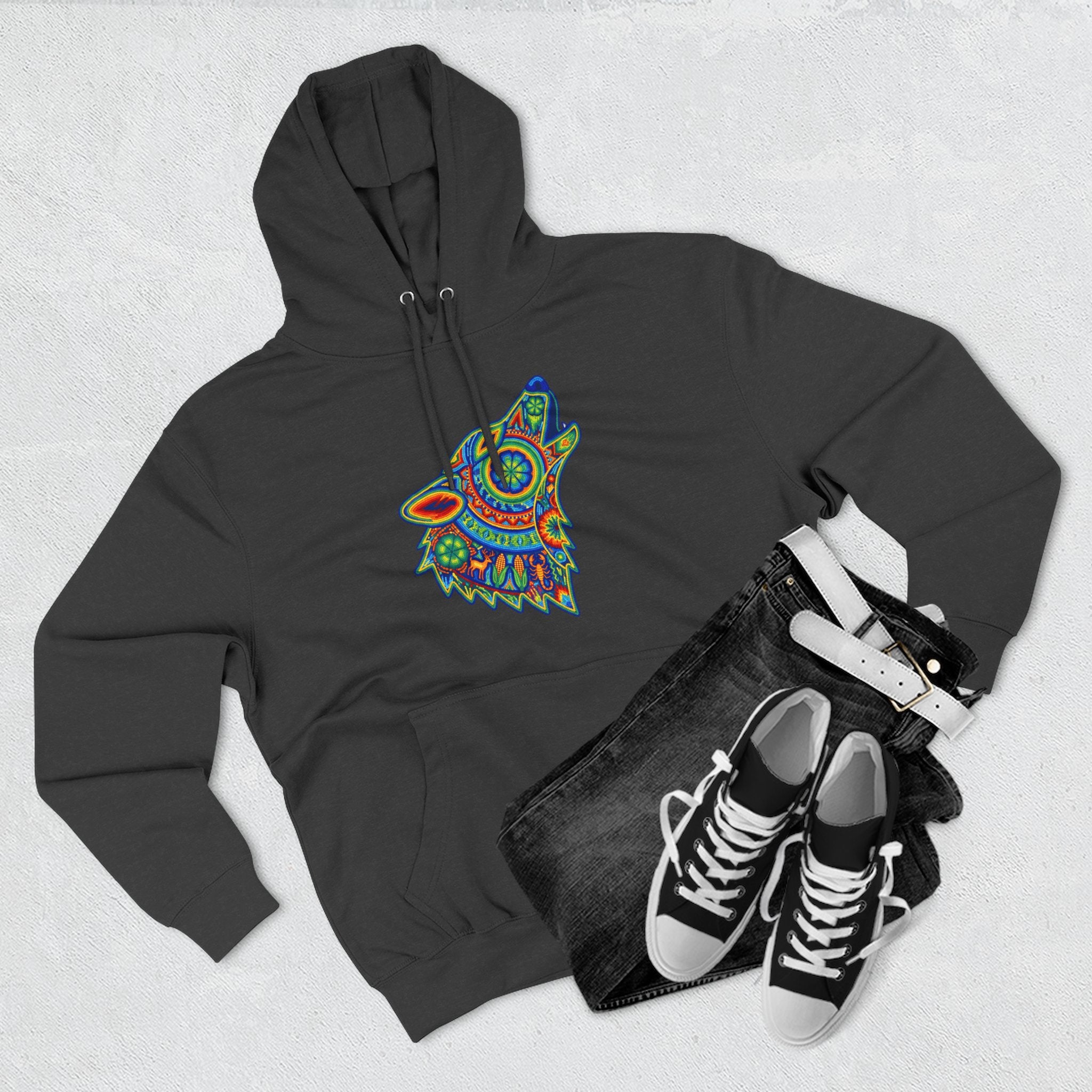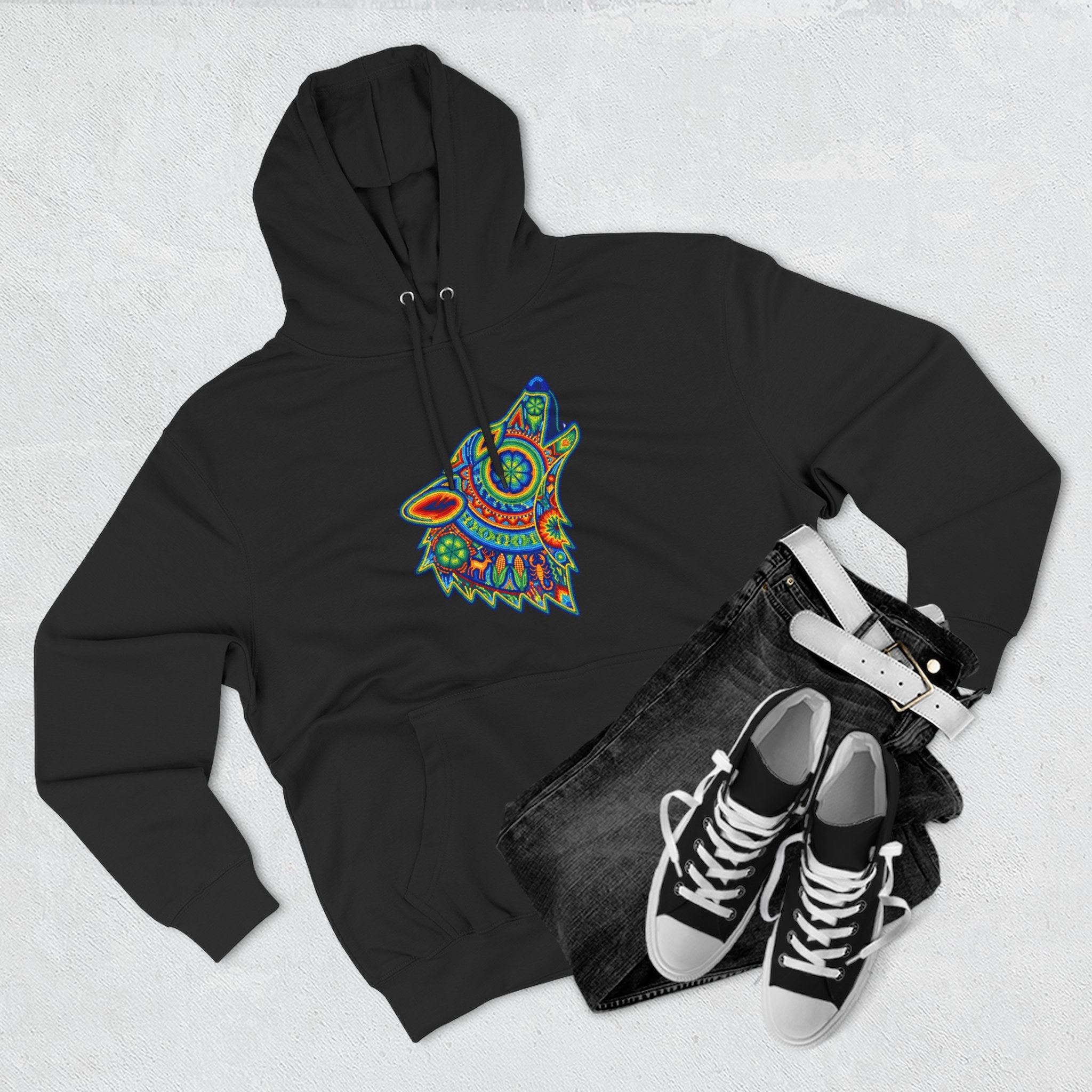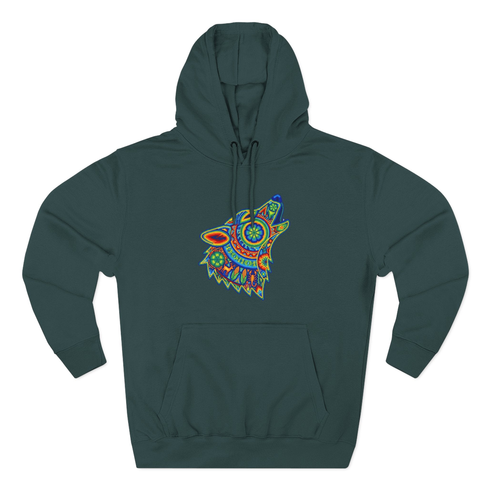 This hoodie features a stunning, intricately designed wolf head, captured mid-howl, rendered in a vibrant, kaleidoscopic style. Inspired by rich folk art traditions, the wolf is adorned with a mesmerizing array of colorful patterns and detailed motifs, evoking a sense of ancient wisdom, powerful intuition, and the untamed spirit of the wilderness. The howling posture symbolizes communication, freedom, and a deep connection to primal energies. This unique graphic is a celebration of art and nature, perfect for those who appreciate deep symbolism and eye-catching aesthetics, making it a bold and intricate conversation starter for any wardrobe.