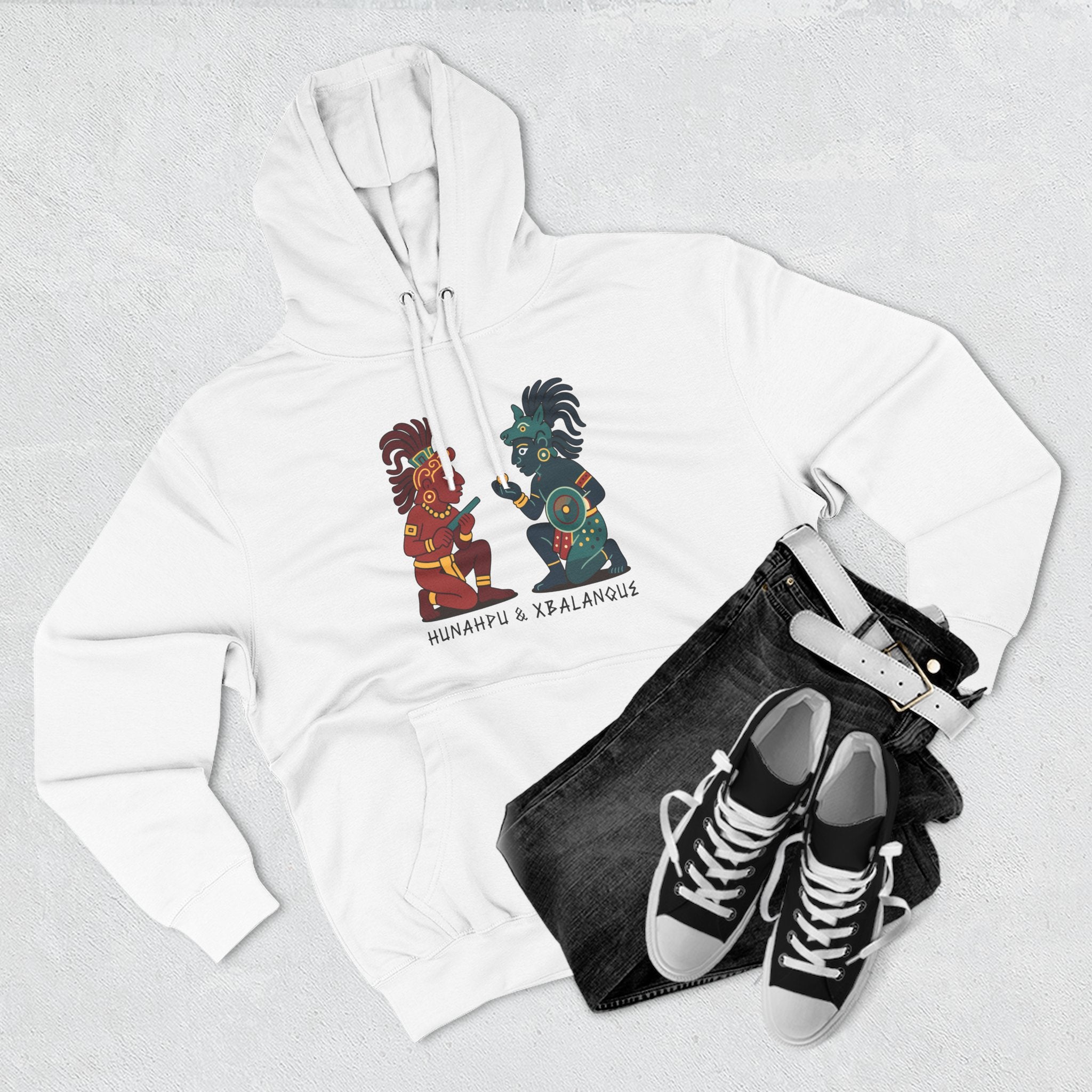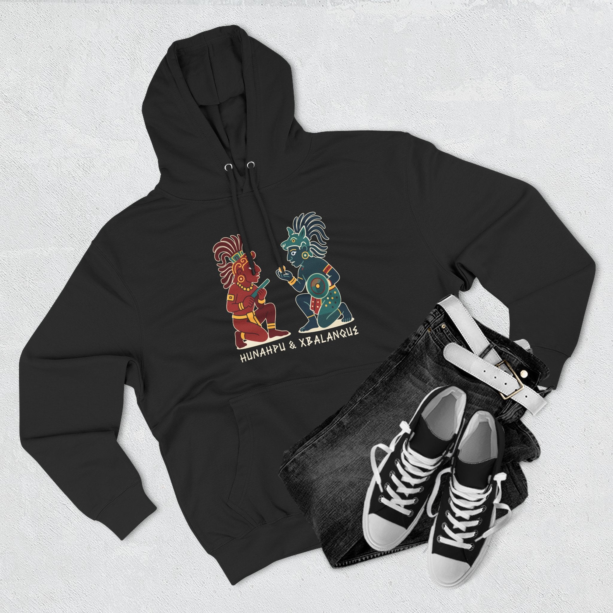 Pair this hoodie with your favorite casual attire to showcase a piece of timeless folklore. The design is versatile, allowing for various styling options. Embrace the heroic spirit and deep cultural significance of the Mayan Hero Twins with this stylish and meaningful hoodie.