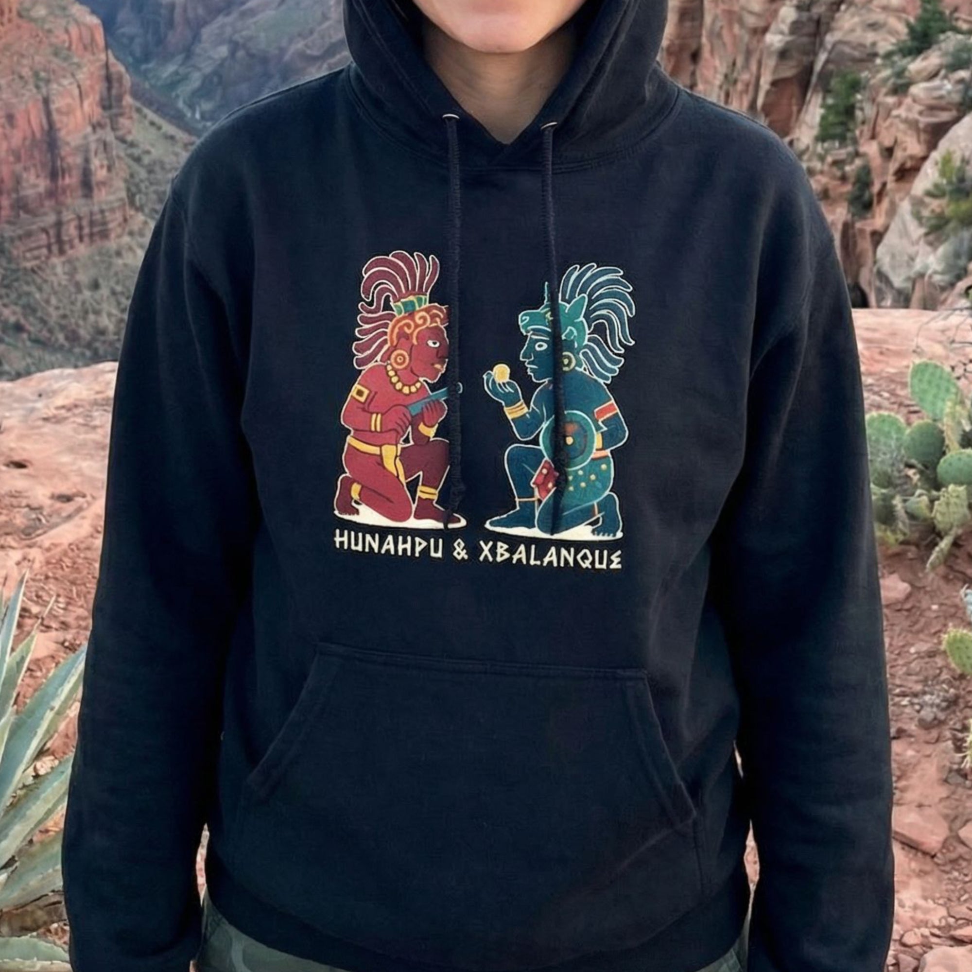 This hoodie features a striking graphic inspired by ancient Mesoamerican art, depicting the legendary Mayan Hero Twins, Hunahpu and Xbalanque. Rendered in a distinct stylized fashion with rich, earthy tones, the design captures the essence of their epic adventures. From the revered Popol Vuh, these mythical brothers embody themes of courage, resilience, and the triumph of light over darkness, symbolizing spiritual rebirth and the balance of opposing forces. This intricate and culturally significant design is a captivating statement piece for those who appreciate profound storytelling and ancient wisdom.