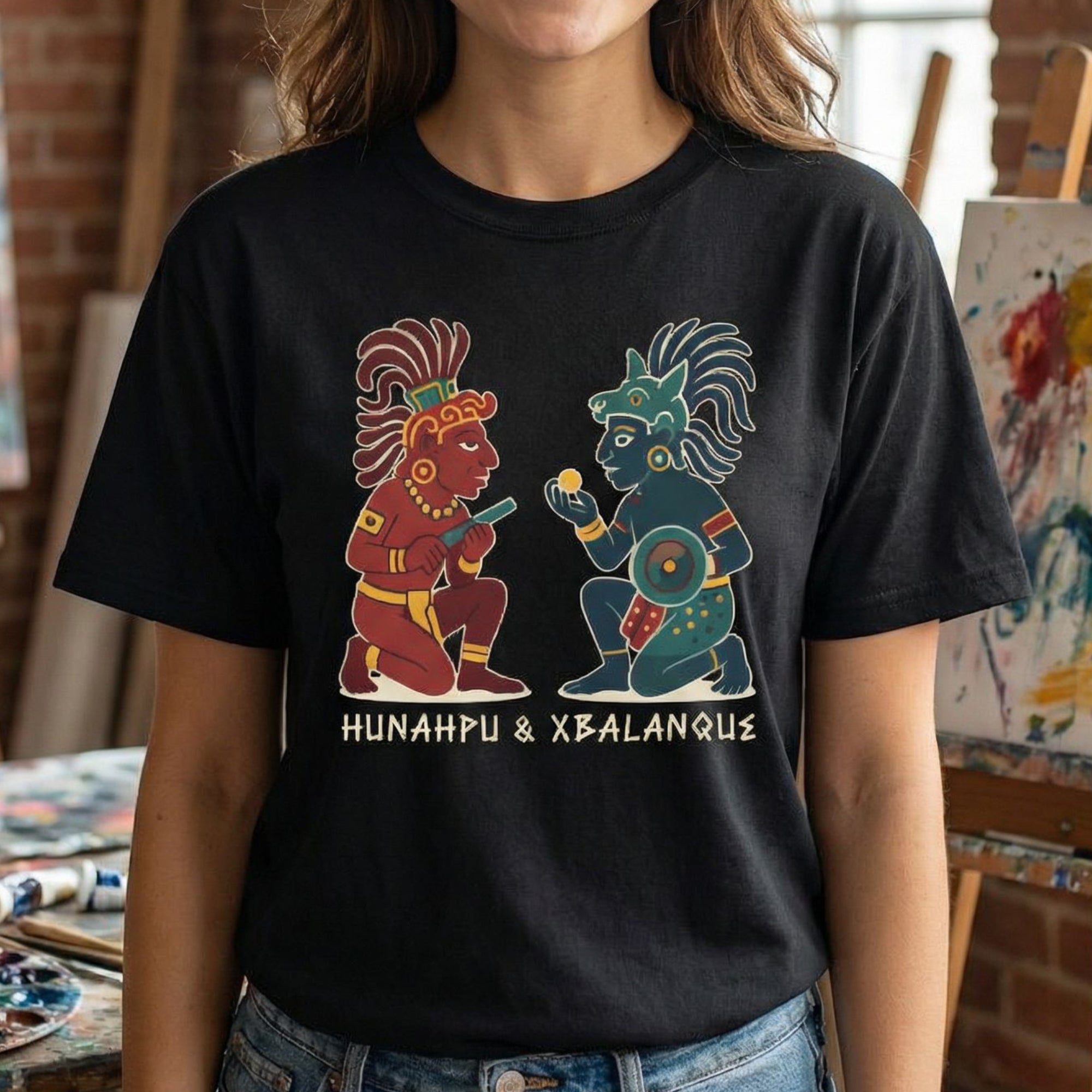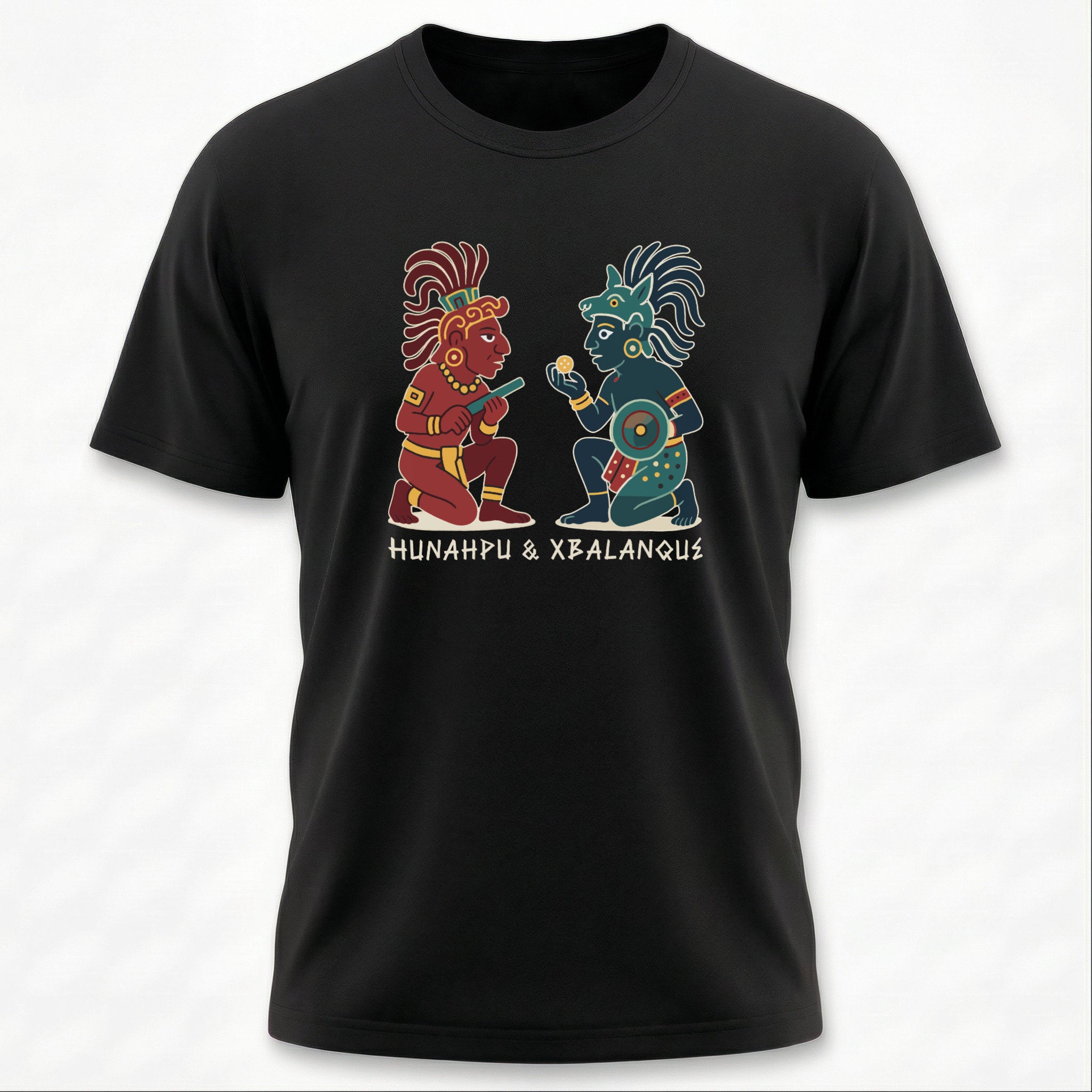 This t-shirt features a striking graphic inspired by ancient Mesoamerican art, depicting the legendary Maya Hero Twins, Hunahpu and Xbalanque, in their iconic stylized forms. Central figures in the Popol Vuh, they represent duality, courage, and the triumph of ingenuity over the forces of the underworld. The intricate artwork beautifully captures their distinct characteristics and roles, making it a powerful tribute to one of the world's richest mythologies. This design is a fascinating conversation starter and a unique piece for those who appreciate cultural depth and epic tales.