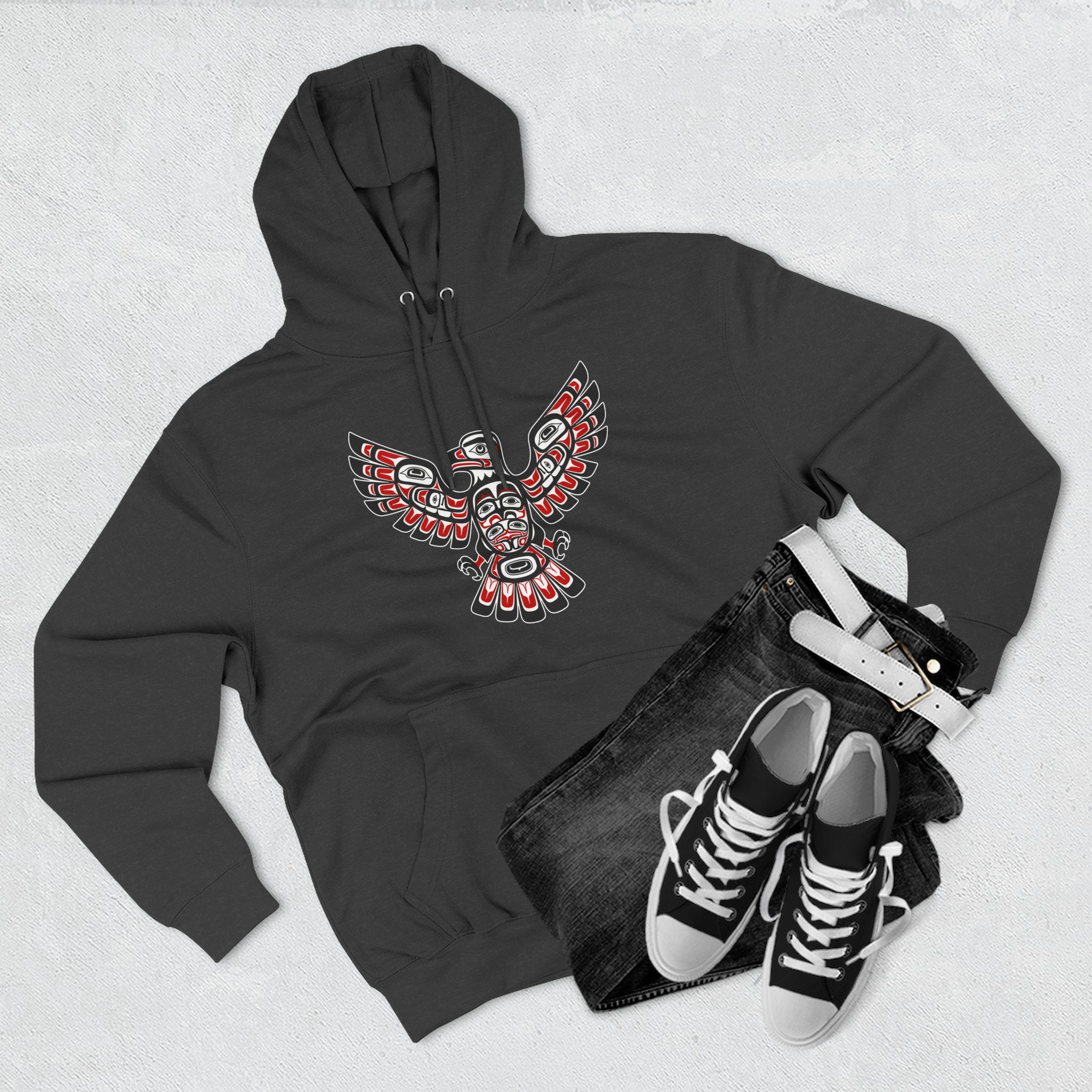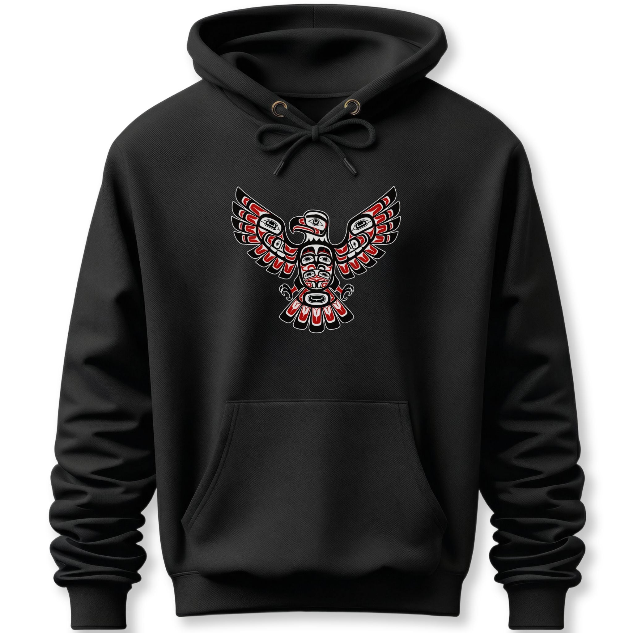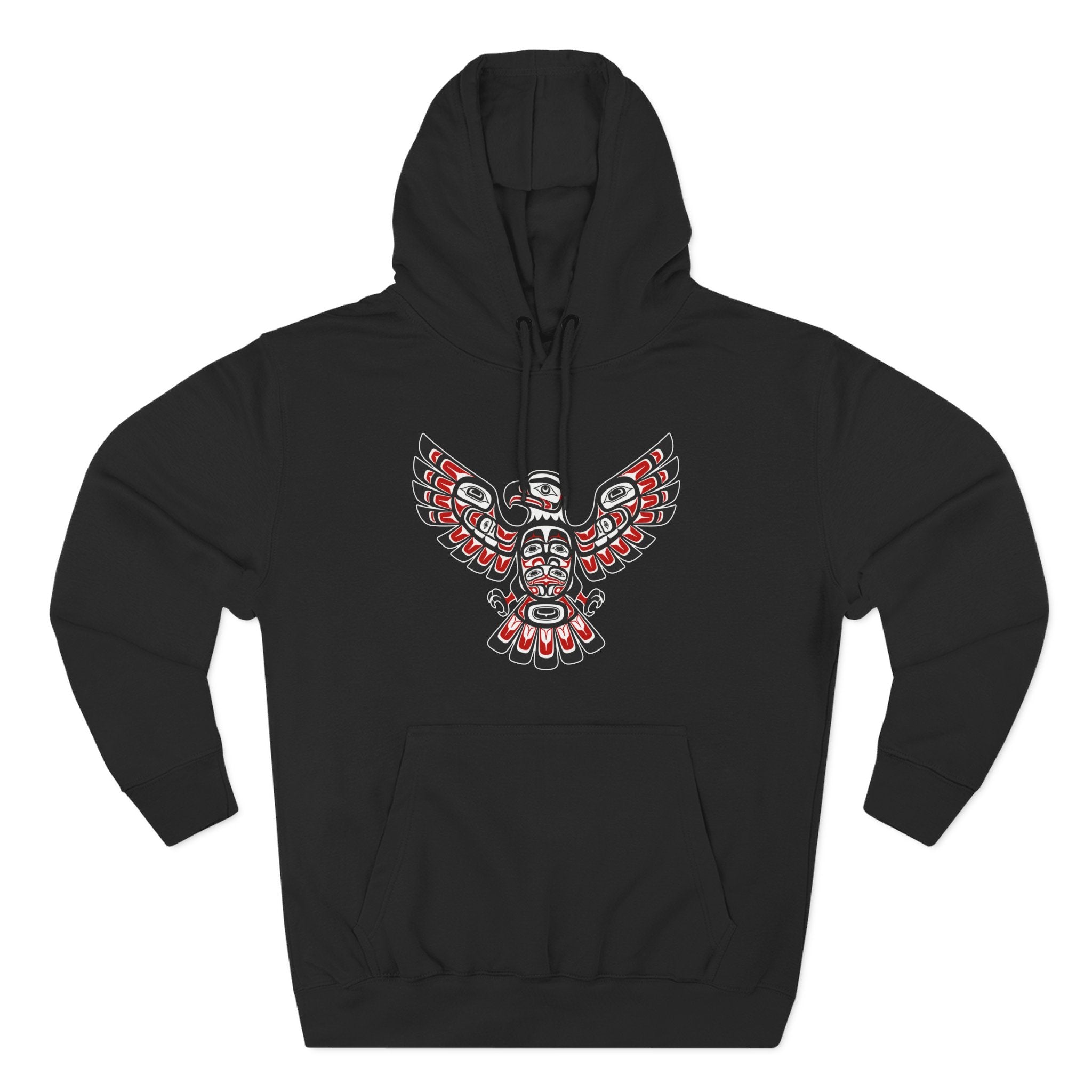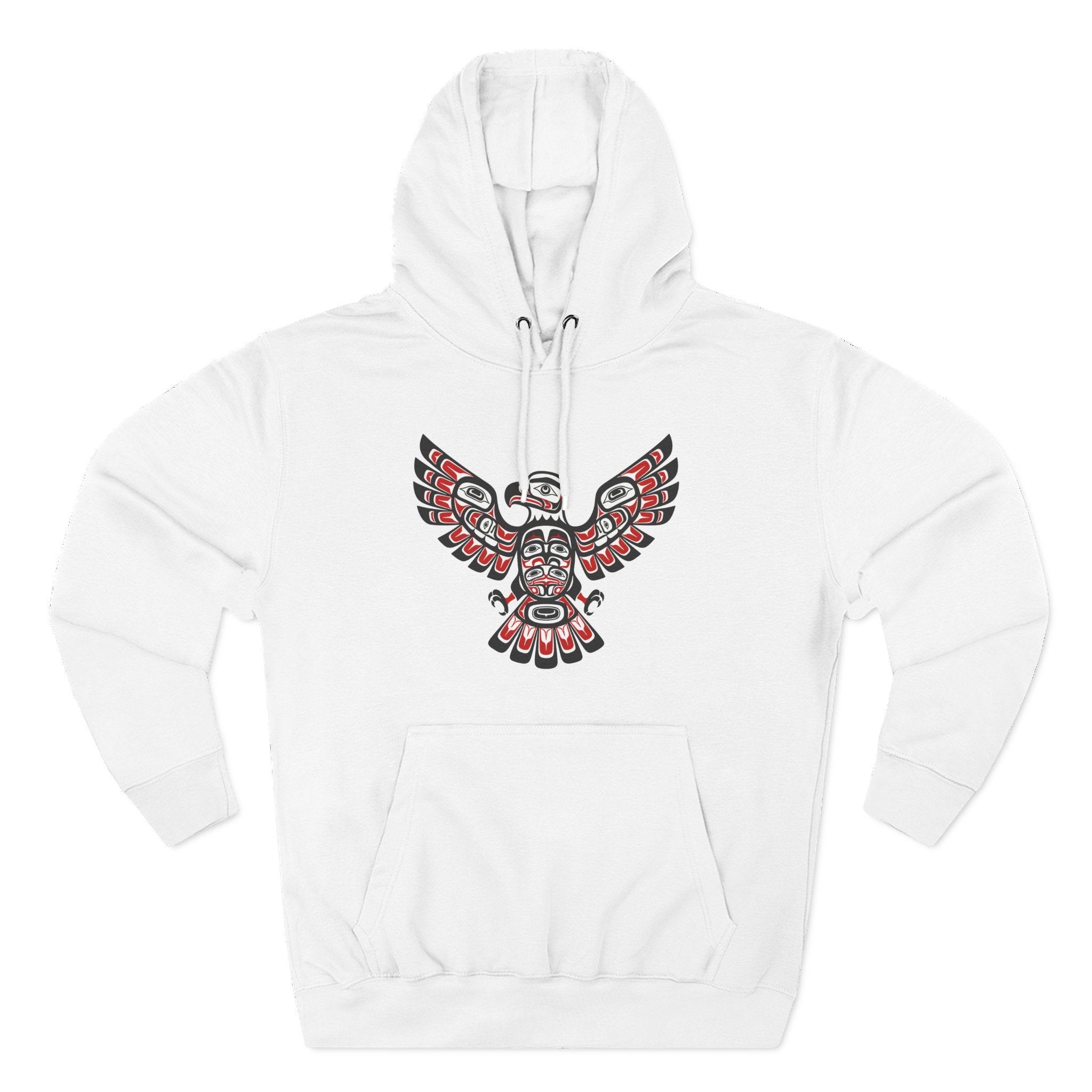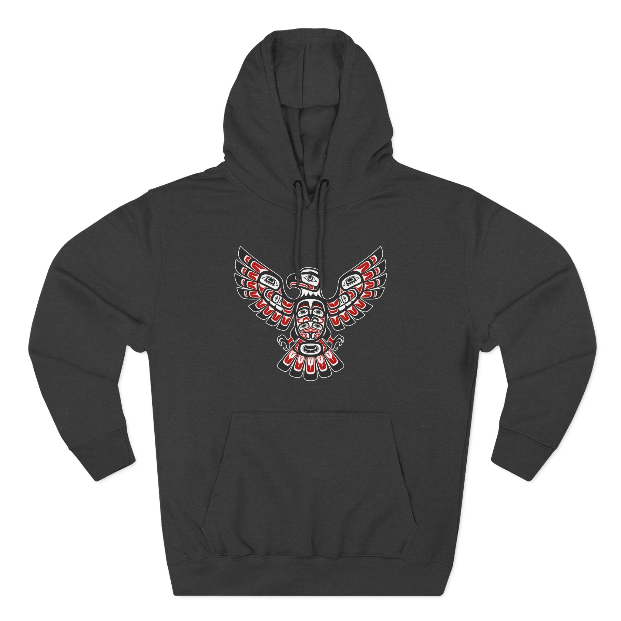 This hoodie showcases a captivating design of an eagle rendered in the distinctive Formline art style of the Pacific Northwest Indigenous peoples. Characterized by its bold black outlines, striking red and white/grey accents, and intricate ovoid and U-form shapes, the design depicts a majestic eagle with powerful, outstretched wings. In many Indigenous cultures, the Eagle is a profound symbol of wisdom, power, peace, and spiritual connection. It often represents vision, leadership, and a bridge between the physical and spiritual worlds. The stylized figure within the eagle's body hints at a deeper spirit or ancestral connection. This unique graphic is a powerful tribute to a rich cultural heritage, perfect for those who appreciate deep symbolism and unique artistic expression, making it an eye-catching statement piece.