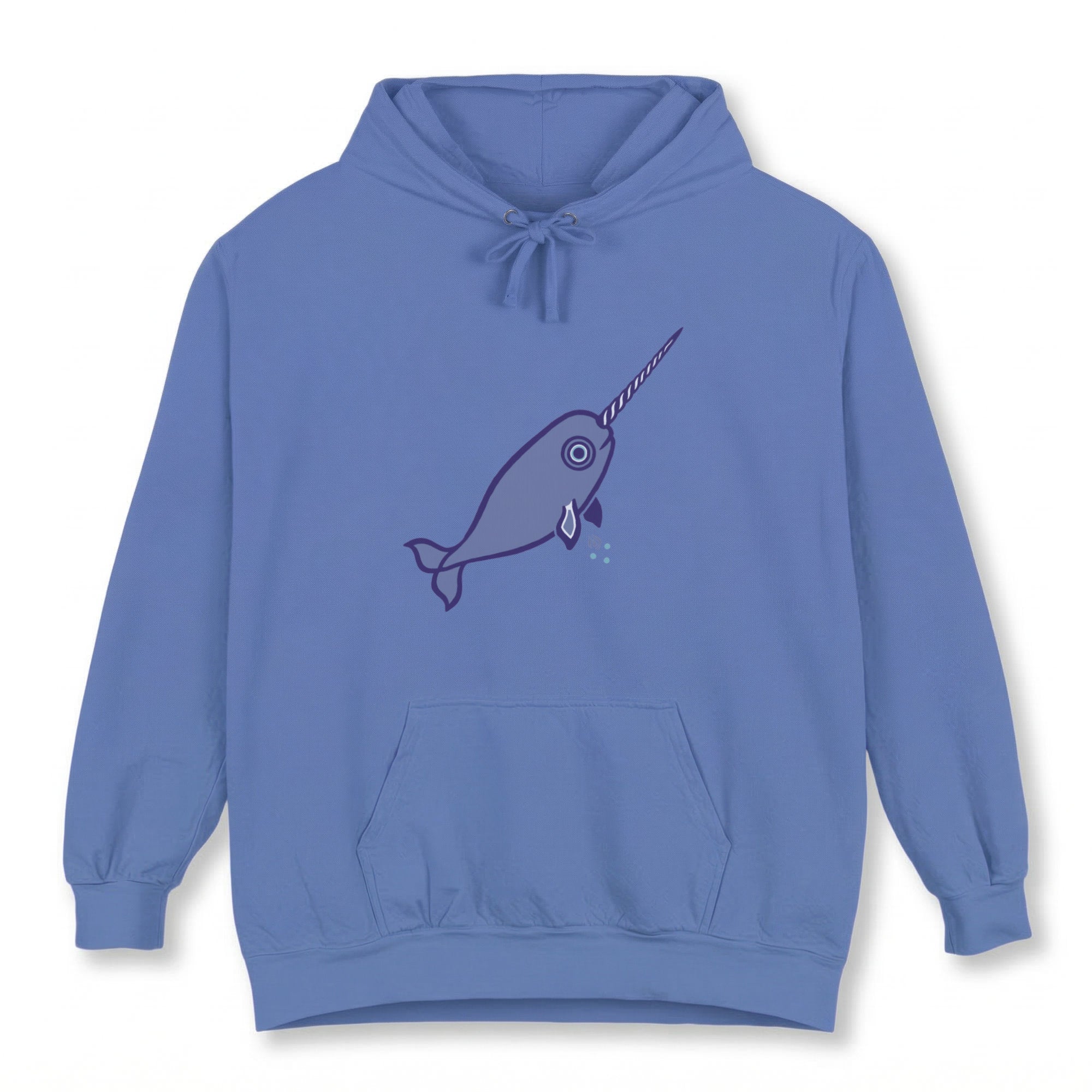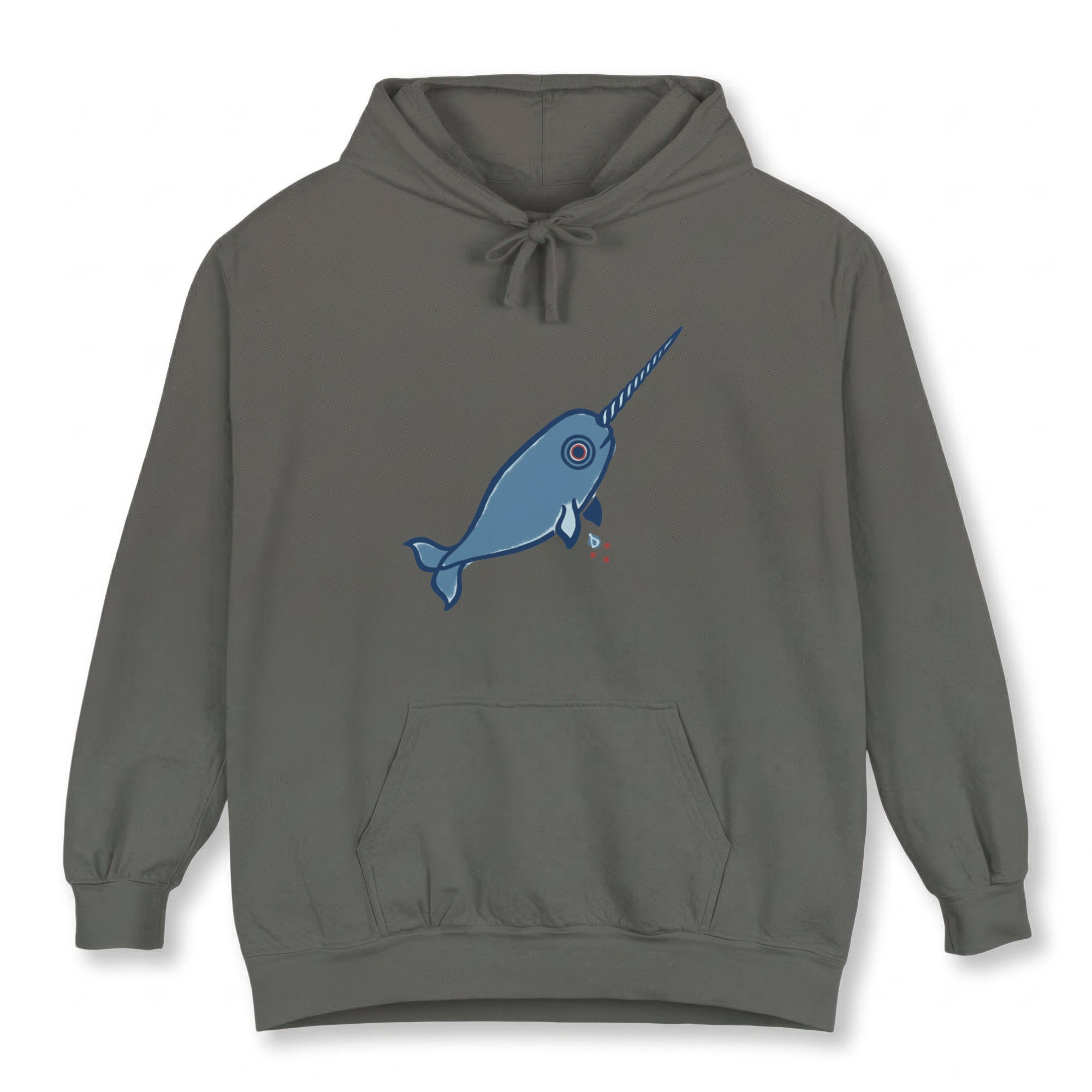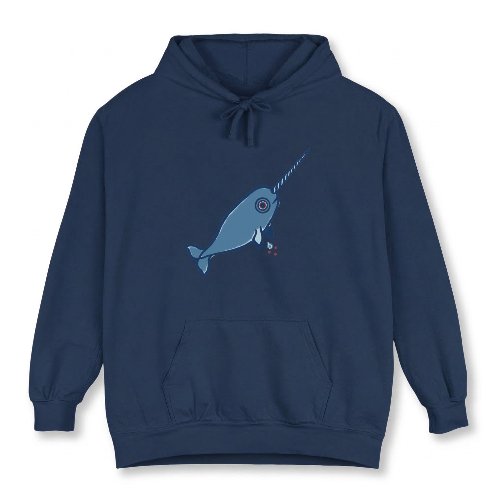 This hoodie showcases a captivating graphic of a blue narwhal, famously known as the 'unicorn of the sea,' complete with its distinctive spiraled tusk. Adding a playfully edgy twist, the design features subtle red drips around its mouth, hinting at a recent 'snack' or a delightfully mischievous personality. It's a unique take on marine life that blends charm with a touch of mysterious allure. This design is bold and eye-catching, perfect for those who appreciate quirky humor, unique animal graphics, and a touch of the unexpected in their wardrobe.