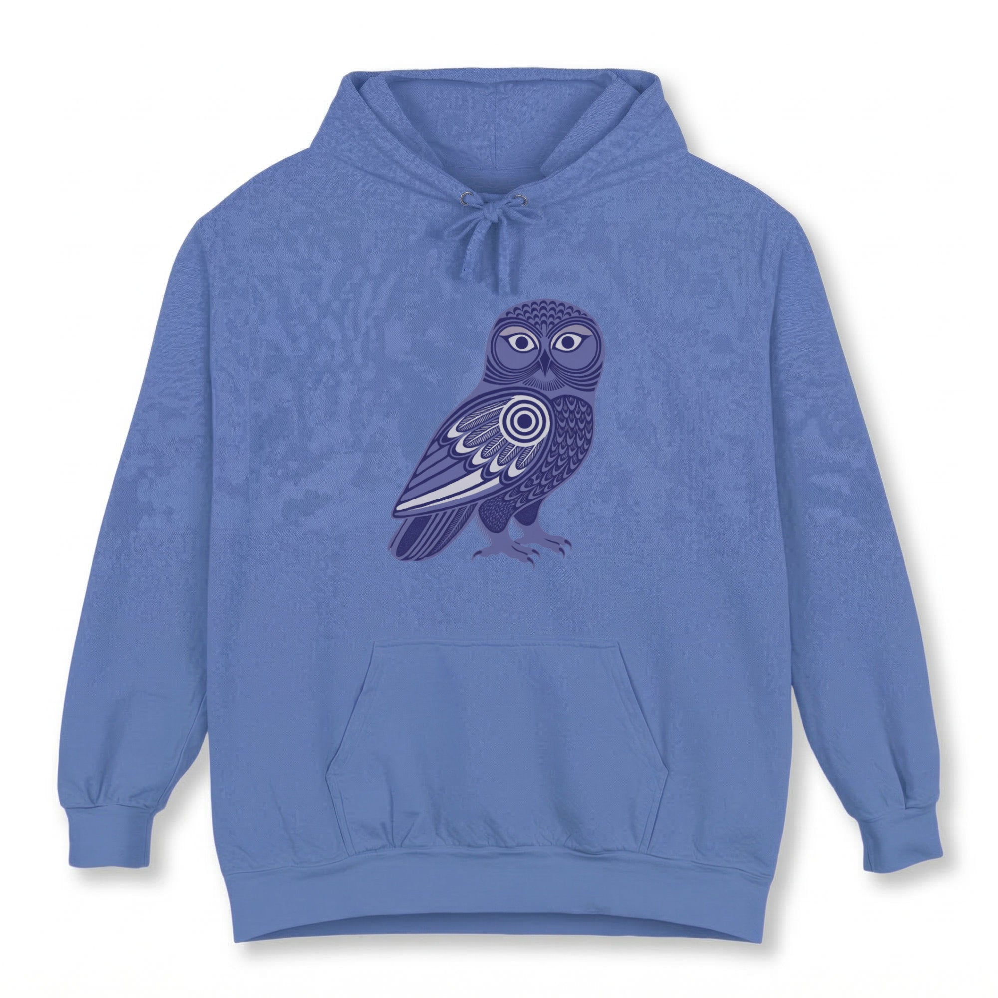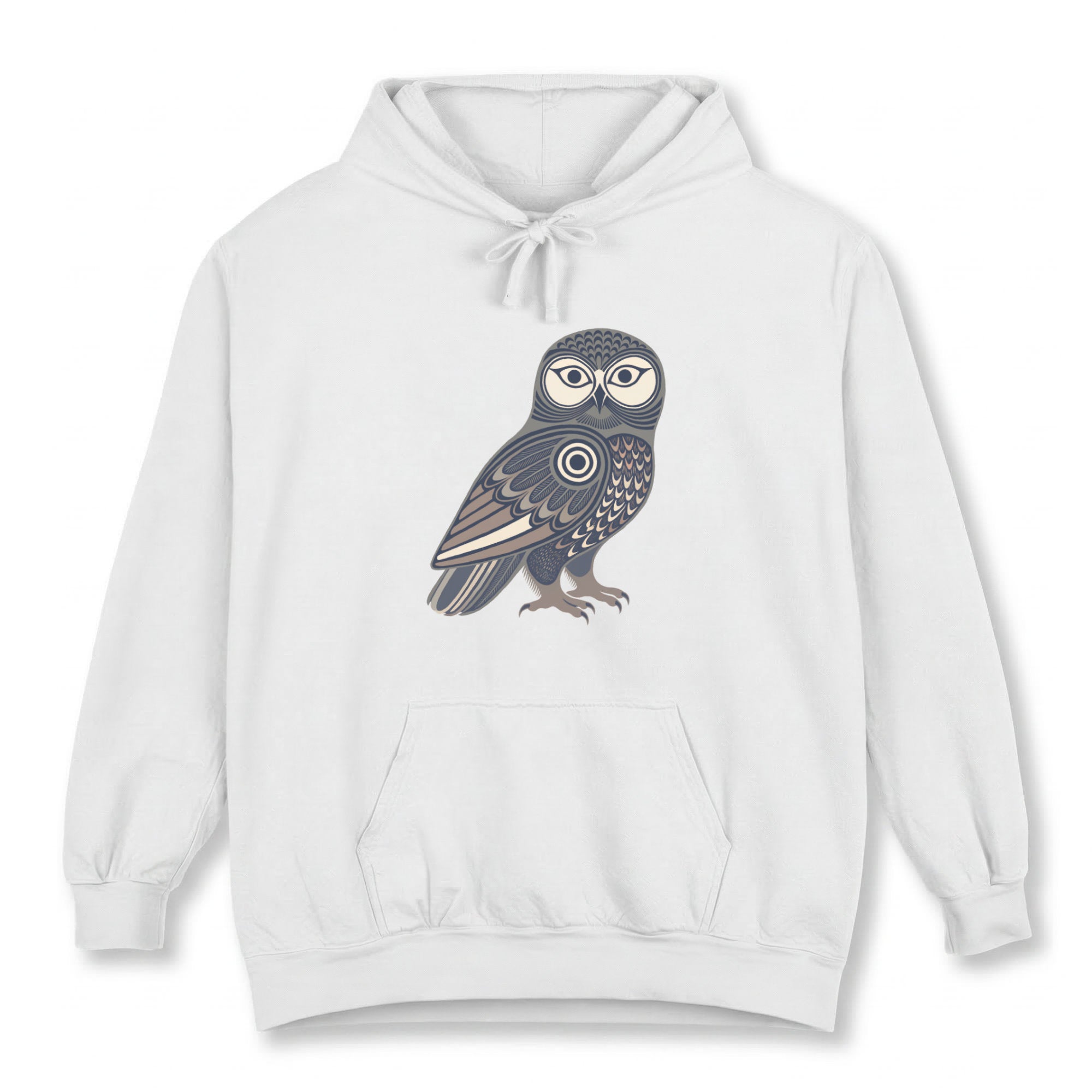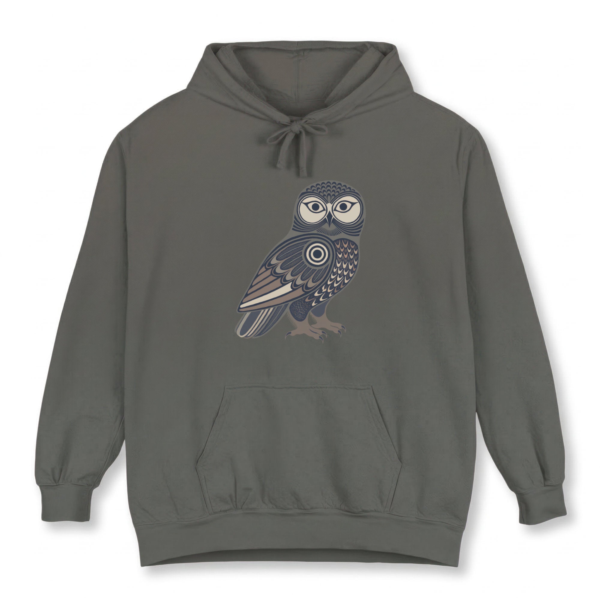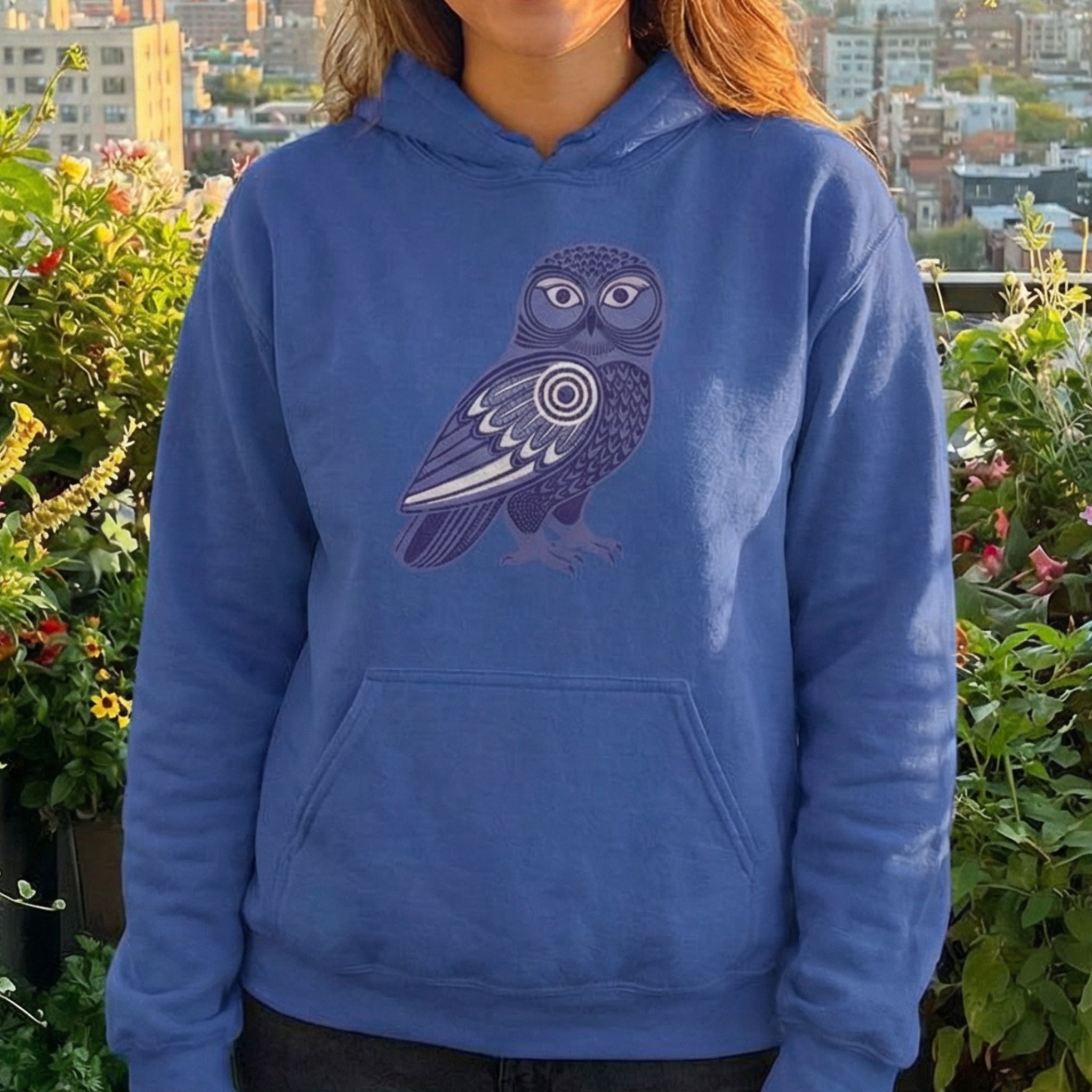 This hoodie features a beautifully stylized owl design, rendered in an intricate artistic style reminiscent of ancient pottery or mosaic art. The owl showcases intricate geometric patterns and large, watchful eyes, combining a sophisticated palette of muted blues, browns, and creams. The owl, a timeless symbol across cultures, represents wisdom, knowledge, intuition, and mystery. This particular depiction evokes the profound wisdom often associated with these nocturnal guardians, perhaps even echoing the revered 'Owl of Athena' from ancient Greek mythology. It's a thoughtful and captivating design, perfect for those who appreciate both art and profound symbolism, making it a truly distinctive addition to any collection.