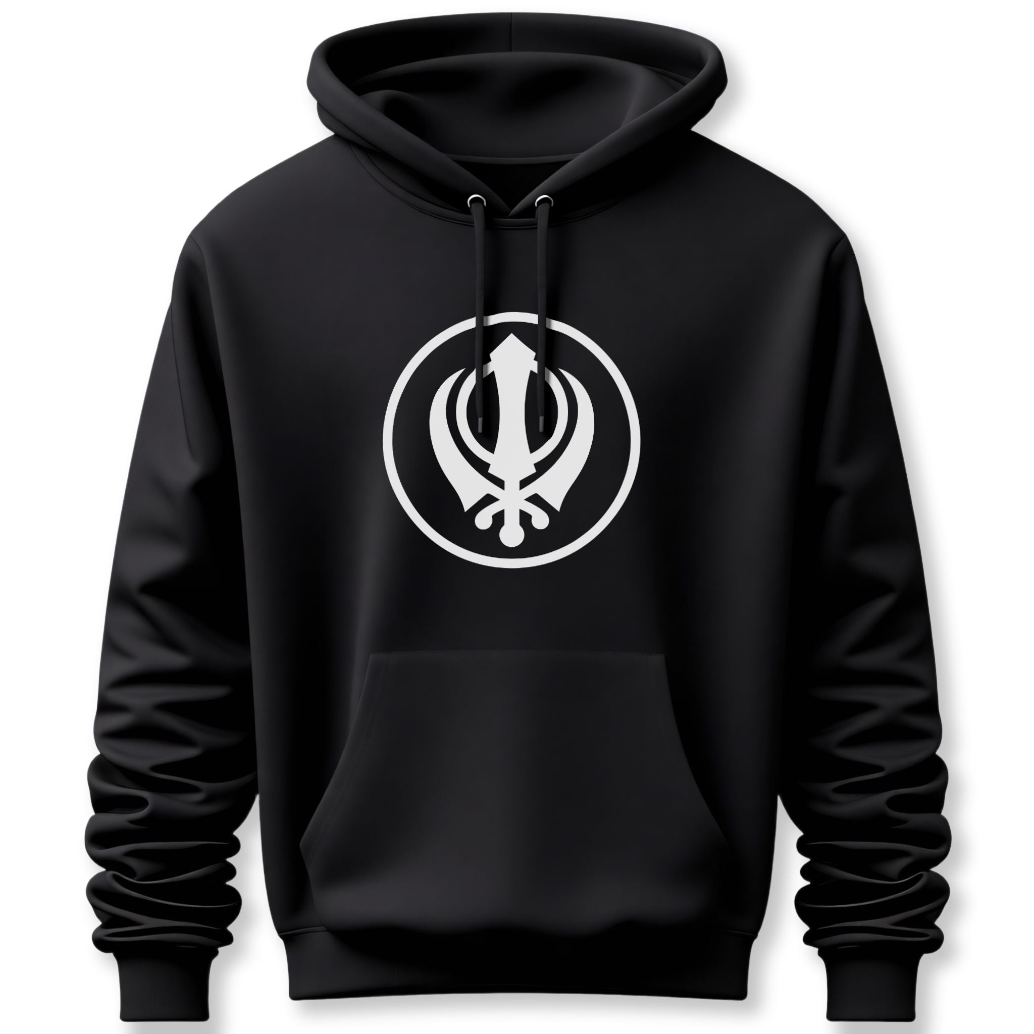 This hoodie features a striking white graphic of the Khanda symbol, elegantly enclosed within a clean circular border. The Khanda is the revered emblem of Sikhism, a powerful composite of distinct symbols: the double-edged sword (Khanda) at its center represents divine knowledge, the creation and destruction of evil, and the balance of spiritual and temporal power. Encircling it, the Chakkar (quoit) signifies divine justice, infinity, and eternity. The two crossed Kirpans (swords) at the bottom embody Miri (temporal power) and Piri (spiritual power), symbolizing the integration of worldly and spiritual life and the defense of righteousness. This design is a profound statement piece for those who connect with its deep spiritual and cultural significance.