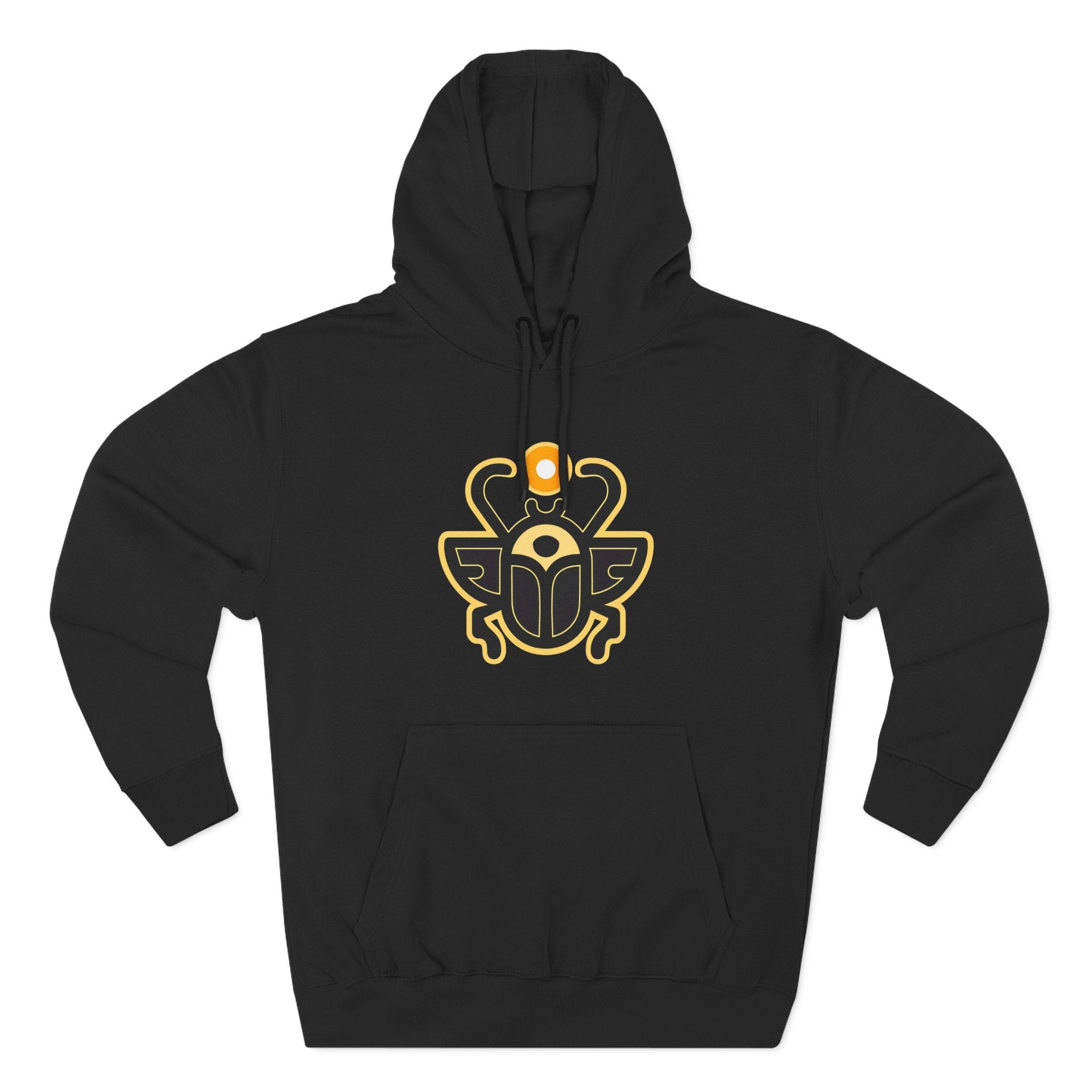 This hoodie showcases a striking gold and yellow design of a stylized scarab beetle, topped with a vibrant sun disk. This iconic imagery represents Khepri, the ancient Egyptian god associated with the rising sun, creation, and rebirth. The scarab symbolizes transformation, renewal, and the continuous cycle of life, much like the sun's daily journey across the sky. This intricate and culturally rich graphic is perfect for those who are drawn to ancient symbolism and unique, meaningful art, making it a captivating statement piece for any wardrobe.