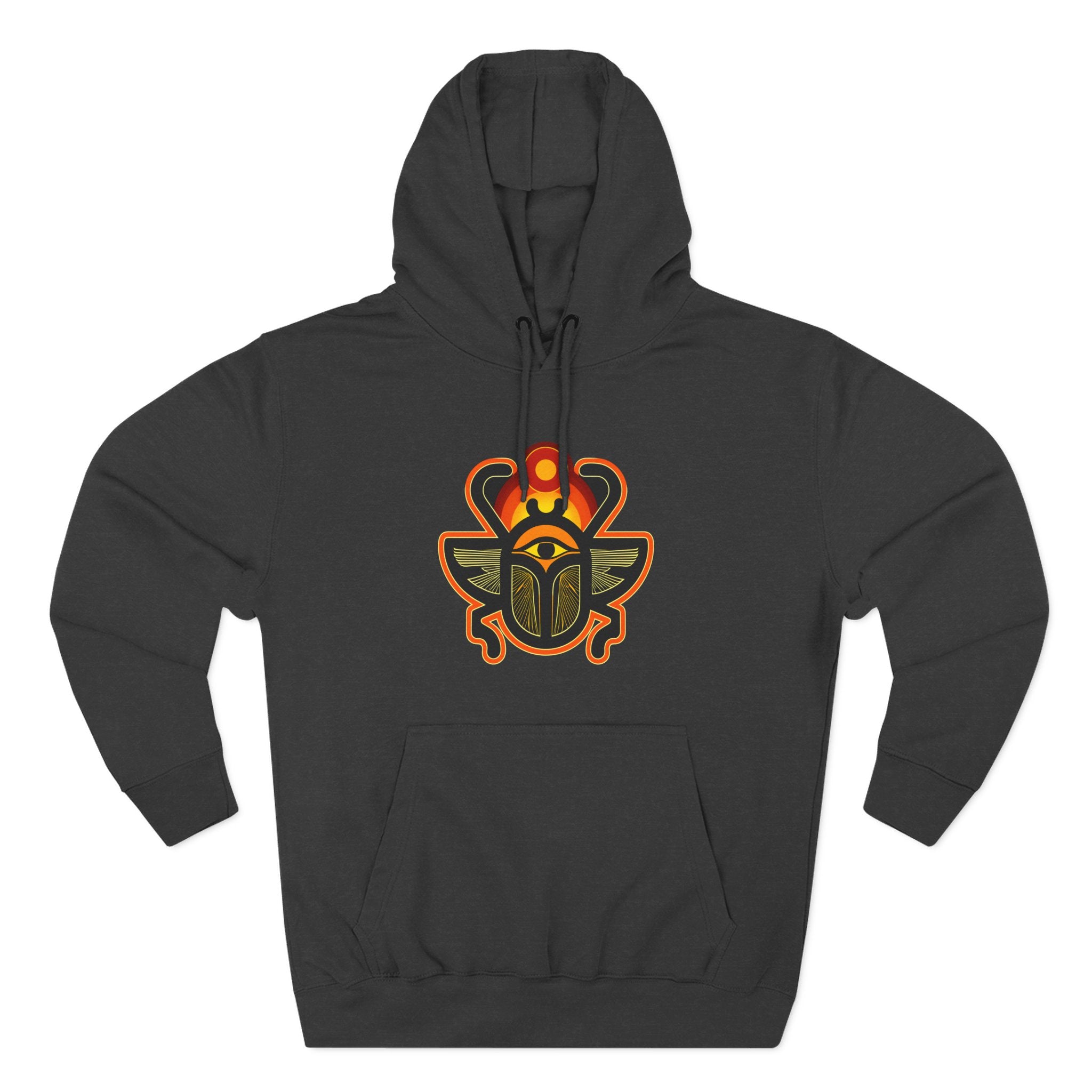 This hoodie showcases a striking graphic of the ancient Egyptian Khepri scarab beetle, beautifully rendered with warm hues of orange, yellow, and red. At its heart lies the powerful Eye of Ra, crowned with a vibrant sun disk and stylized plumes, all outlined with intricate detail. The Khepri scarab symbolizes rebirth, regeneration, and the sun's journey across the sky, while the Eye of Ra represents protection, royal power, and cosmic insight. Together, they evoke the potent energies of creation and transformation inherent in ancient Egyptian mythology. This unique and mystical design is a celebration of profound cultural symbolism, perfect for those who appreciate history, spirituality, and eye-catching artwork. It's a bold statement piece that carries deep meaning for any wardrobe.