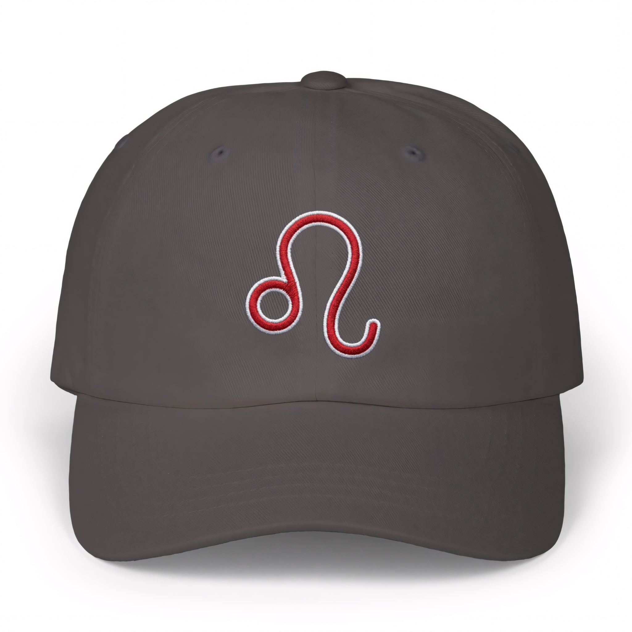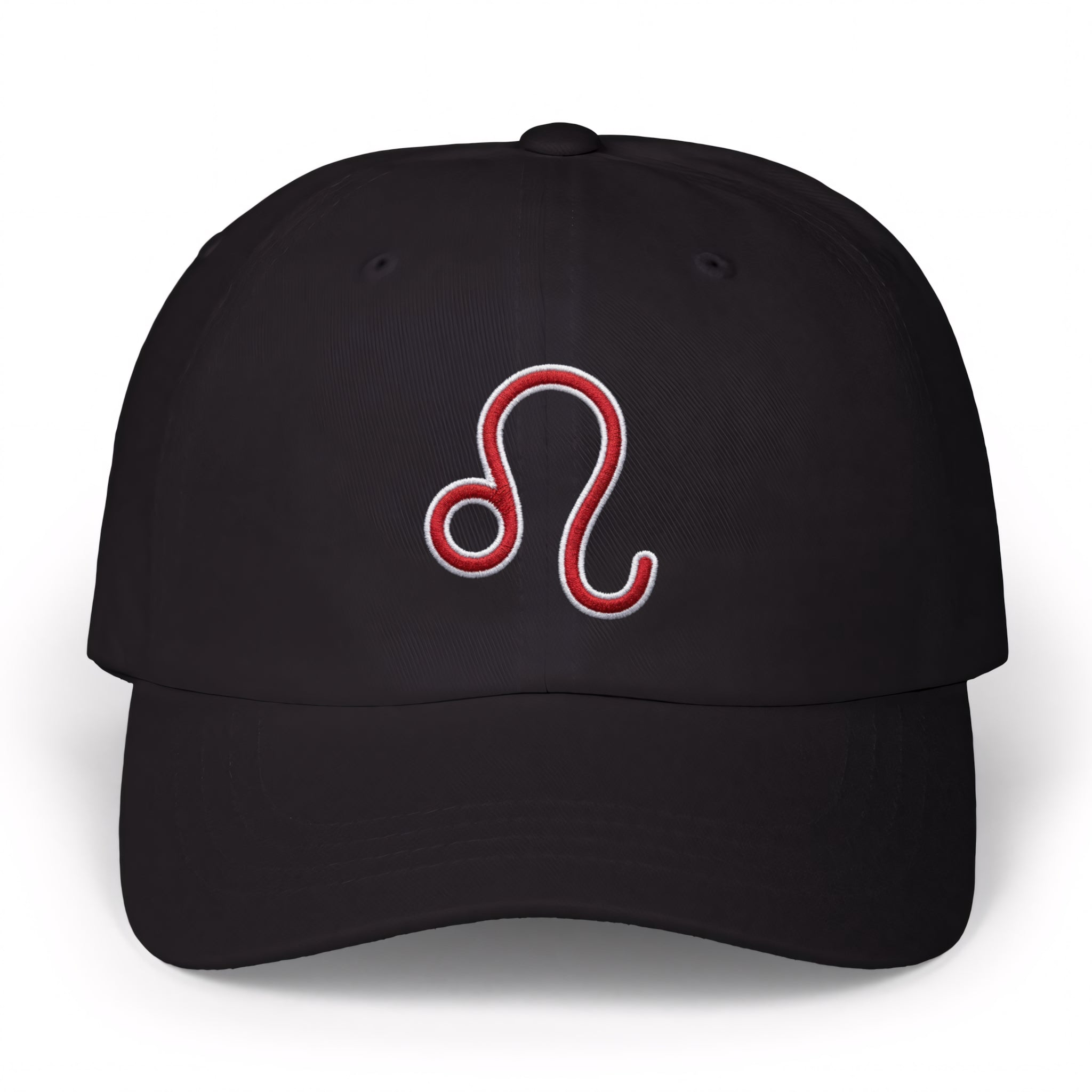 This classic black baseball cap features the iconic Leo zodiac symbol, beautifully embroidered in a striking red outline with a clean white fill. The Leo symbol, representing the mighty lion, embodies strength, courage, and leadership. As a fire sign, Leo is known for its passionate, confident, and warm-hearted nature, ruled by the radiant Sun. This bold and recognizable design is perfect for those who proudly embrace their astrological identity or admire the powerful traits associated with the lion. It's an eye-catching statement piece for any zodiac enthusiast.