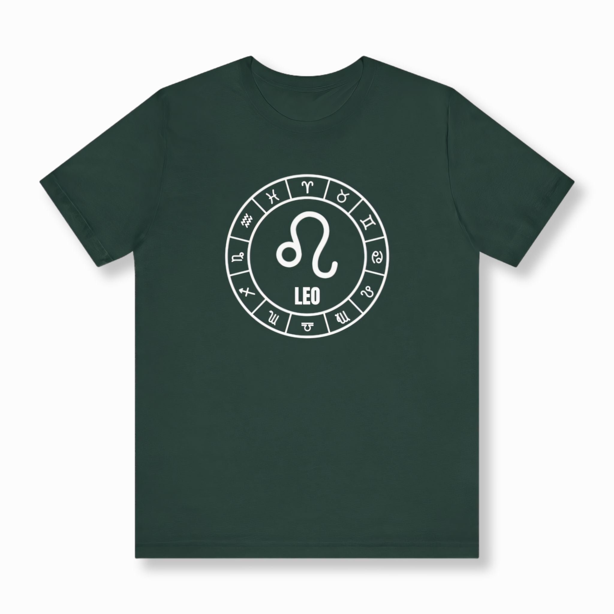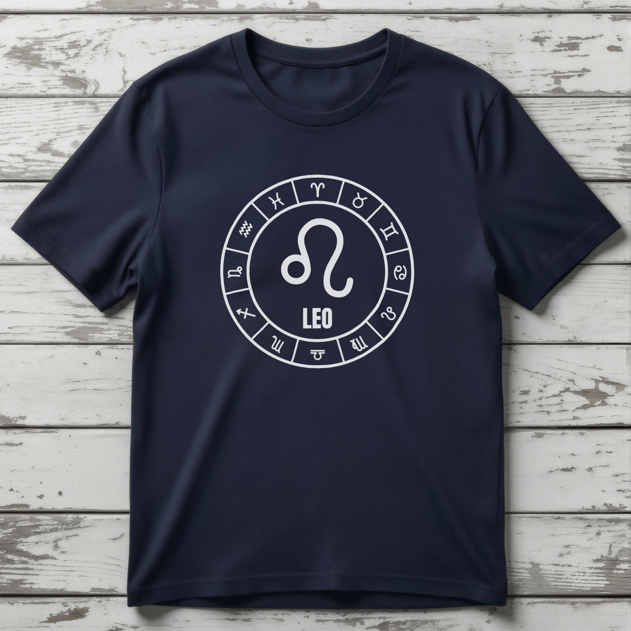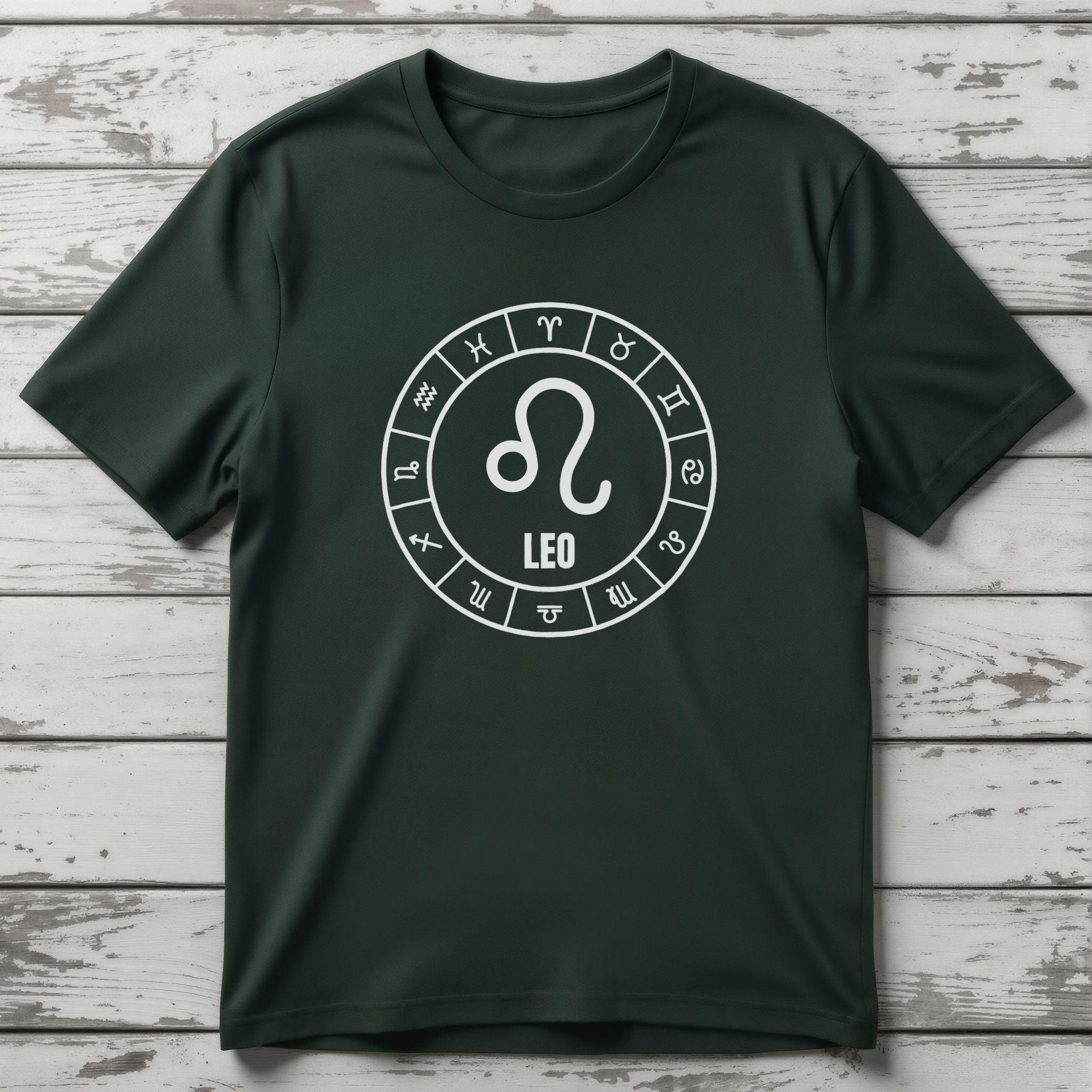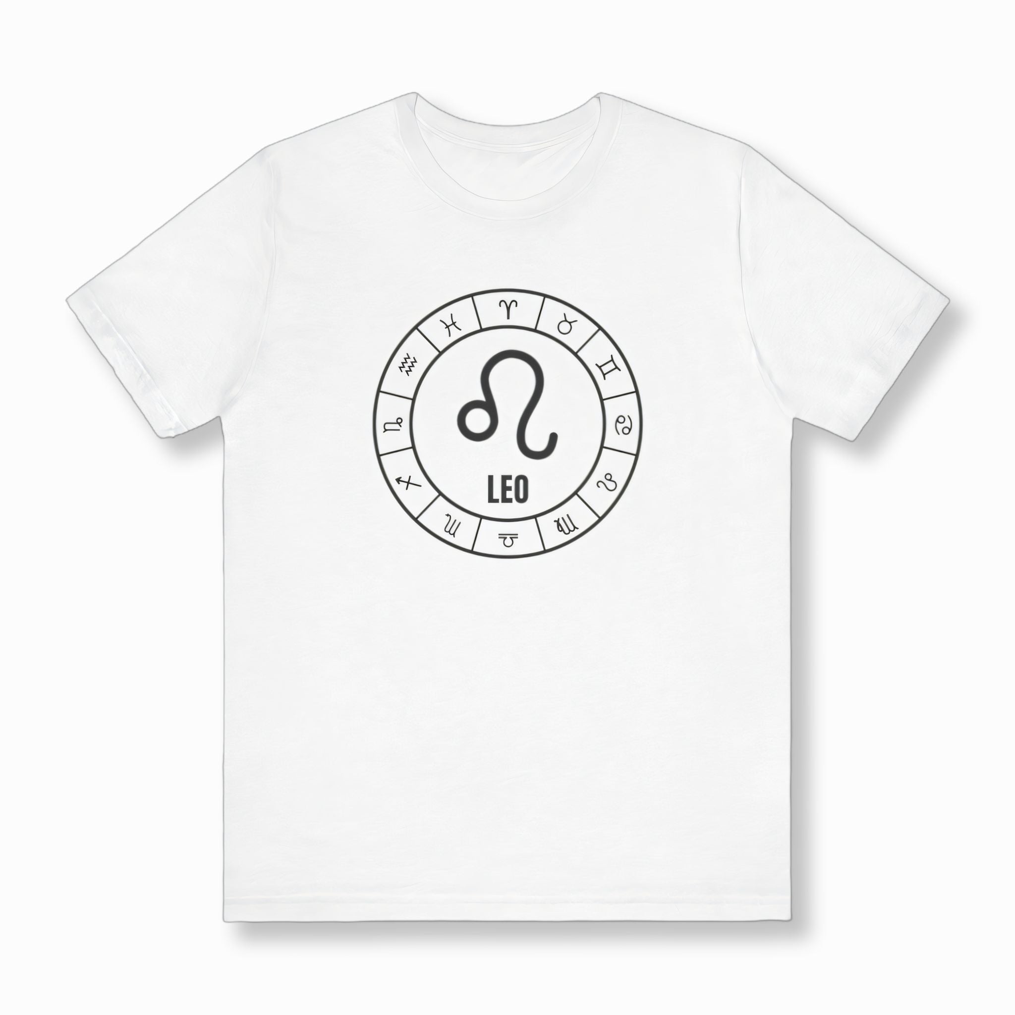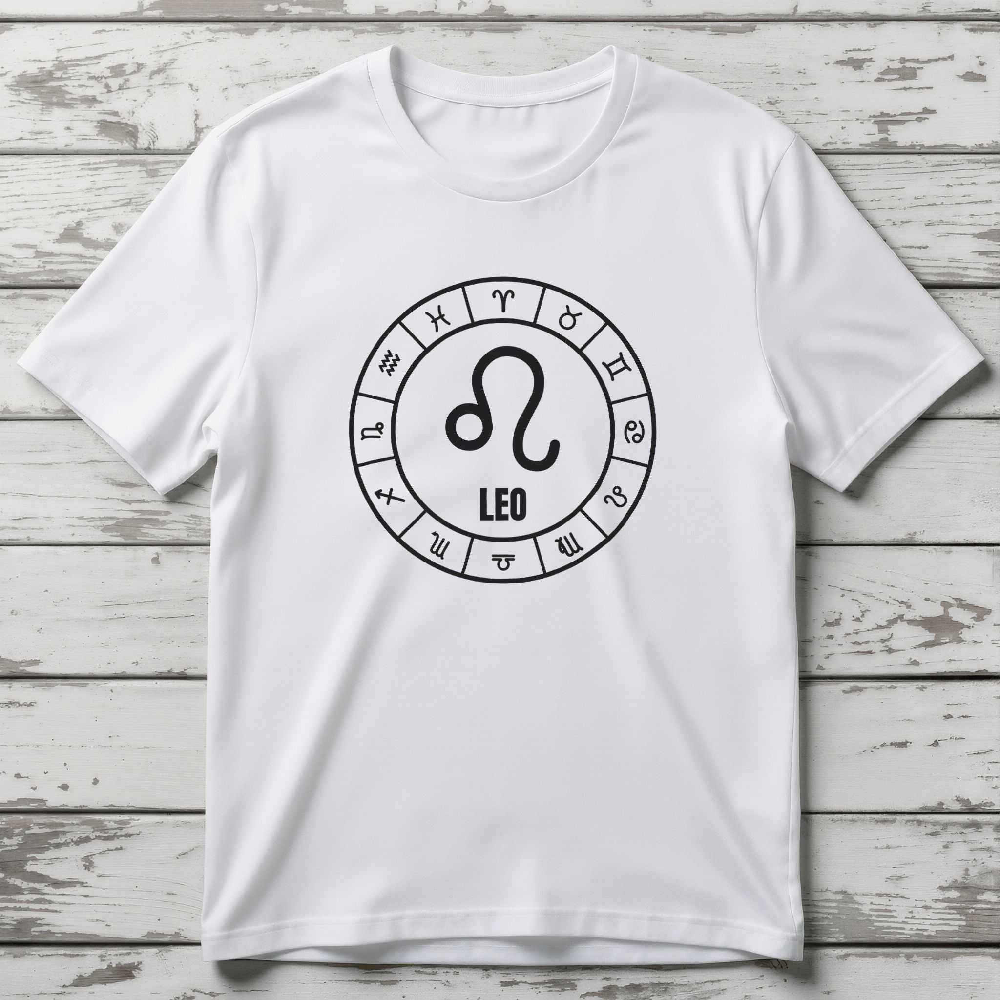 This t-shirt features a striking white graphic on a black background, showcasing the powerful Leo Zodiac symbol at its heart, accompanied by the word "LEO." This central emblem is elegantly encircled by a complete wheel of all twelve astrological signs, creating a harmonious and cosmic design. The Leo symbol embodies traits like courage, leadership, passion, and generosity, representing those born under this majestic fire sign. The surrounding Zodiac wheel signifies the interconnectedness of cosmic energies and the timeless journey of the stars. This unique graphic is perfect for those who resonate with their Leo spirit or have a deep appreciation for the celestial wisdom of the Zodiac. It’s a bold and meaningful statement piece that combines personal pride with universal symbolism.