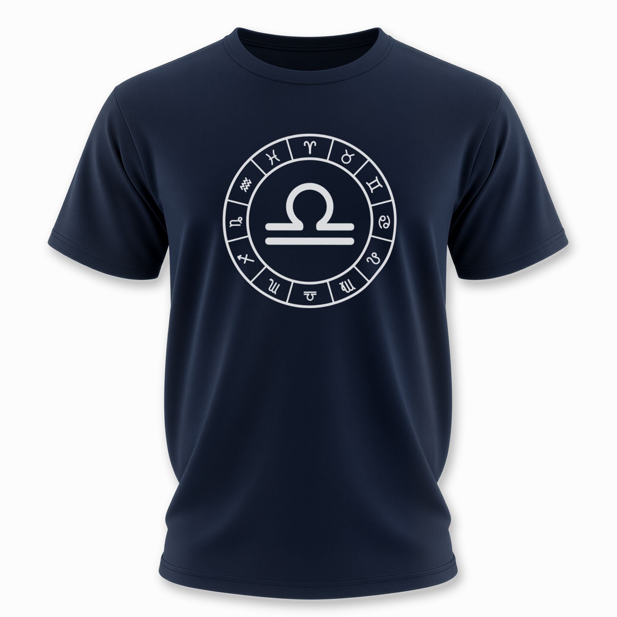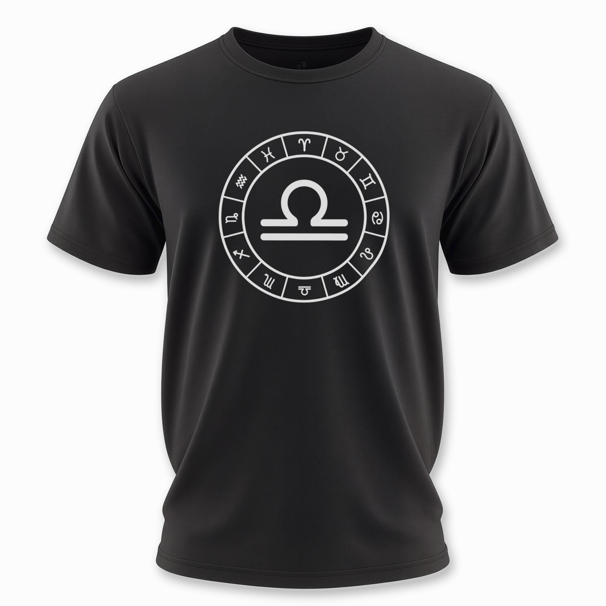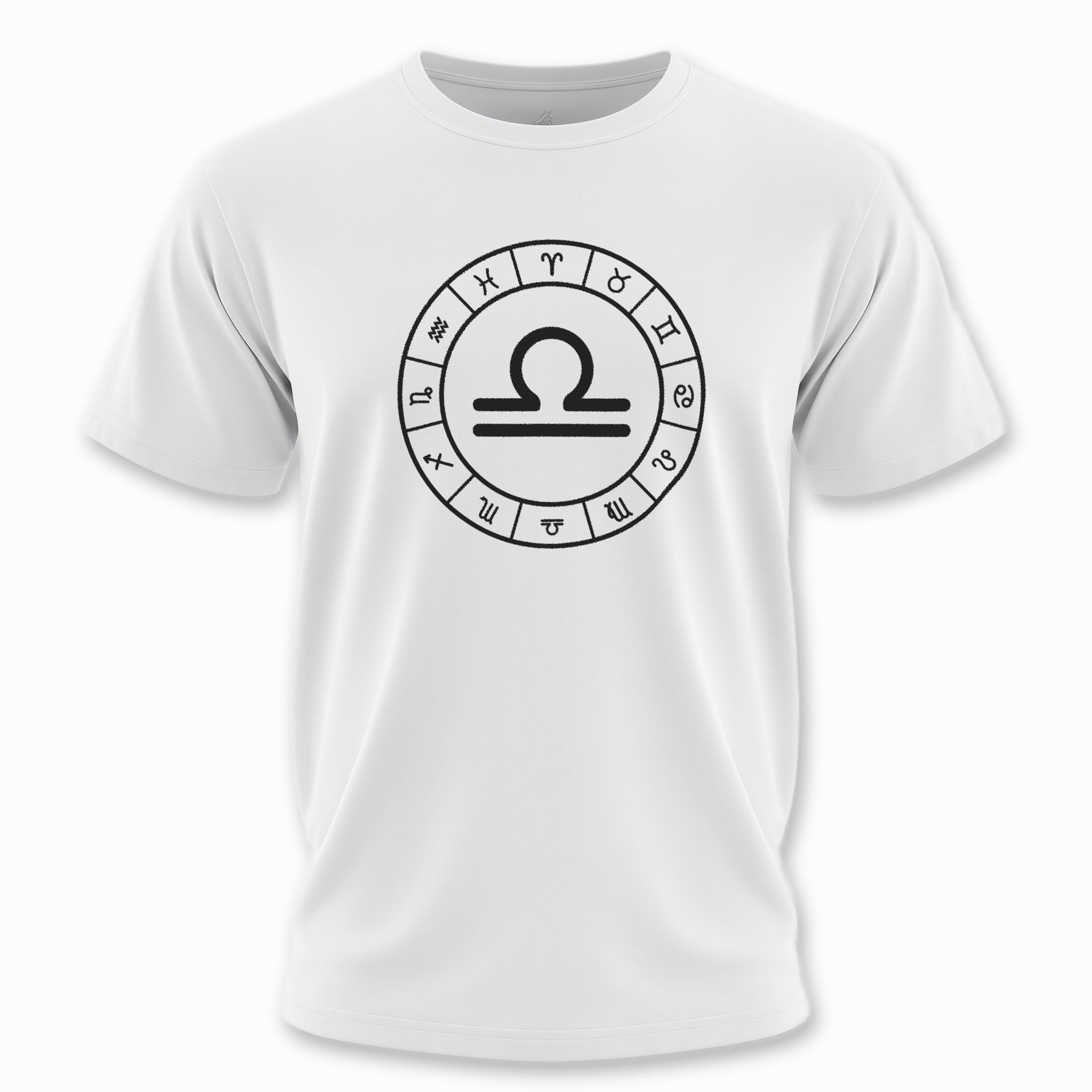 This t-shirt features a captivating white circular graphic, celebrating the cosmos and astrological harmony. At its heart is the elegant Libra zodiac symbol, representing the scales of balance, beautifully encircled by all twelve astrological signs. This intricate design speaks to the interconnectedness of cosmic energies and the unique qualities of the Libra individual, known for their pursuit of justice and equilibrium. It's an eye-catching and meaningful piece perfect for those passionate about astrology and their star sign.