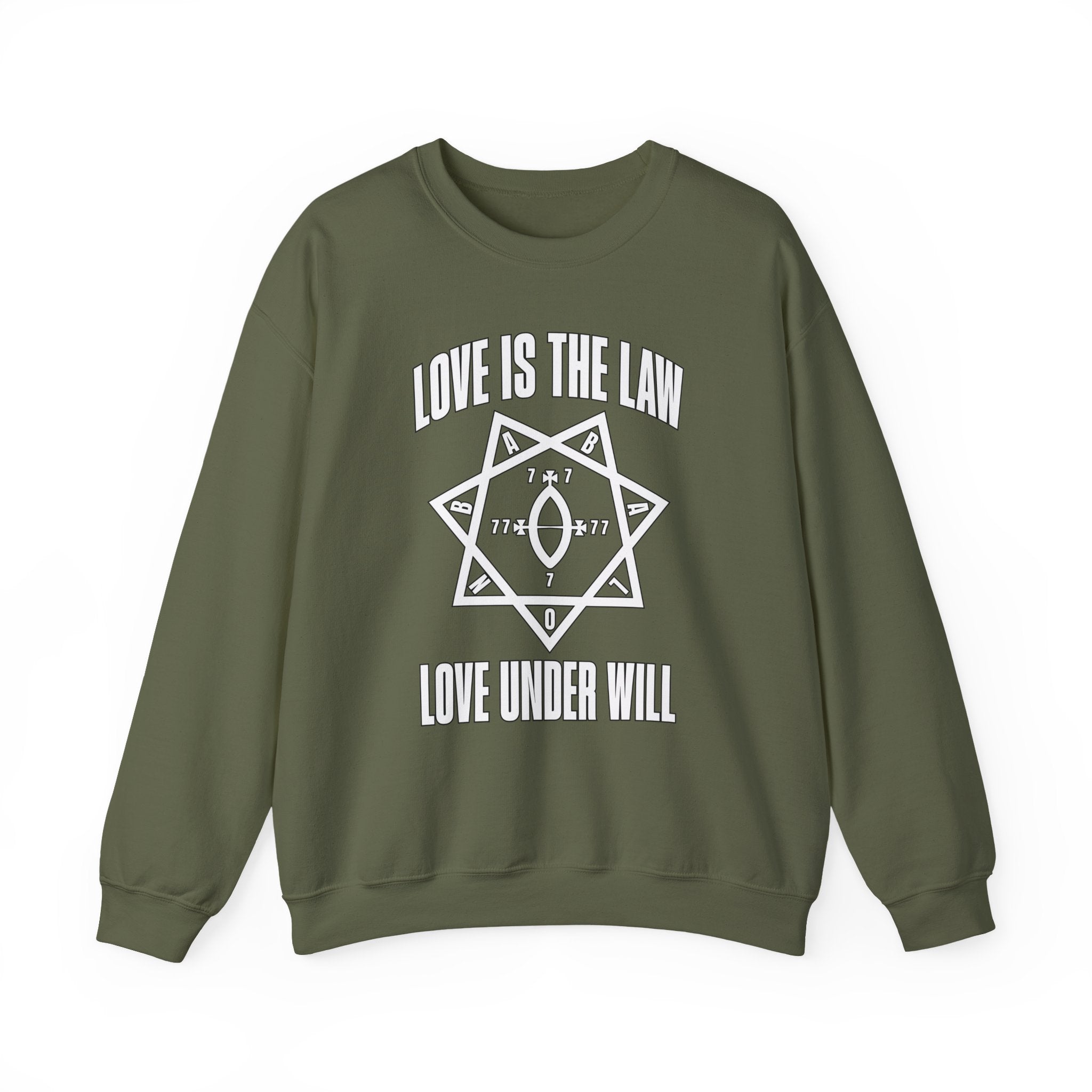 This captivating sweatshirt features a powerful heptagram, a seven-pointed star, framed by the profound Thelemic maxims "LOVE IS THE LAW" at the top and "LOVE UNDER WILL" at the bottom. Within the star, intricate symbols and numbers like 7, 77, and 0, along with specific letters, hint at deeper esoteric meanings, representing concepts integral to the philosophy of Thelema, founded by Aleister Crowley. Often referred to as the Star of Babalon in Thelemic tradition, this symbol, combined with its core tenets, makes a bold statement of individual will and universal love. This design is perfect for those who resonate with occult philosophy, mystical symbolism, or unique spiritual graphics.