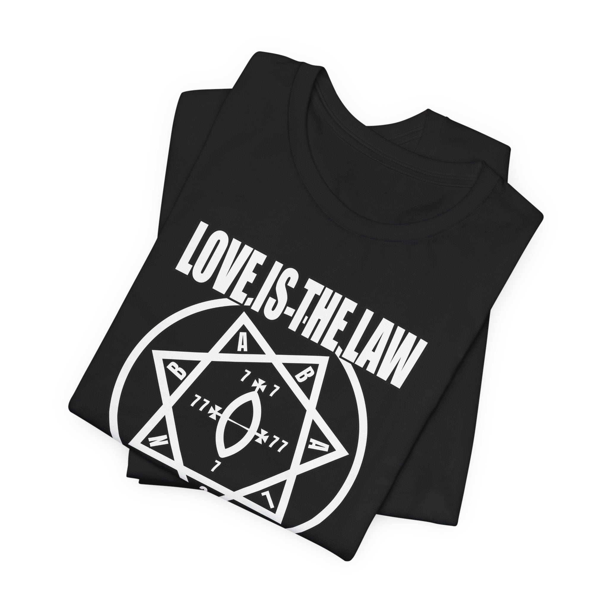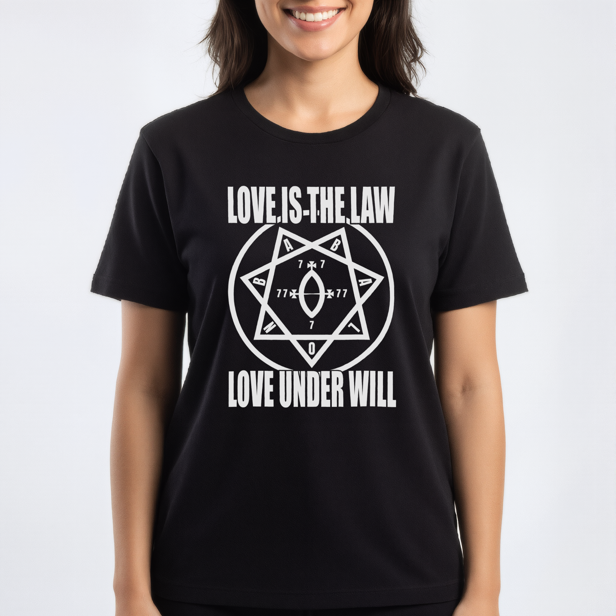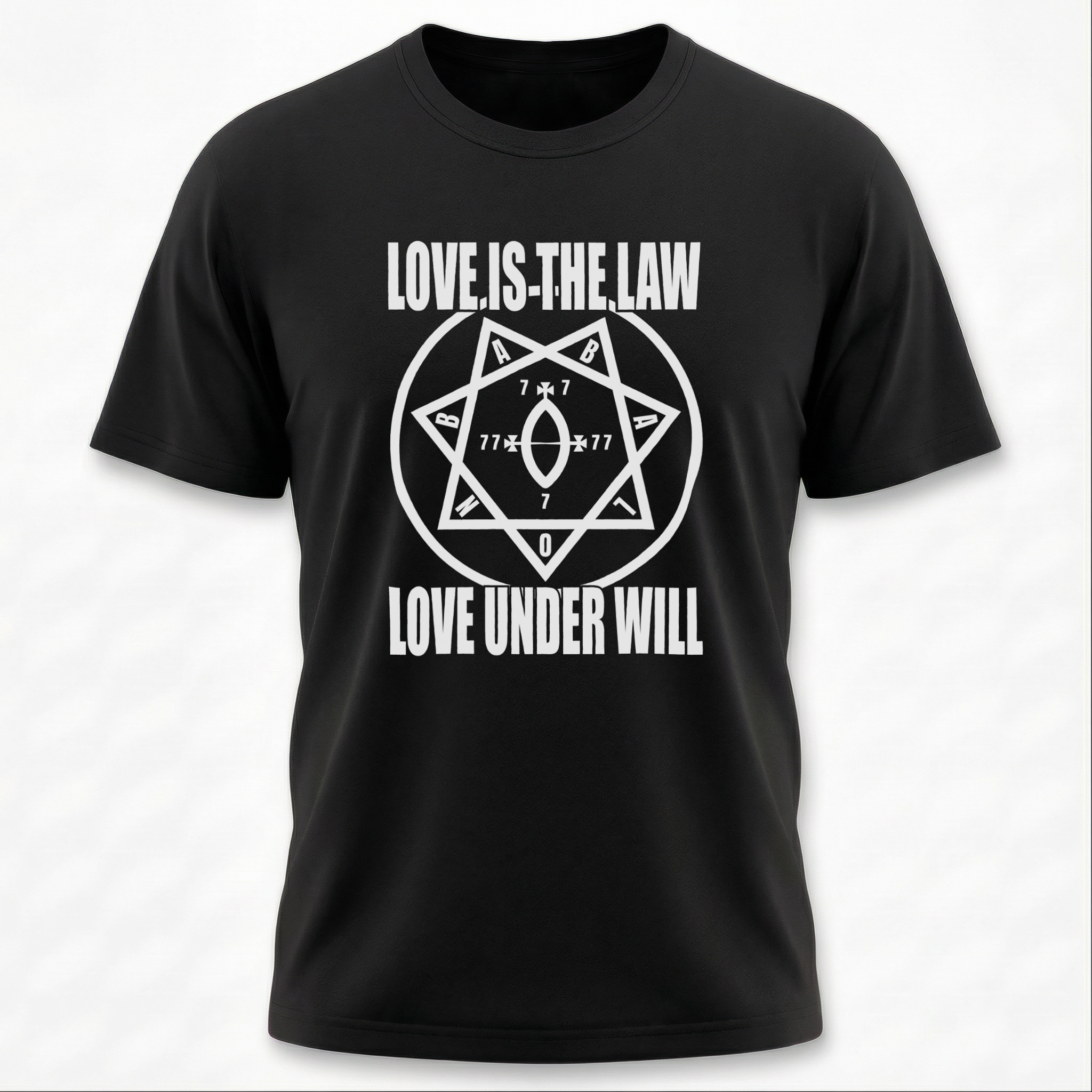 This t-shirt features a profound white graphic, showcasing the central Thelemic credo: "LOVE IS THE LAW" boldly displayed at the top and "LOVE UNDER WILL" at the bottom. Encased within the design is a striking unicursal hexagram, a potent symbol within Thelema, surrounded by numbers and letters that carry significant Gematric meaning, including the prominent '7', '77', and '0'. This unique graphic masterfully blends esoteric symbolism with a clear philosophical statement, making it perfect for those who resonate with spiritual freedom, personal will, and deeper mystical knowledge. It’s a powerful and thought-provoking design, destined to be a standout piece for any wardrobe.