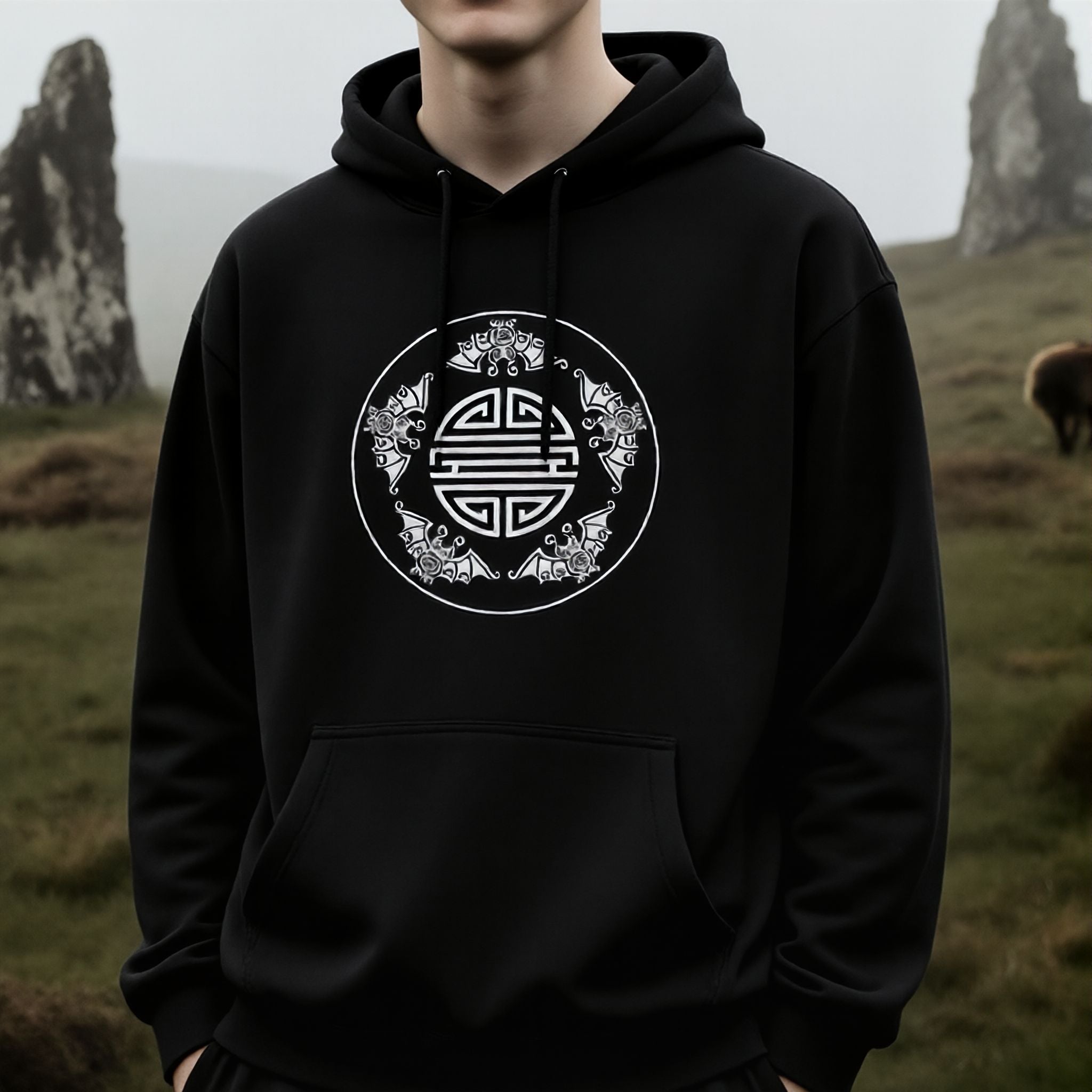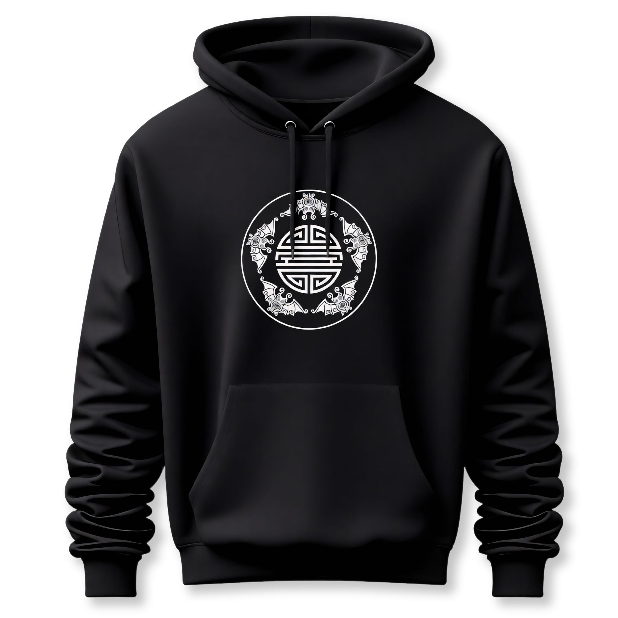 This striking hoodie features a circular white graphic inspired by traditional Chinese symbolism. At its heart is the elegant "Fu" (福) character, representing good fortune, blessings, and happiness. Surrounding this central motif are eight beautifully stylized bats (蝙蝠, biānfú), which in Chinese culture are powerful symbols of prosperity and happiness due to their name being a homophone for "fortune." This combination evokes the revered "Five Blessings" (longevity, wealth, health, love of virtue, and a peaceful death), making this design a profound representation of auspicious wishes. It's a culturally rich and eye-catching piece, perfect for those who appreciate deep symbolic meaning and unique artistry.