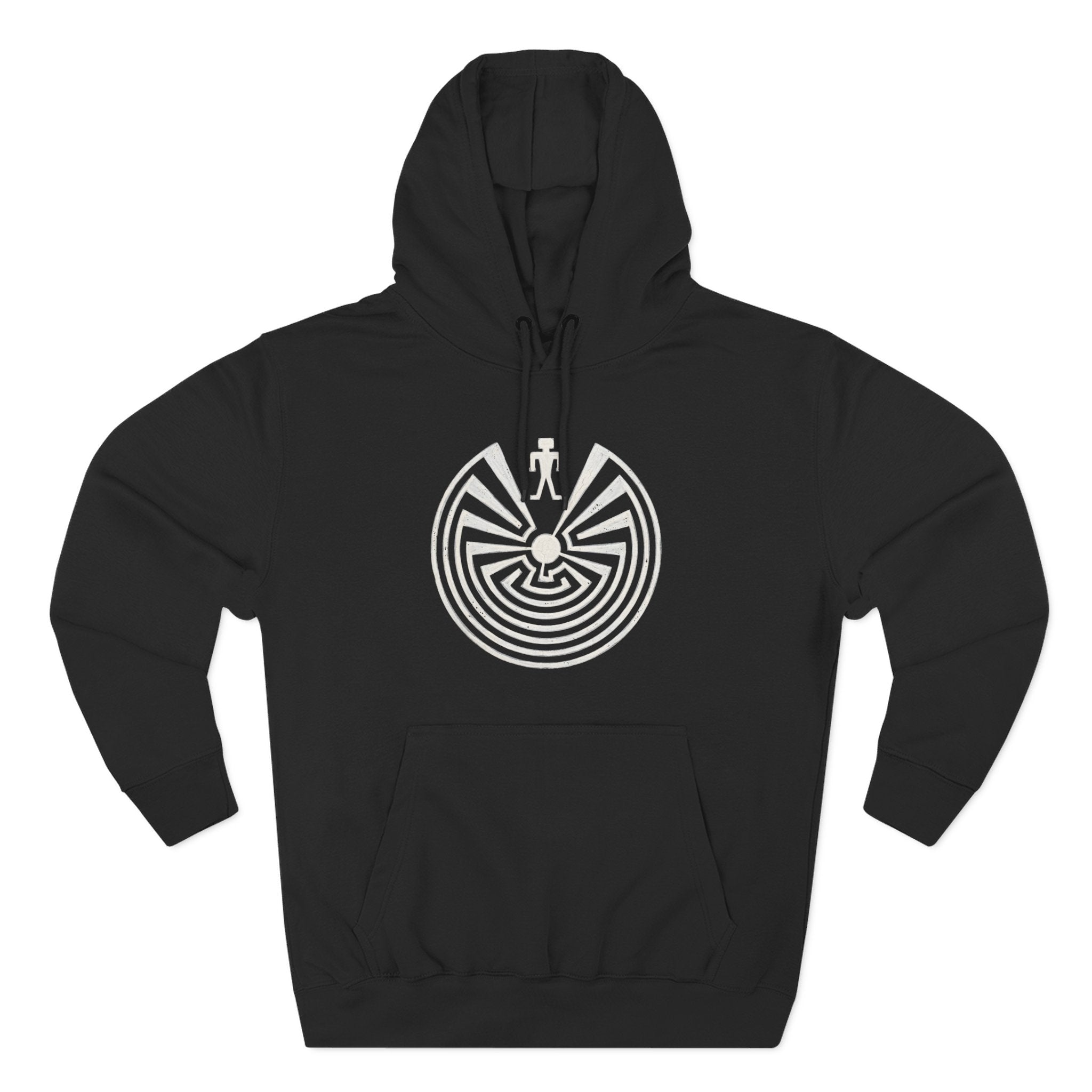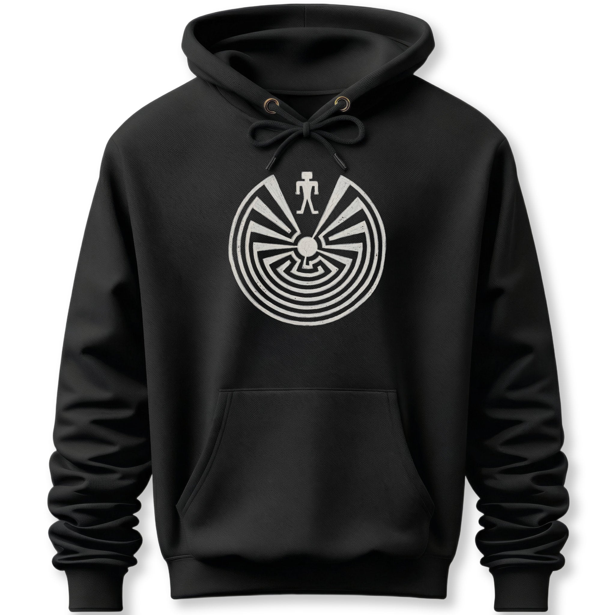 This hoodie features a striking white design of the ancient "Man in the Maze" symbol. Originating from the Tohono O'odham tradition, this profound emblem represents life's intricate journey, the choices we make, and the pursuit of balance and harmony. The central figure, often identified as I'itoi (Elder Brother), symbolizes the wisdom gained through navigating life's challenges to reach a peaceful core. It's a visually captivating and deeply meaningful graphic for those who appreciate rich cultural symbolism and a contemplative message, making it a unique and thought-provoking addition to any wardrobe.