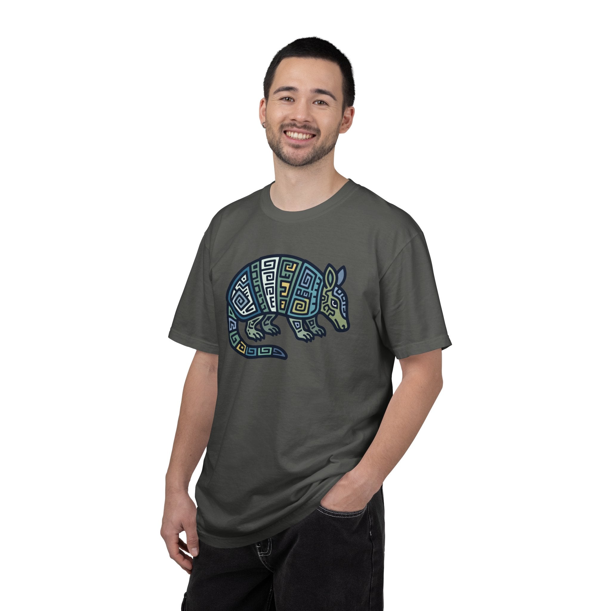 Pair this unique t-shirt with anything from ripped jeans to chinos for an effortlessly cool look. Layer it under an open shirt or jacket to highlight its intricate design. This versatile design is sure to spark conversations and add a touch of distinctive artistry to your wardrobe. Embrace the spirit of the armadillo with this stylish and meaningful t-shirt.