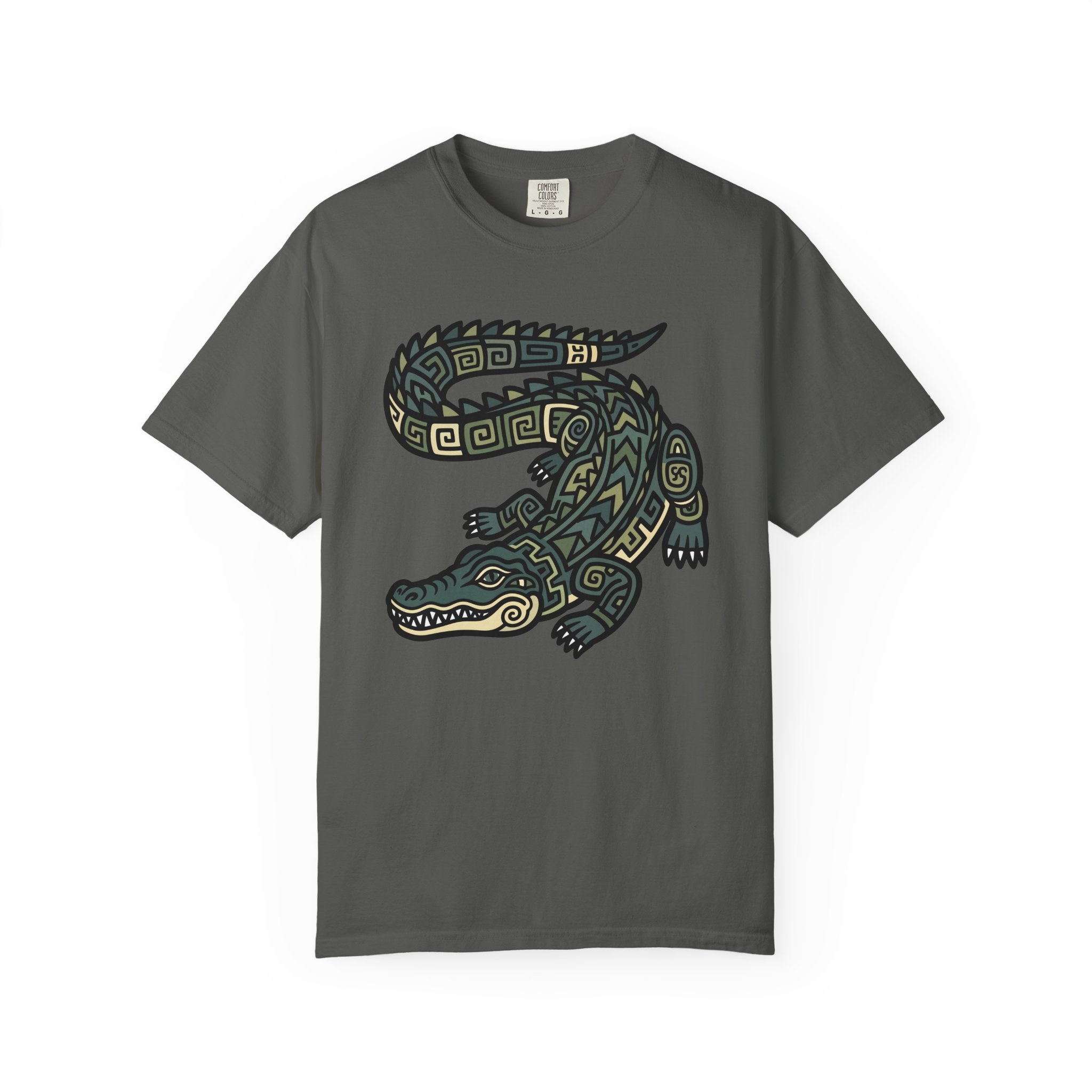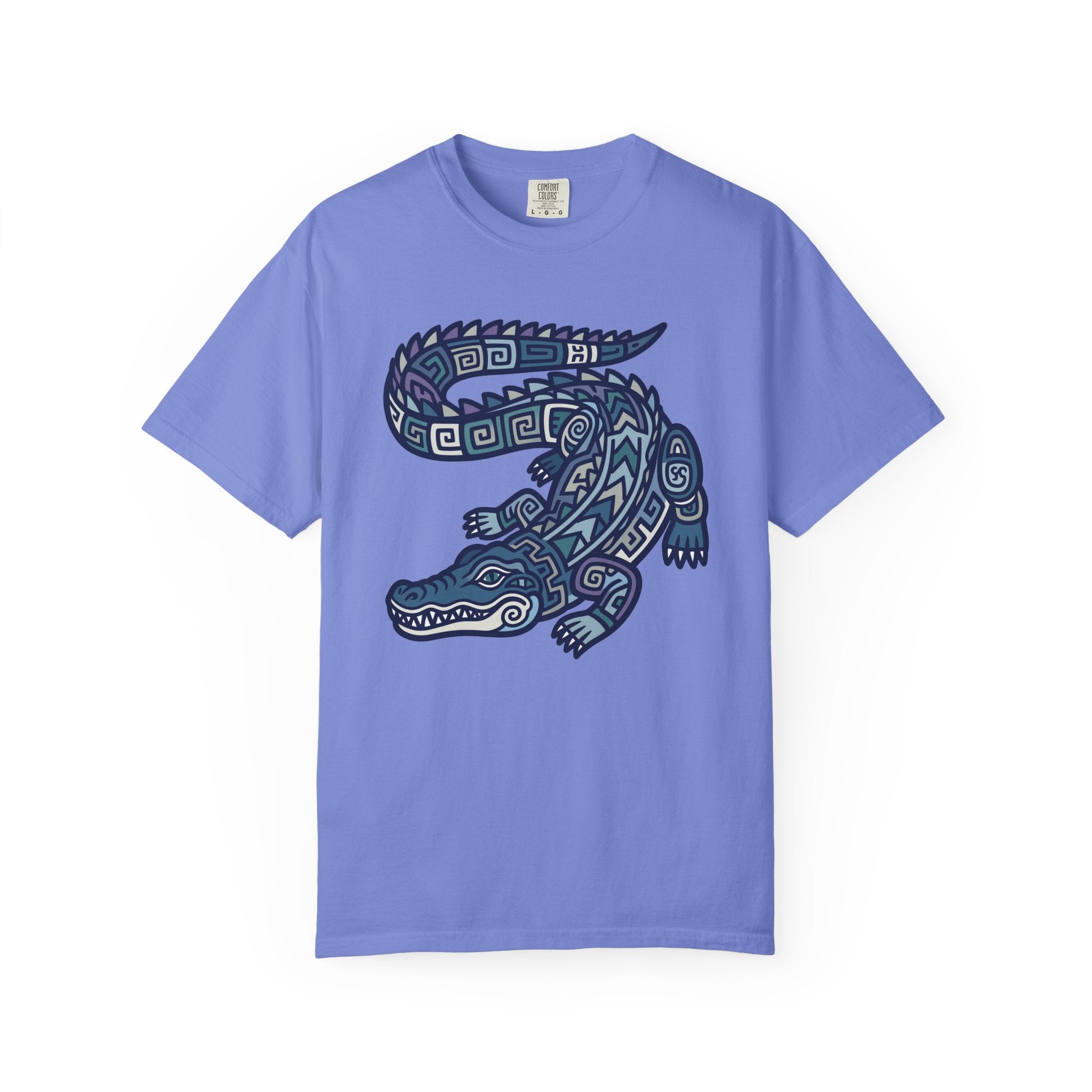 This t-shirt features a striking and intricately designed alligator, rendered in a unique geometric and tribal art style. Adorned with rich patterns in earthy shades of green, blue, and cream, the alligator evokes a sense of primal strength, ancient wisdom, and a deep connection to nature. It's a bold and artistic statement piece, perfect for those who seek unique graphics with profound symbolic roots and an appreciation for cultural artistry.
