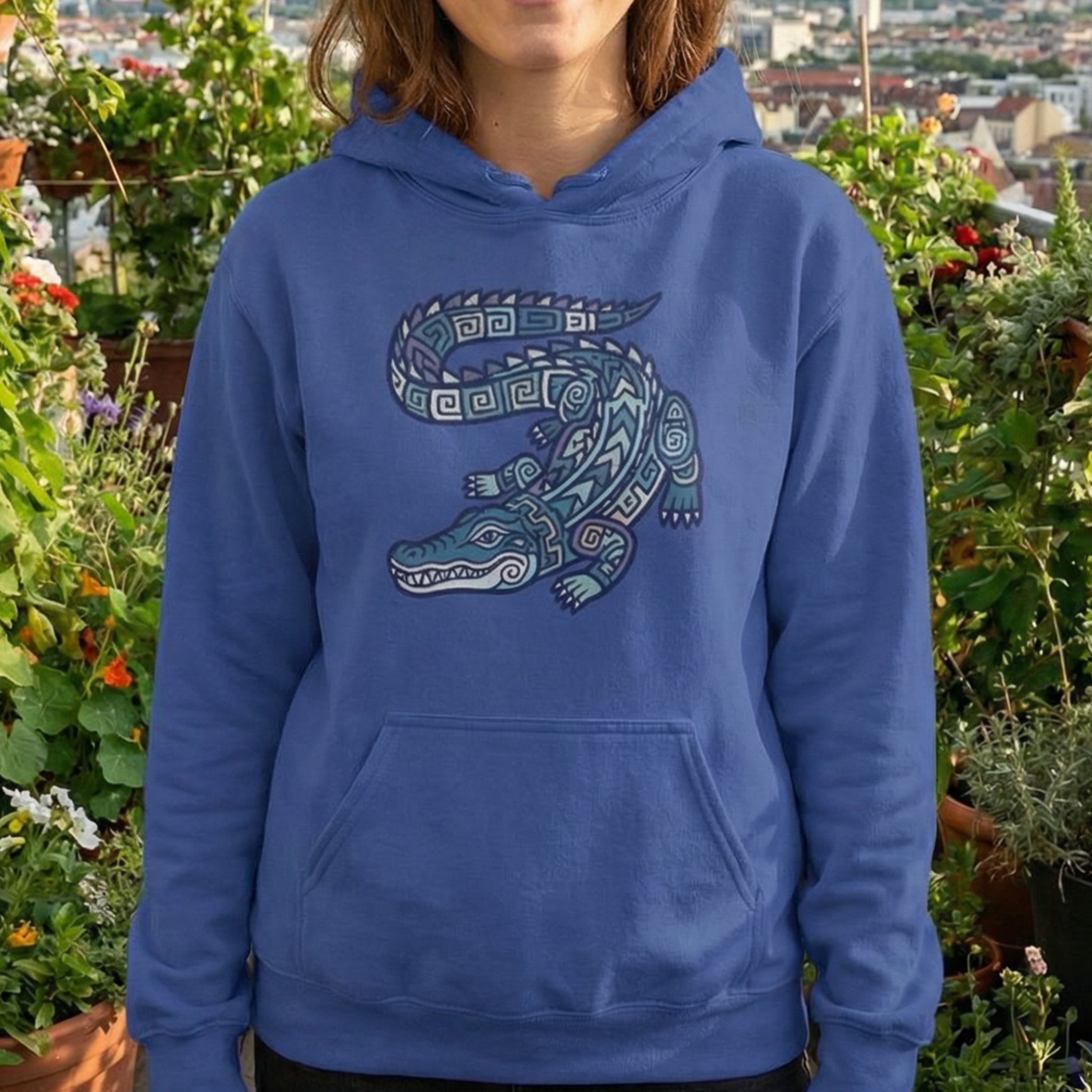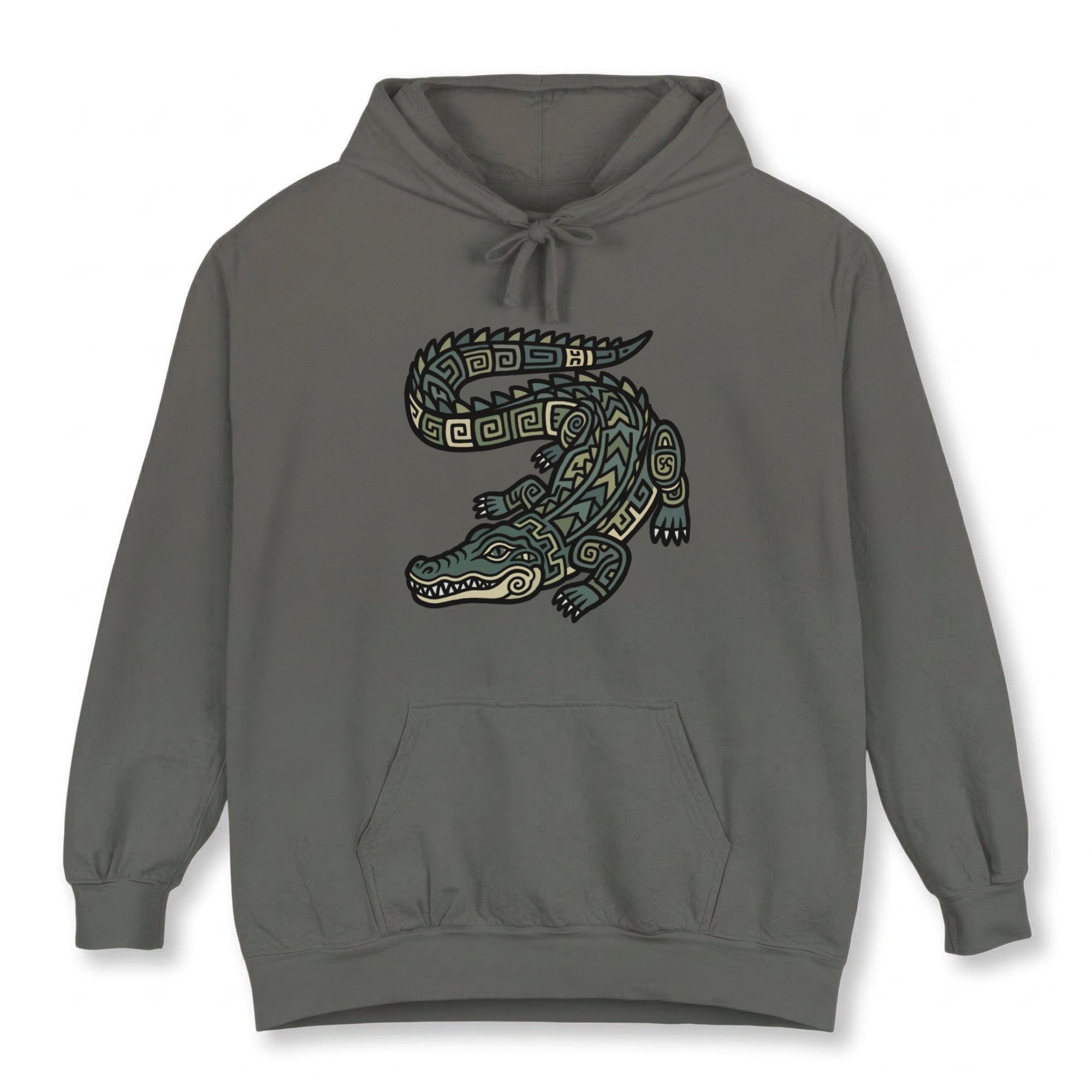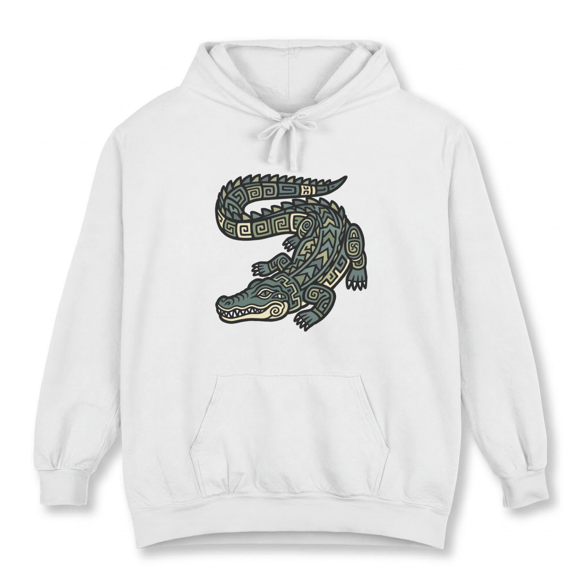This hoodie showcases an intricately detailed alligator or crocodile, stylized with mesmerizing tribal and geometric patterns in earthy greens, golden yellows, and black outlines. The design evokes the rich artistic traditions of ancient cultures, where creatures like the alligator often symbolize primal strength, ancient wisdom, resilience, and a deep connection to the natural world. This unique graphic is perfect for those who appreciate powerful animal symbolism, intricate artwork, and designs with a strong cultural or mythical flair. Its bold and distinctive aesthetic makes it a standout piece for any wardrobe.