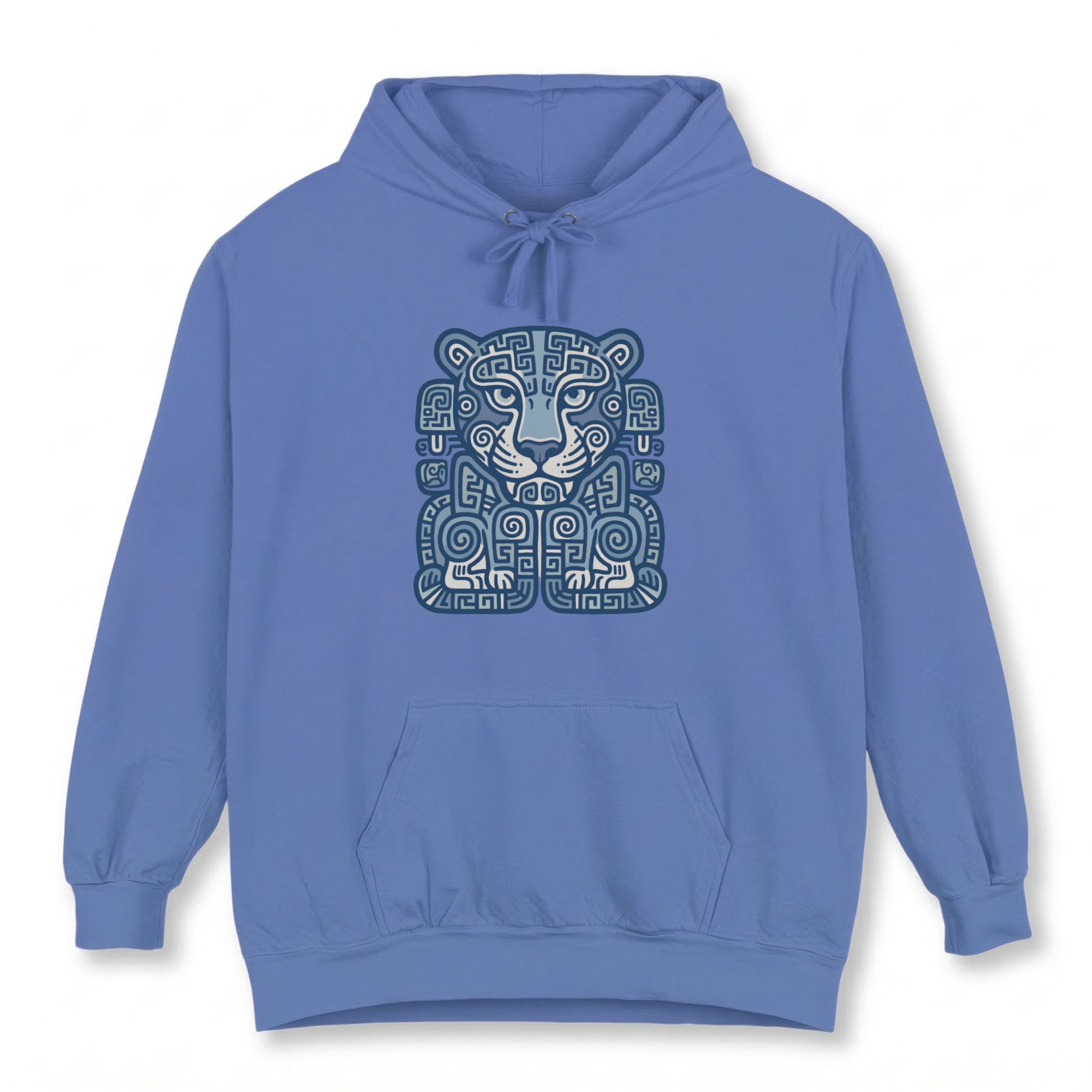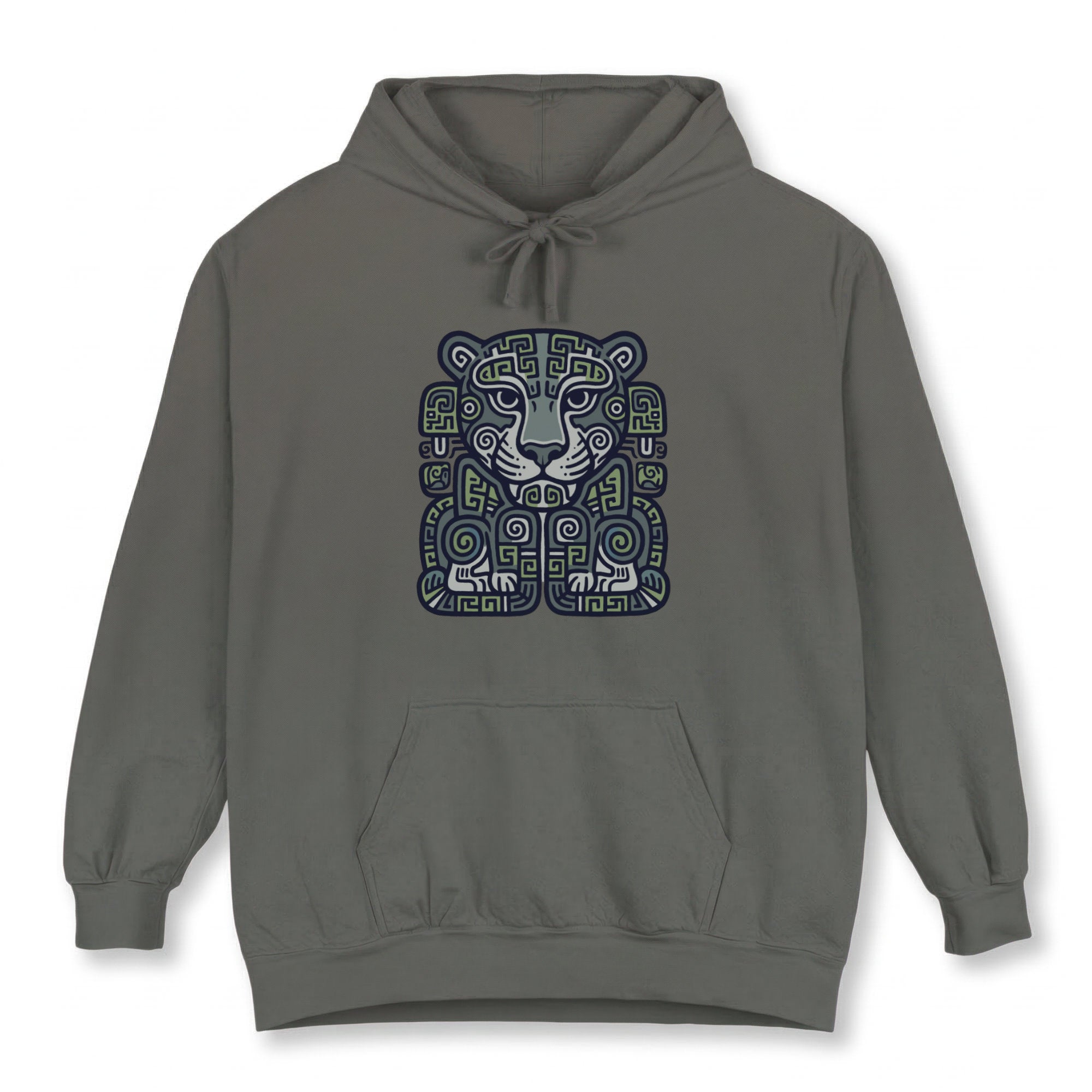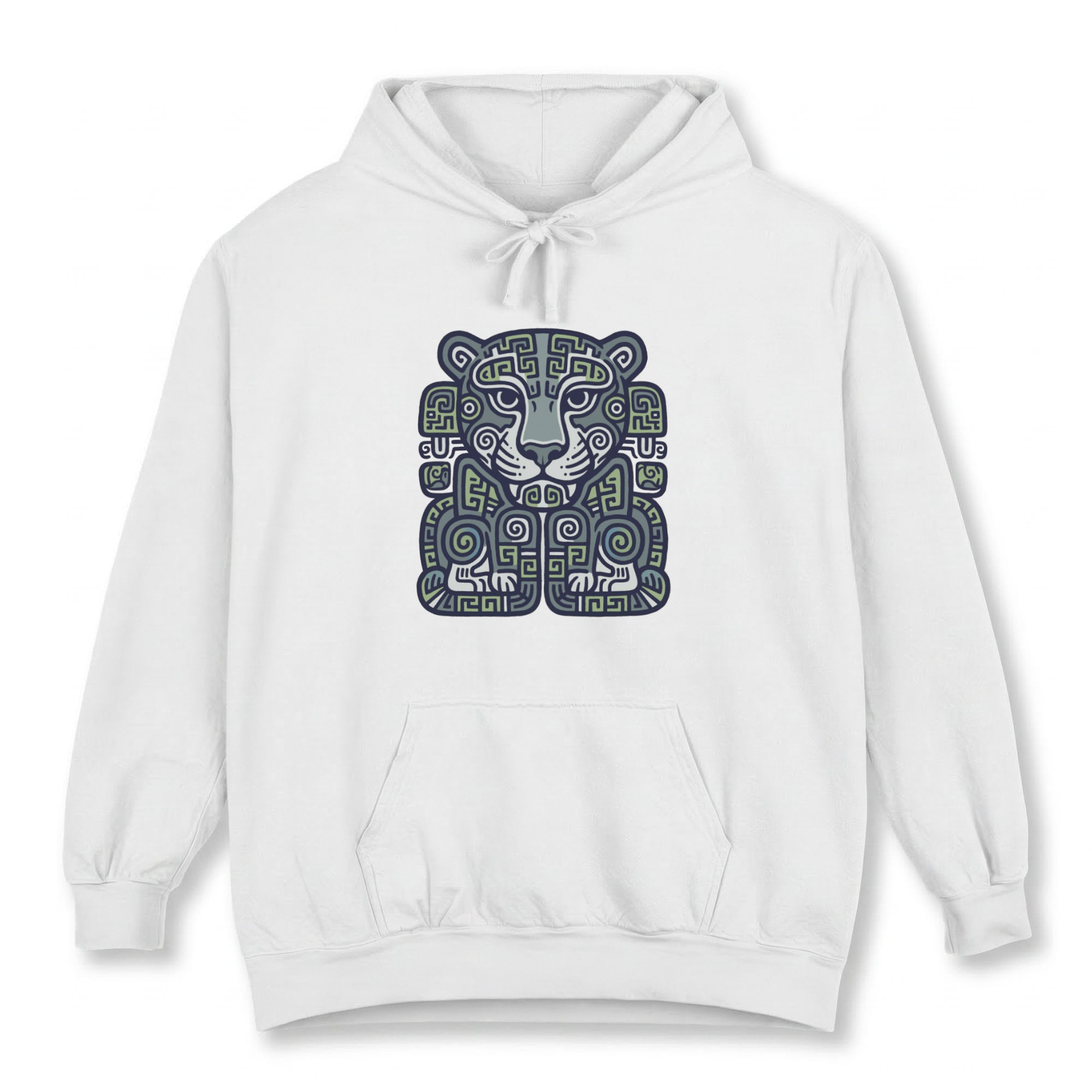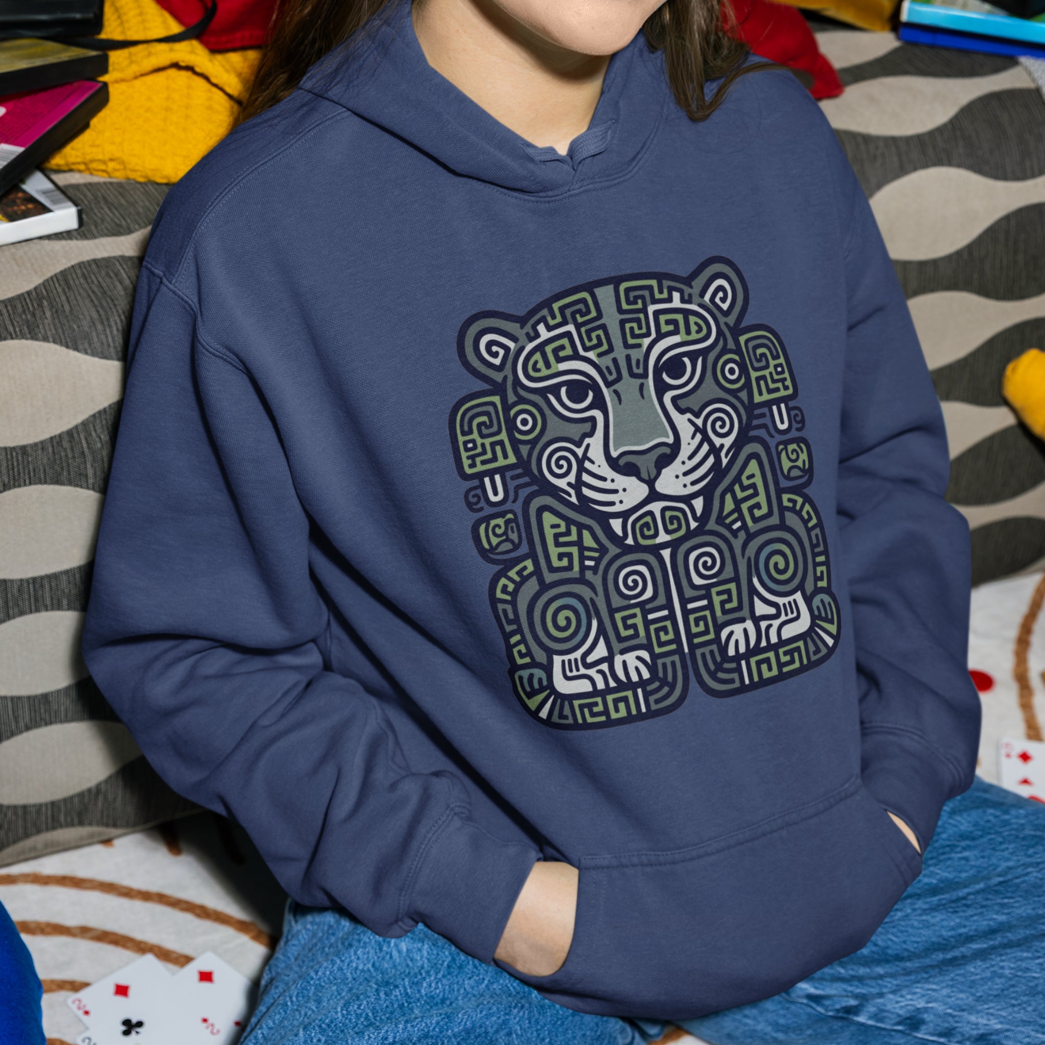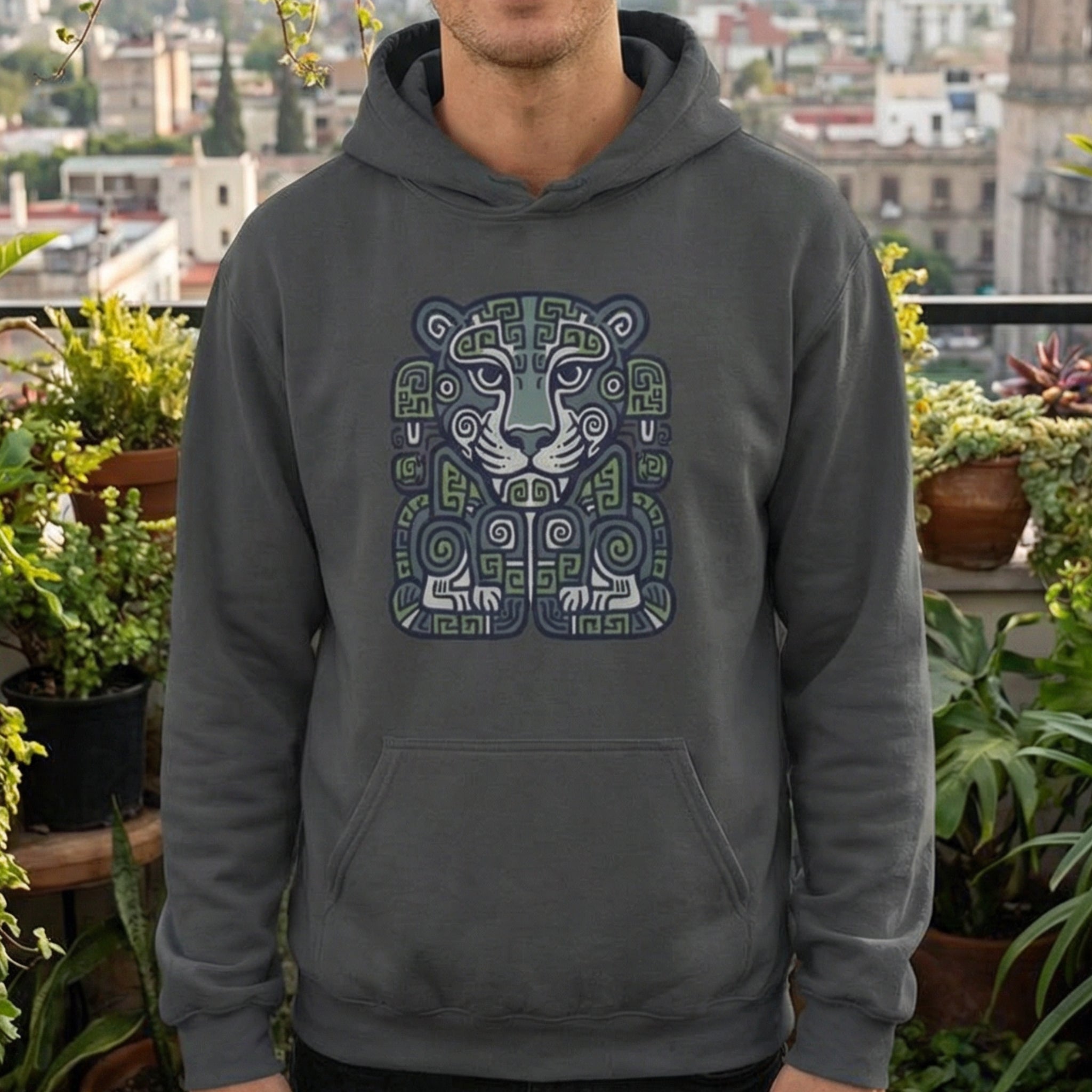 This captivating hoodie showcases a majestic jaguar, rendered with intricate geometric patterns and tribal motifs reminiscent of ancient Mesoamerican artistry. The stylized design embodies the powerful spirit of the jaguar, an animal revered across cultures for its strength, agility, and mystical connection to the earth and the unseen realms. Its unique blend of detailed lines and flowing shapes creates a mesmerizing visual that is both ancient and modern, making it a standout piece for any wardrobe.