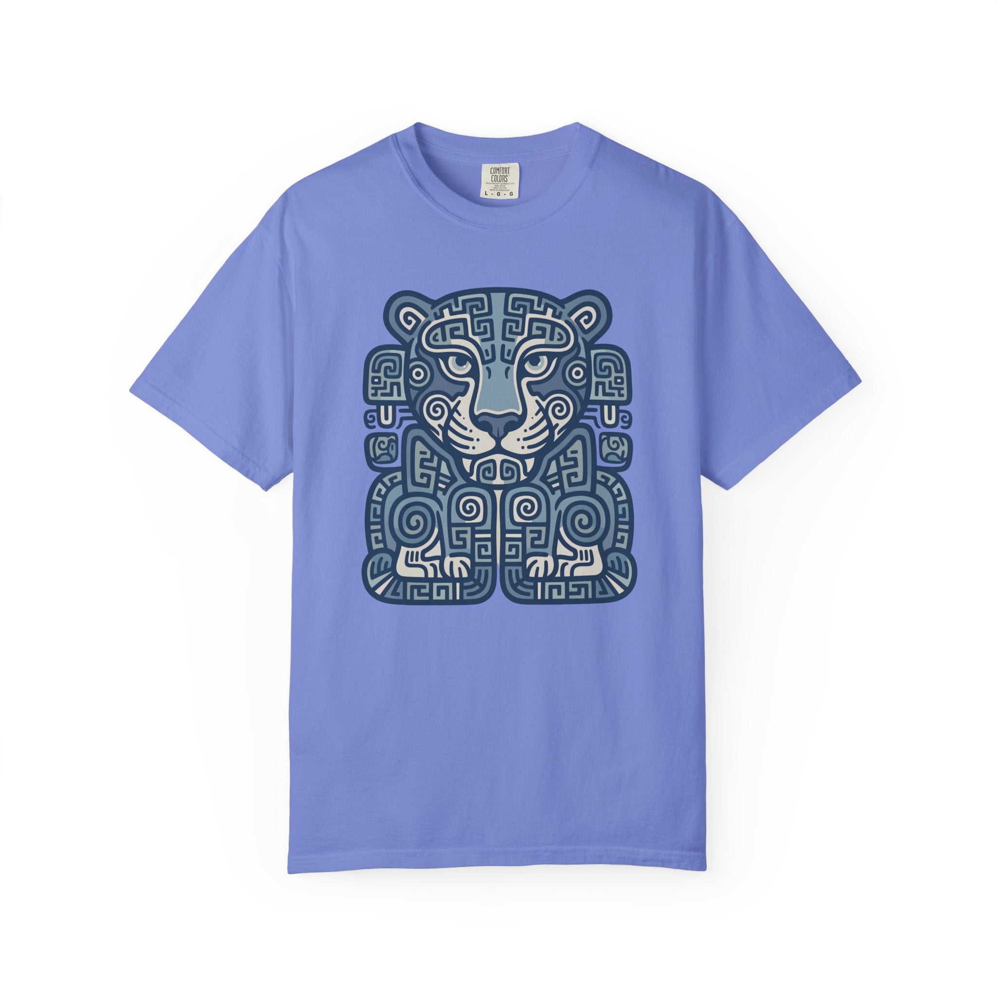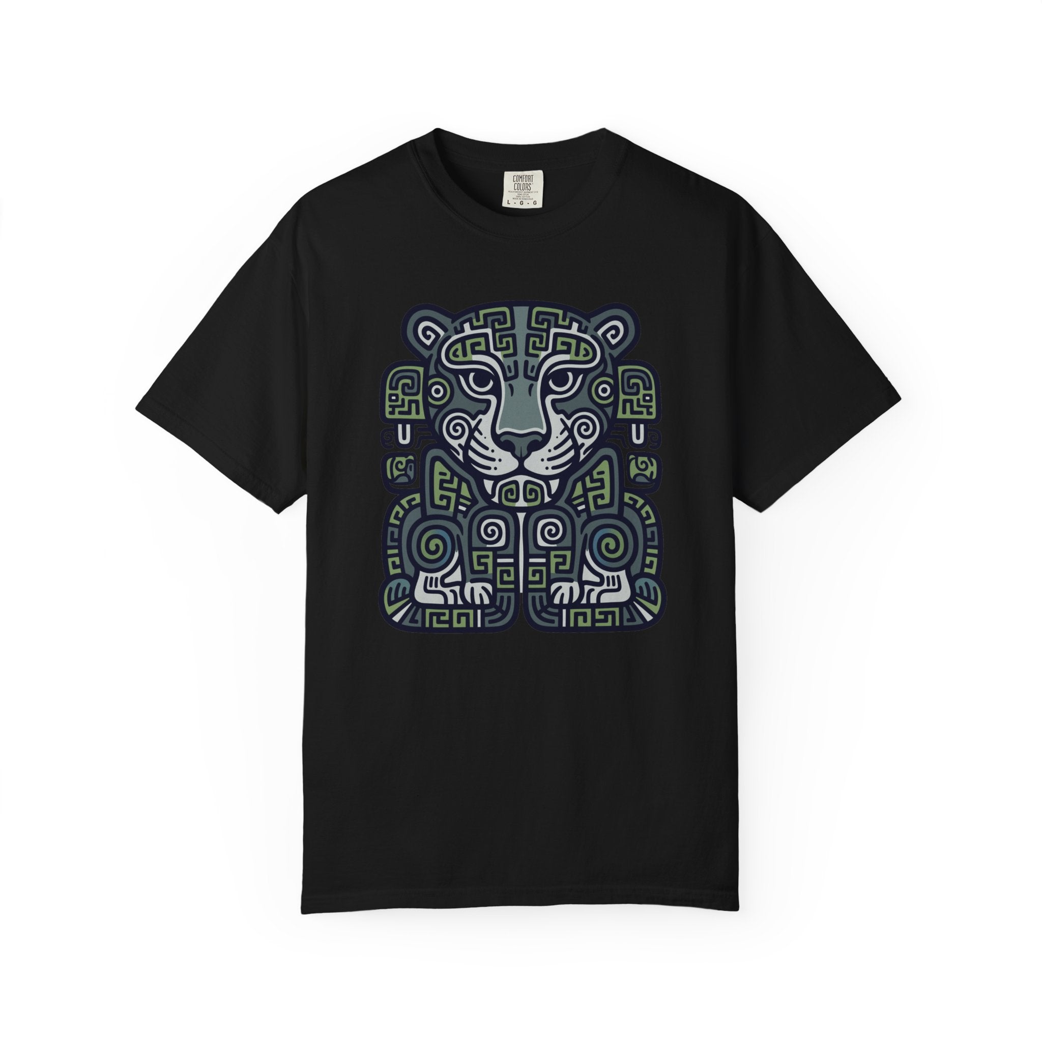 This t-shirt features an intricate, stylized design of a majestic jaguar, rendered in a captivating blend of geometric patterns and ancient tribal motifs. In ancient Mesoamerican cultures, the jaguar was a revered symbol of power, strength, protection, and connection to the spiritual world, often representing rulers, warriors, and the mysteries of the night. This unique graphic is perfect for those who appreciate deep cultural symbolism and striking artistic expression. The design is both bold and mysteriously alluring, making it a compelling conversation starter and a distinctive addition to any collection.