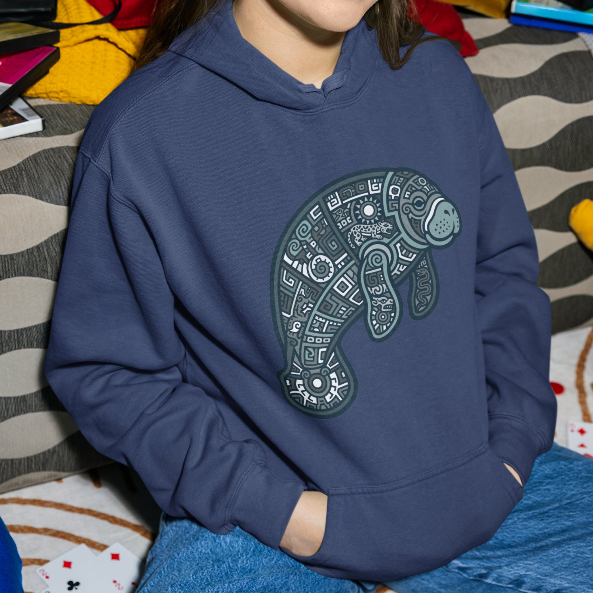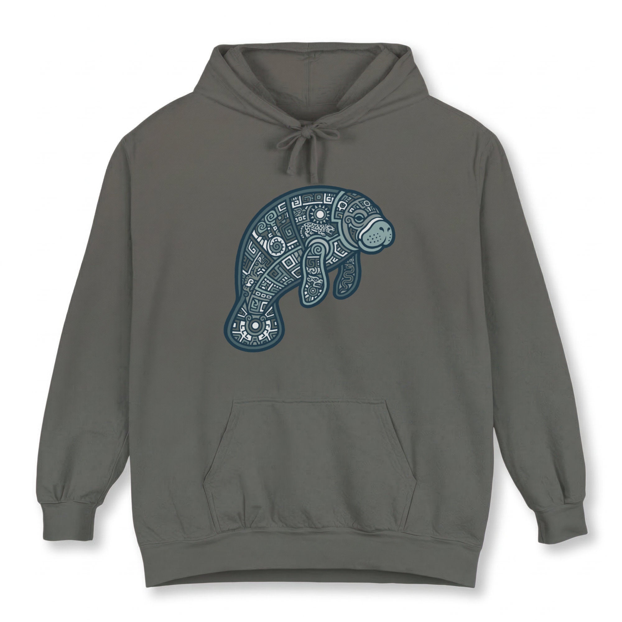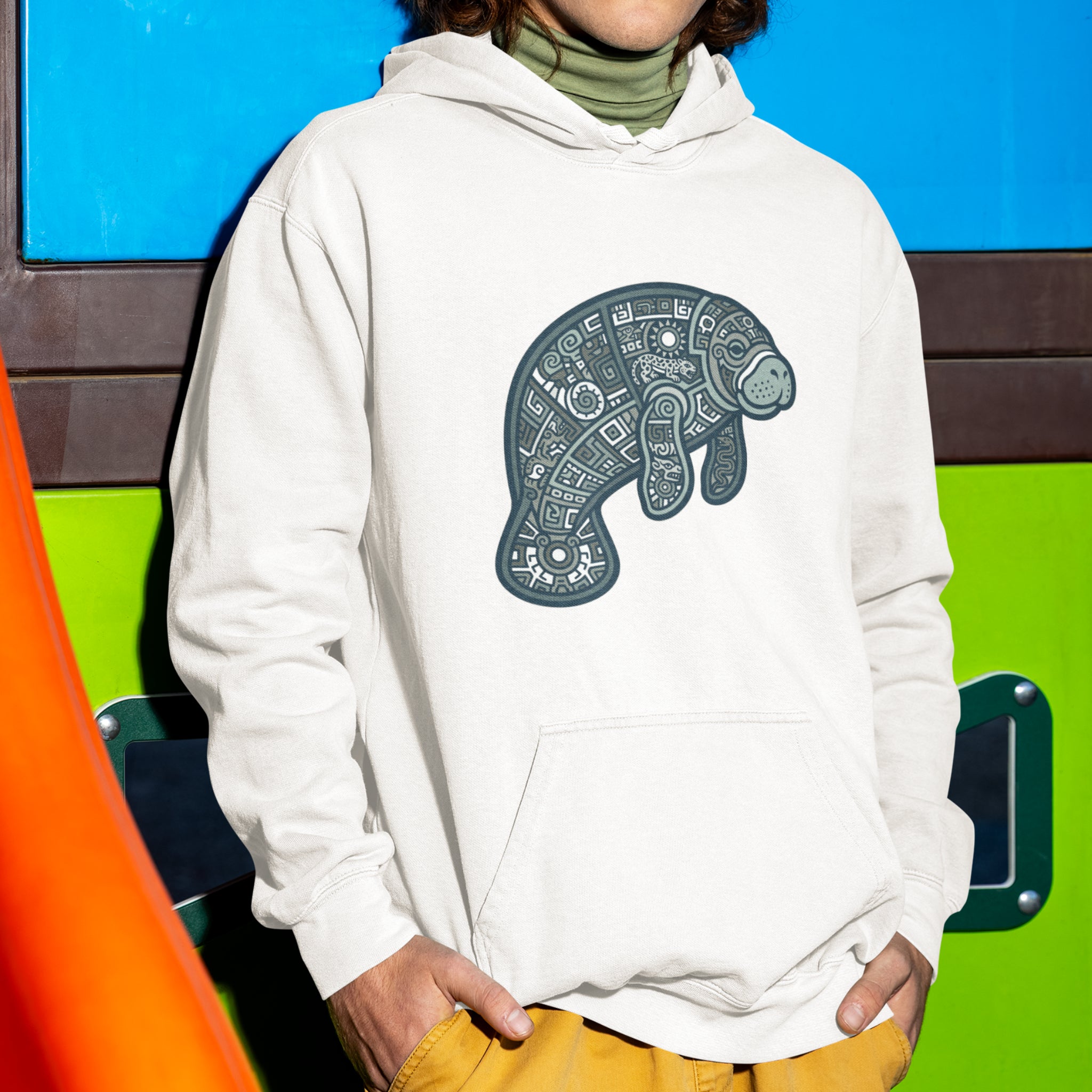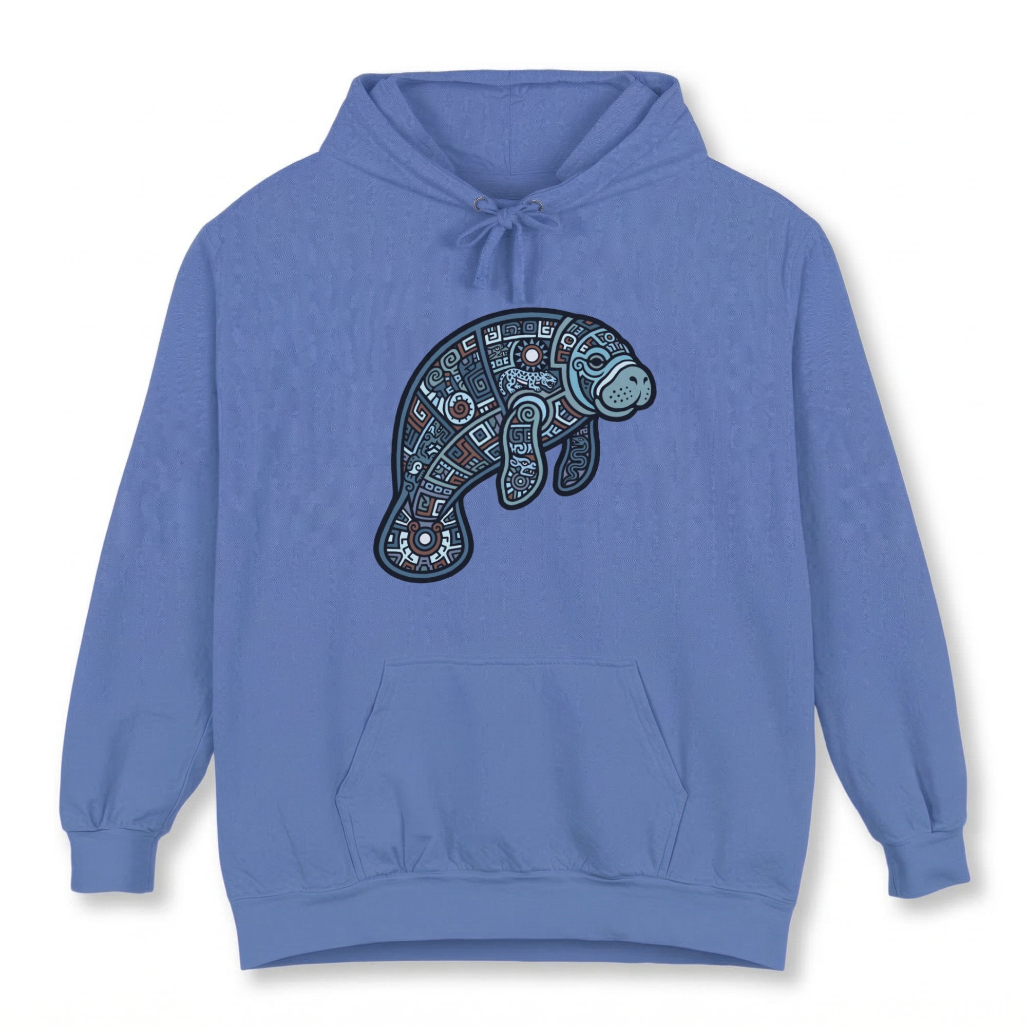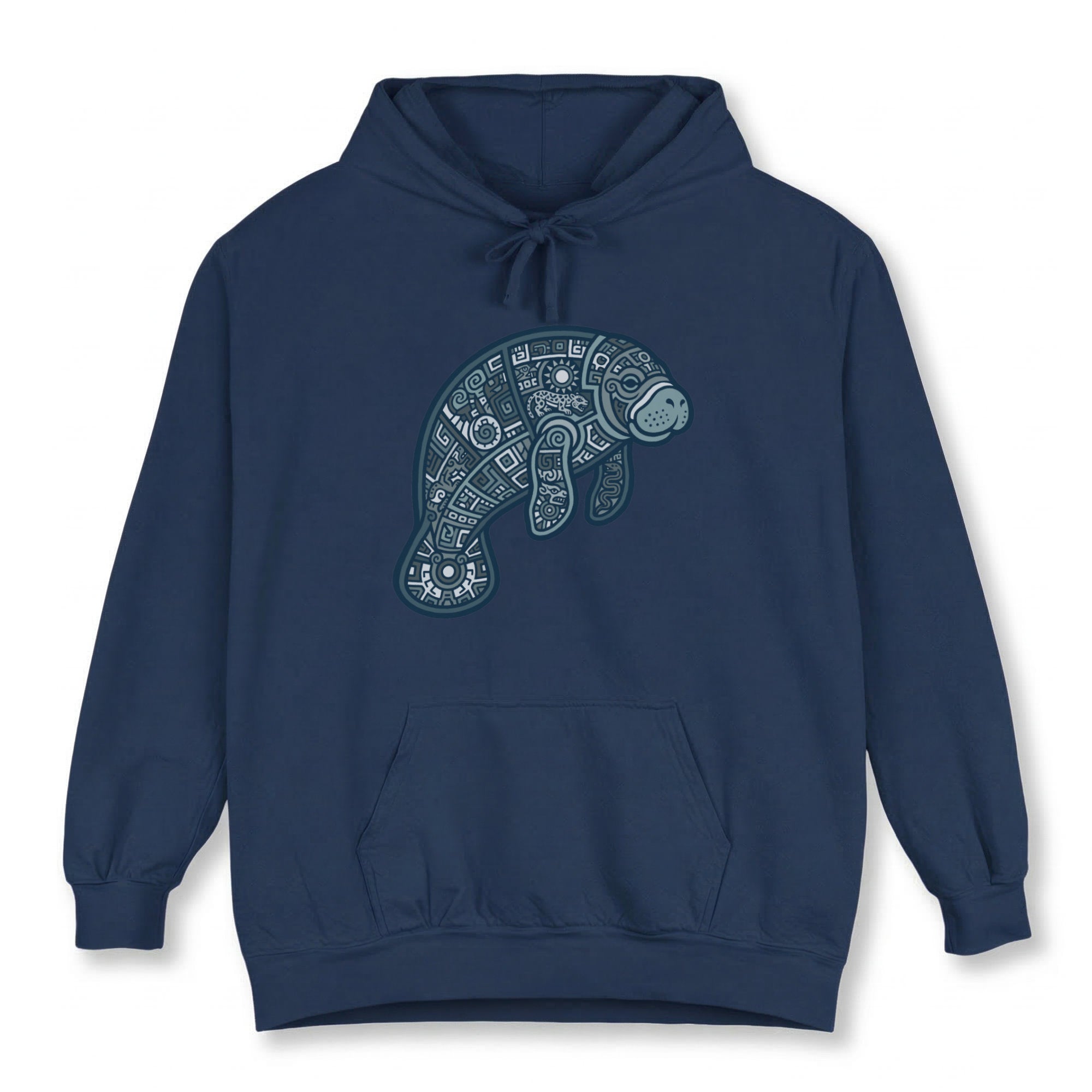 This hoodie features a captivating, intricately stylized design of a manatee, rendered with delicate geometric patterns, swirls, and abstract shapes in soothing shades of blue and white. The manatee, known for its gentle nature, symbolizes peace, tranquility, and a deep connection to the ocean's calm spirit. The elaborate patterns within its form evoke a sense of ancient artistry, cultural depth, and the interconnectedness of nature. This unique graphic is a tribute to marine beauty and artistic craftsmanship, perfect for those who appreciate nature-inspired art and serene symbolism. Its detailed artwork makes it a distinctive and thoughtful addition to any wardrobe.