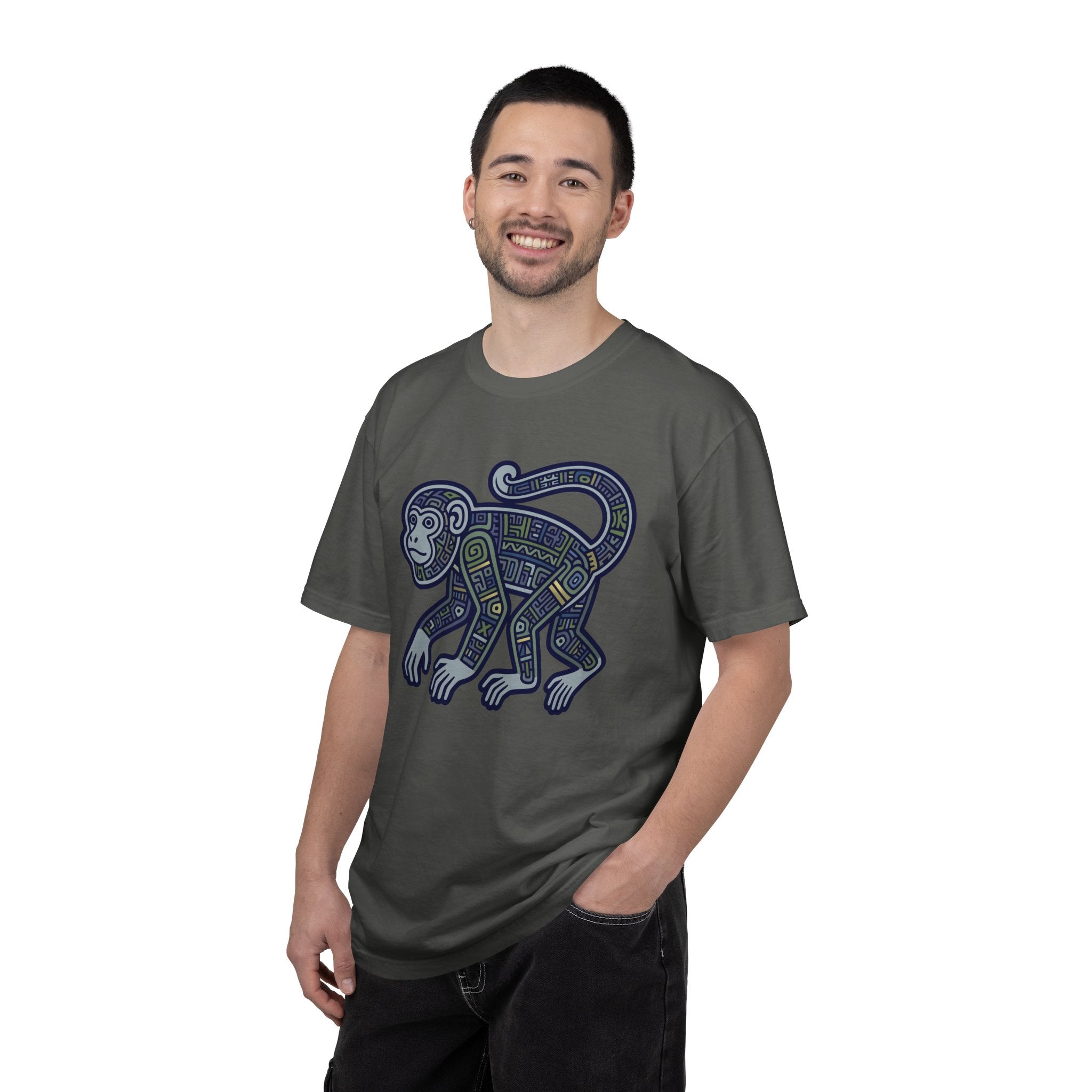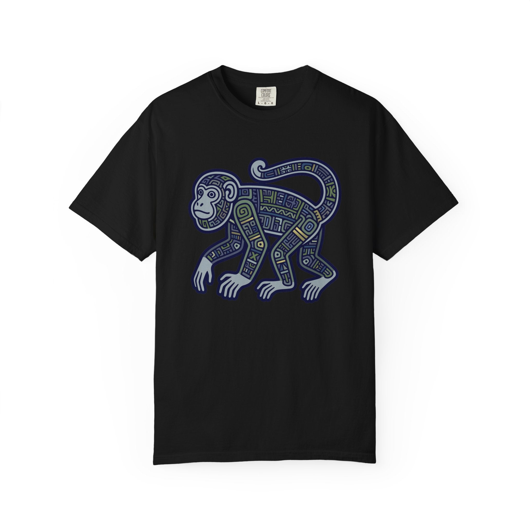 This t-shirt features a captivating design of a monkey, intricately adorned with tribal-inspired geometric patterns. The detailed artwork, rendered in shades of blue, green, and gray with subtle gold accents, evokes ancient artistry and the spirit of the jungle. Monkeys often symbolize intelligence, agility, and playfulness, making this design a tribute to both natural wonder and cultural heritage. The intricate details and unique aesthetic make this graphic a fascinating conversation starter and a distinctive addition to any wardrobe.