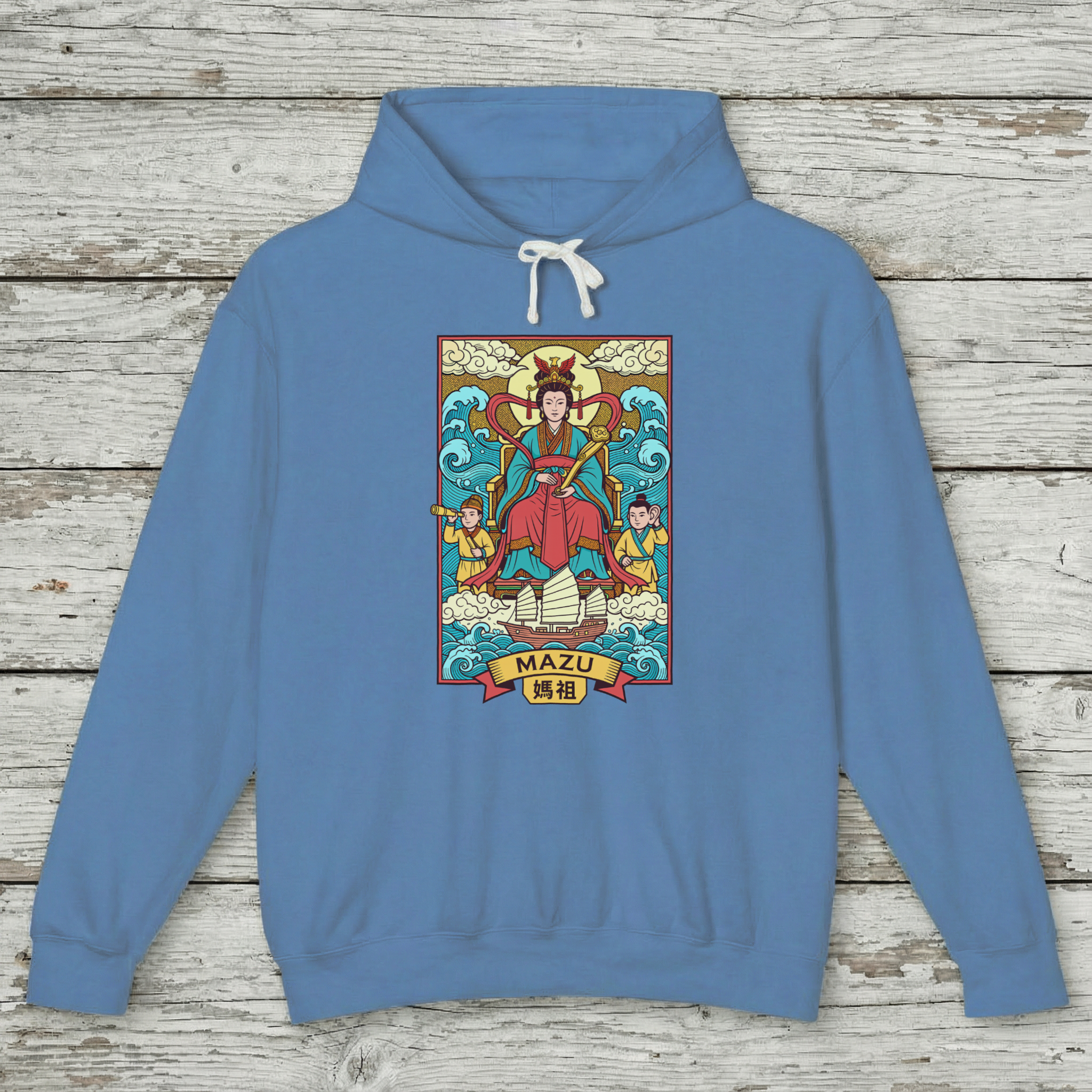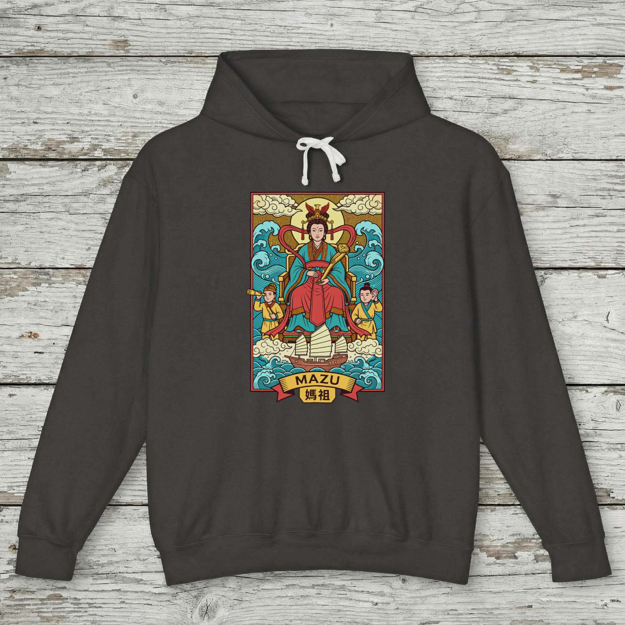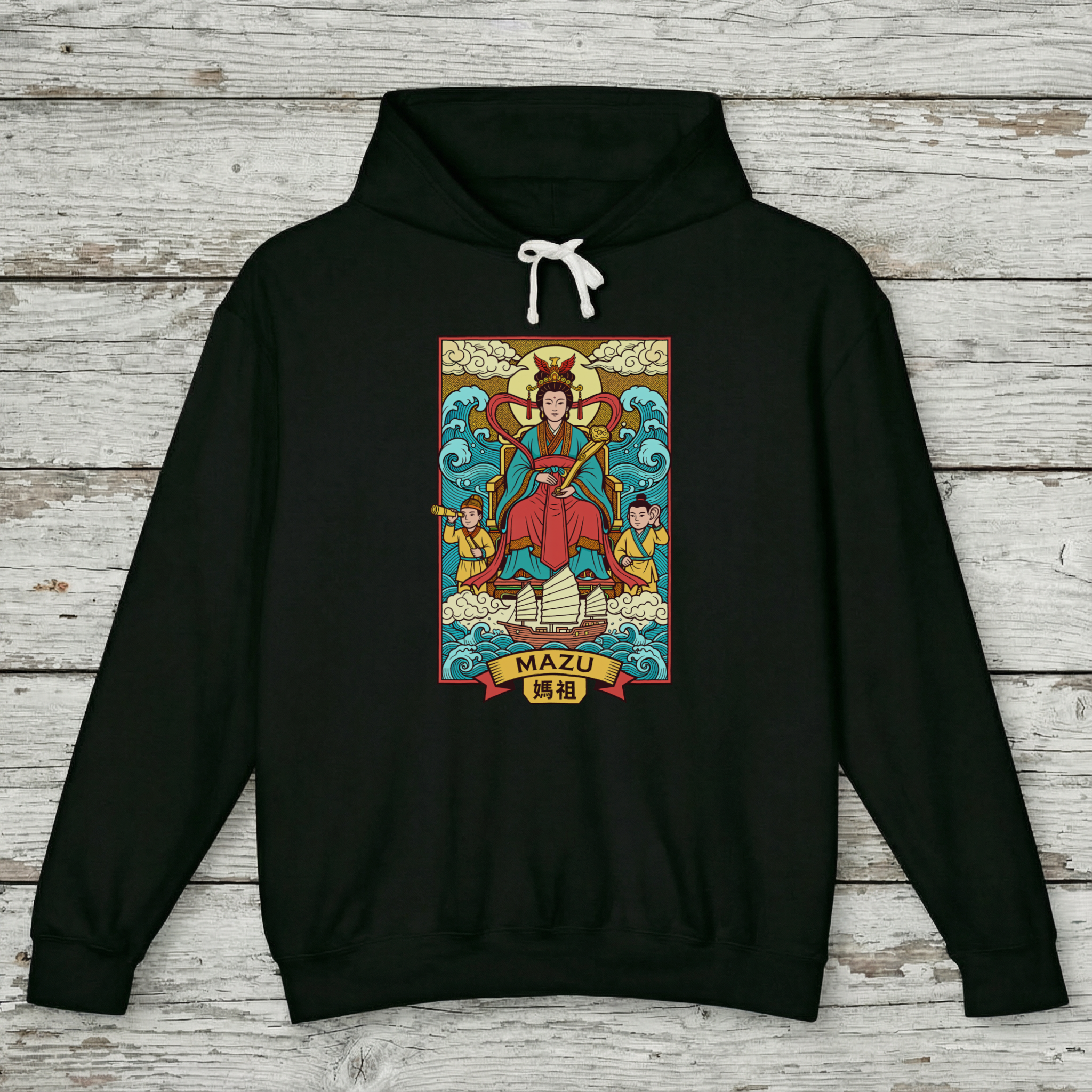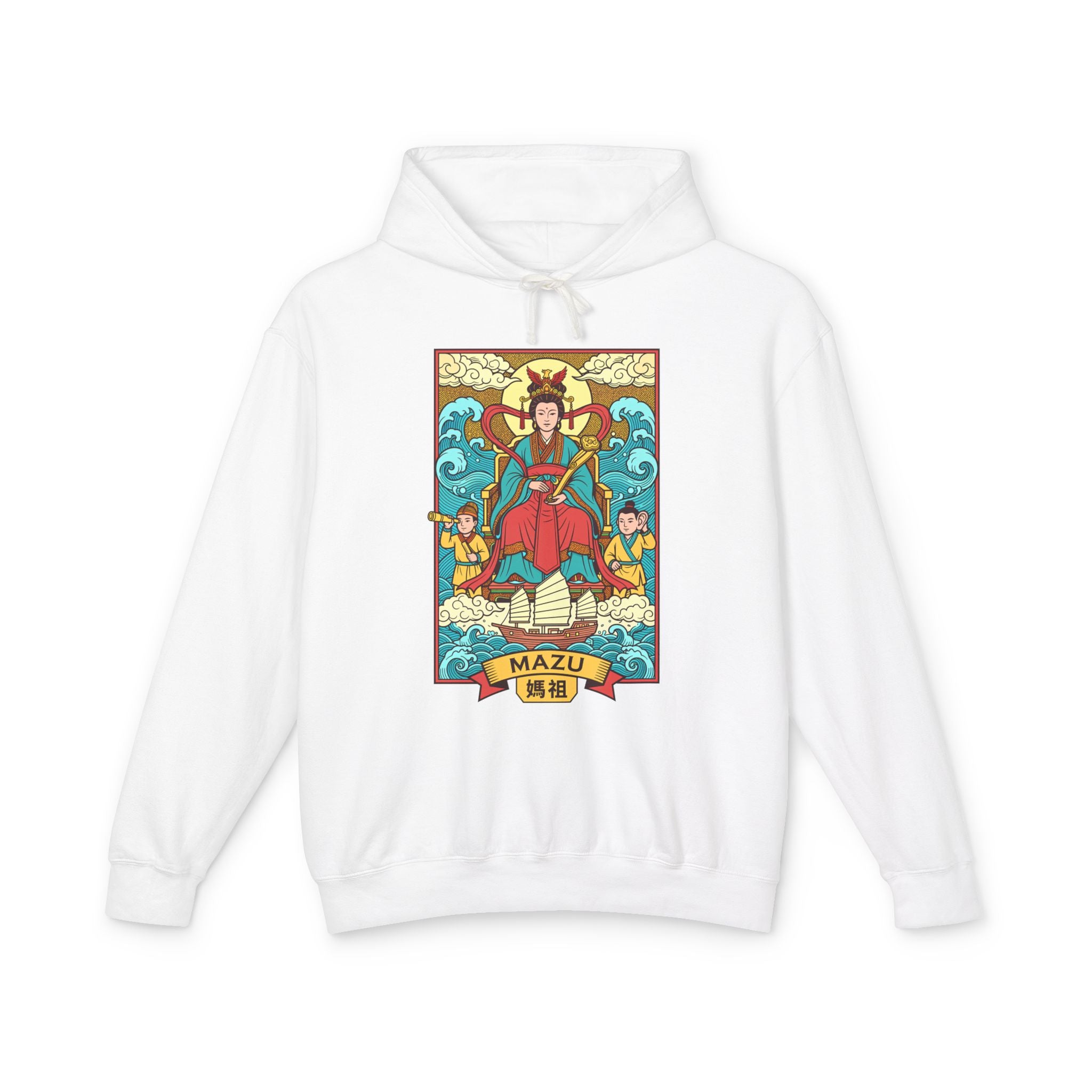This hoodie features a vibrant and intricately detailed depiction of Mazu, the revered Chinese Goddess of the Sea. She is shown majestically seated, surrounded by dynamic ocean waves and a radiant, cloud-filled sky. Flanked by her loyal guardians, Qianliyan (Thousand-Mile Eye) and Shunfeng'er (Favorable-Wind Ear), and with a traditional sailing ship below, the design embodies Mazu's protective spirit over seafarers and her power over the waters. Mazu is worshipped as a guardian of sailors, fishermen, and anyone travelling by sea, offering safe passage and protection from storms. This unique graphic is a celebration of rich cultural mythology and a testament to divine protection, making it a captivating and meaningful piece for any wardrobe.
