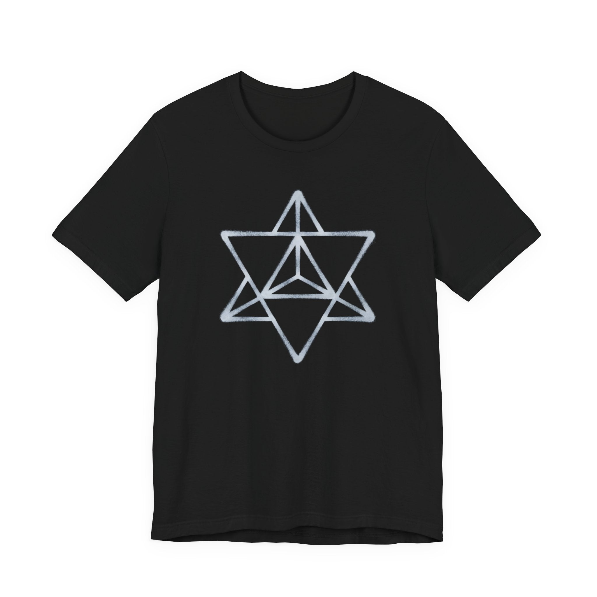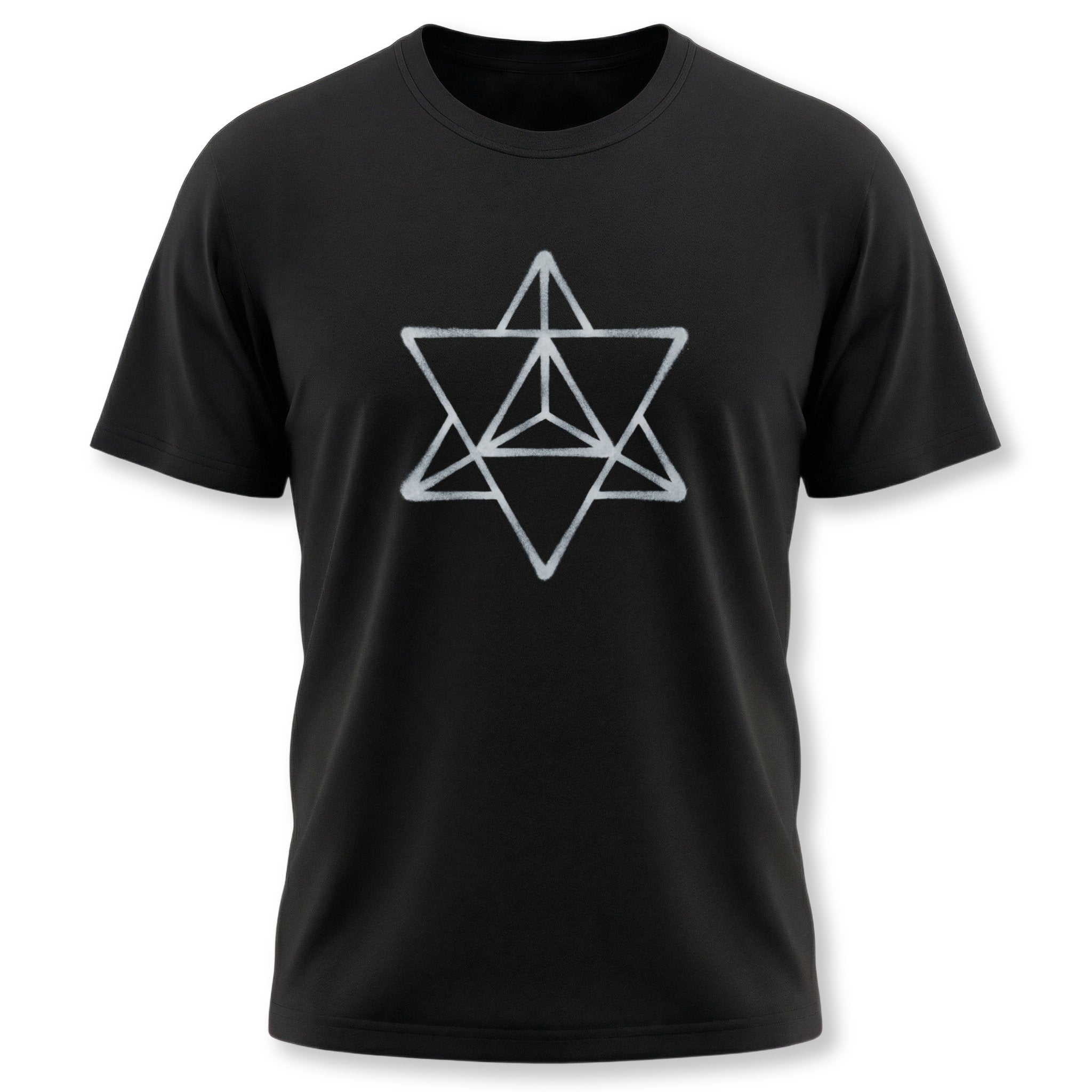 This t-shirt features a striking white outline of the Merkabah star tetrahedron, rendered with a subtle, textured effect that gives it an authentic, hand-drawn feel. The Merkabah, a powerful symbol in sacred geometry, represents divine light, spiritual ascension, and the harmonious union of opposing forces. This unique graphic is perfect for those who are drawn to ancient wisdom, spiritual symbolism, and conscious living. Its clean yet impactful design makes it a thoughtful and eye-catching statement piece.
