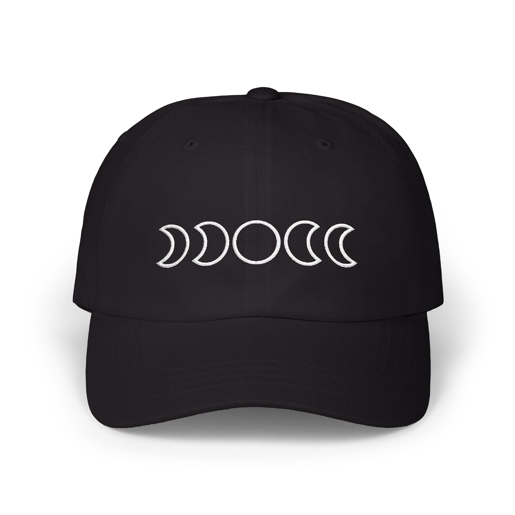This hat features a captivating minimalist white embroidery depicting the celestial journey of the moon through its various phases. From the subtle crescent to the radiant full moon and back, the design beautifully illustrates the continuous cycle of lunar transformation. It's a profound symbol representing the eternal rhythm of nature, change, growth, intuition, and the powerful ebb and flow of life's energies. This unique graphic is perfect for those who appreciate celestial beauty, spiritual symbolism, and the mystical allure of the cosmos, making it a subtle yet profound statement piece for any wardrobe.